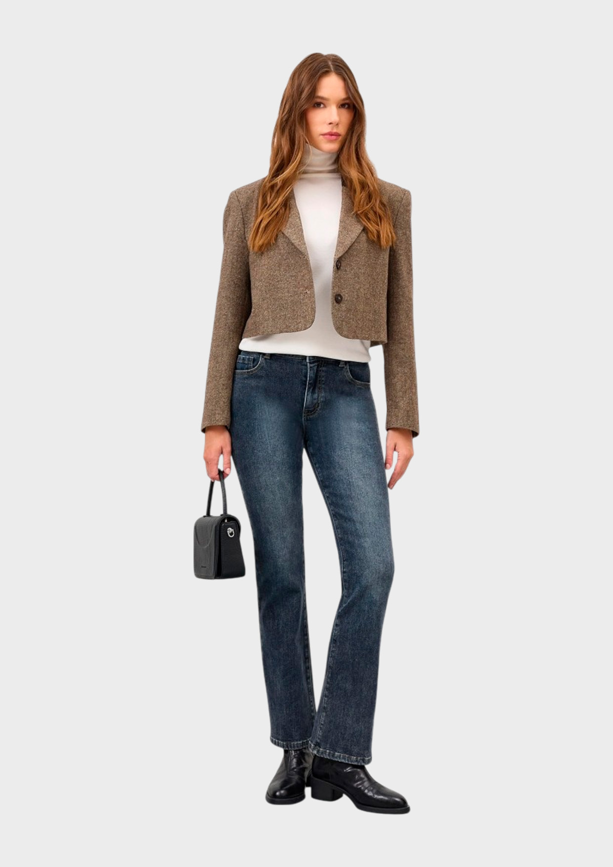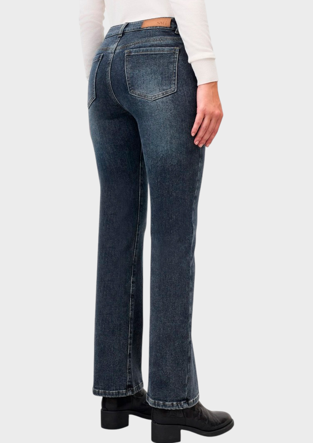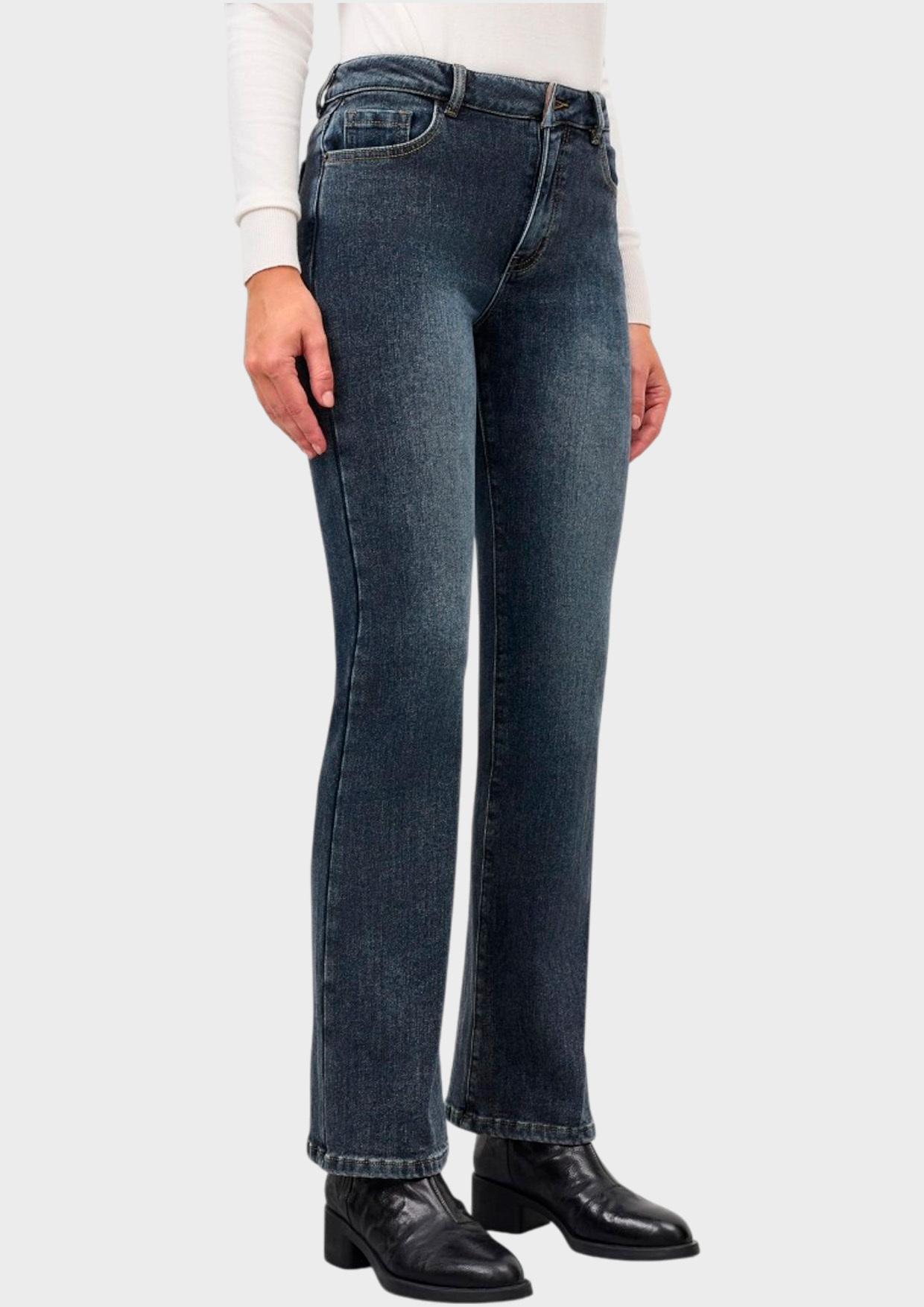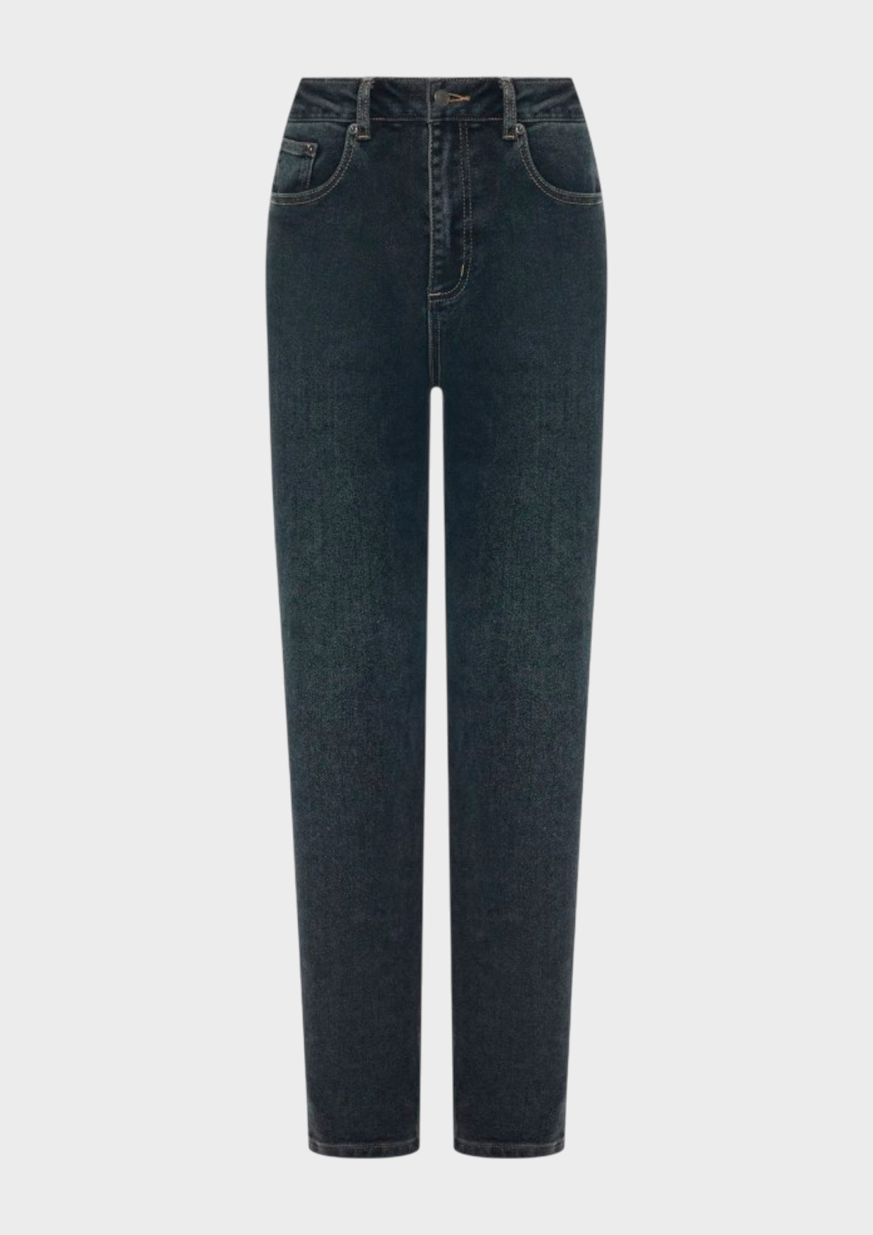 Джинсы из утепленного эластичного денима с деликатной варкой. Прямой силуэт заужен к низу. Застежка на молнию и металлическую пуговицу. Пять карманов. В составе спандекс.
