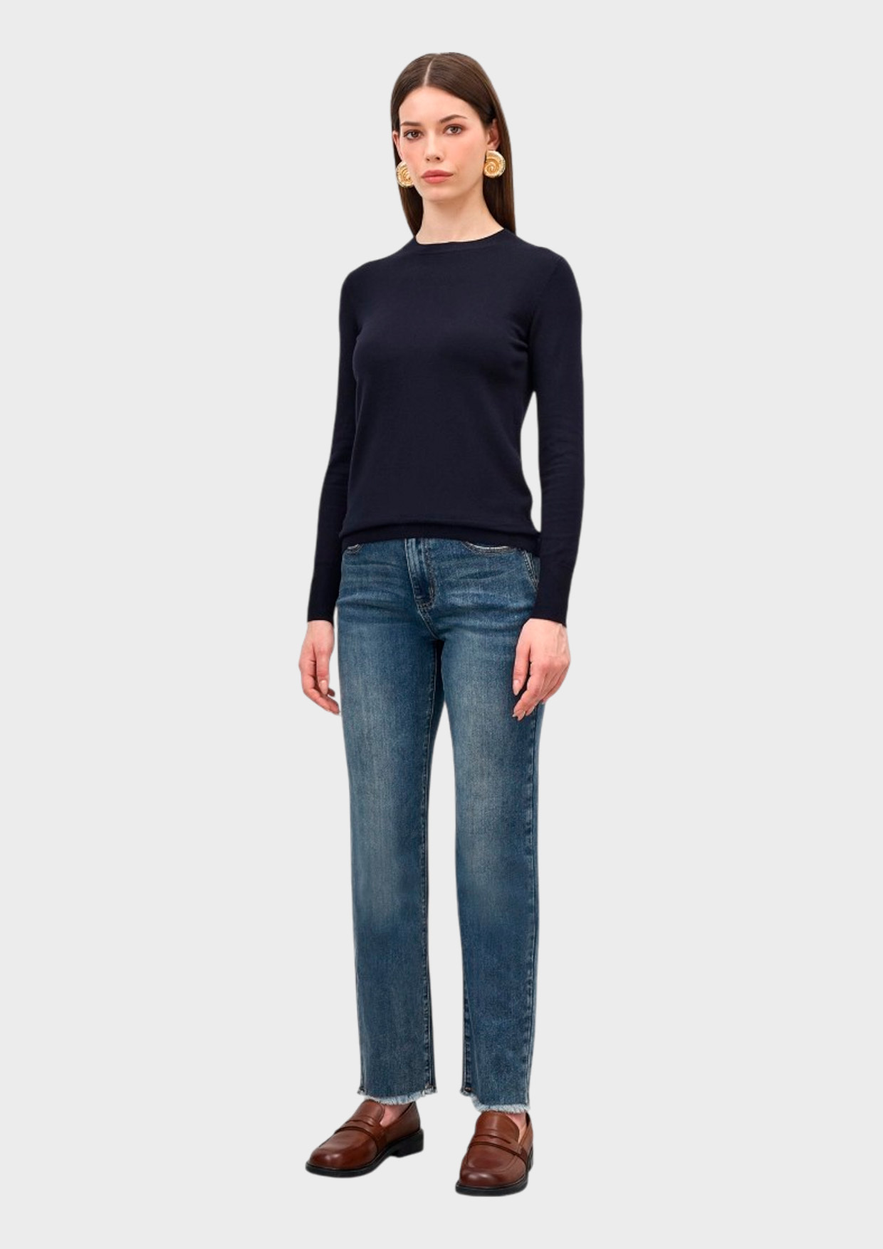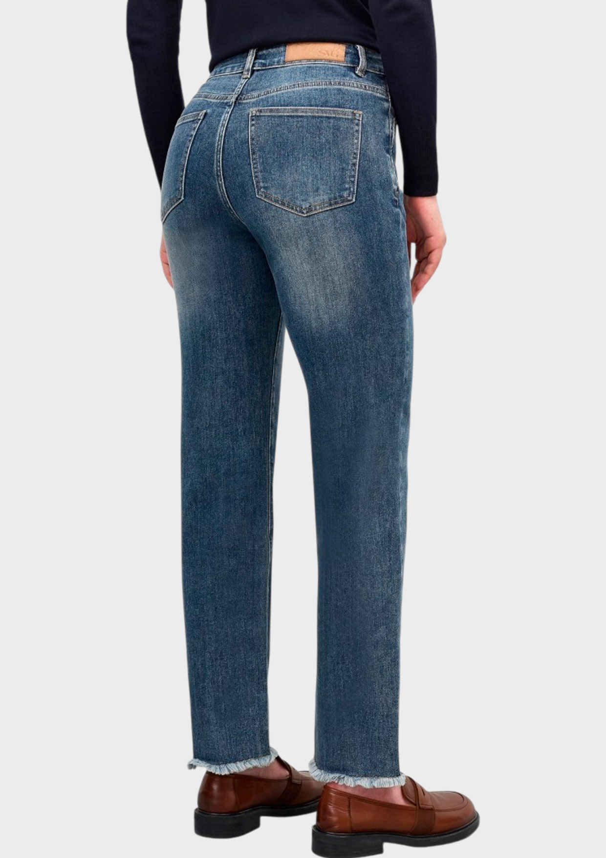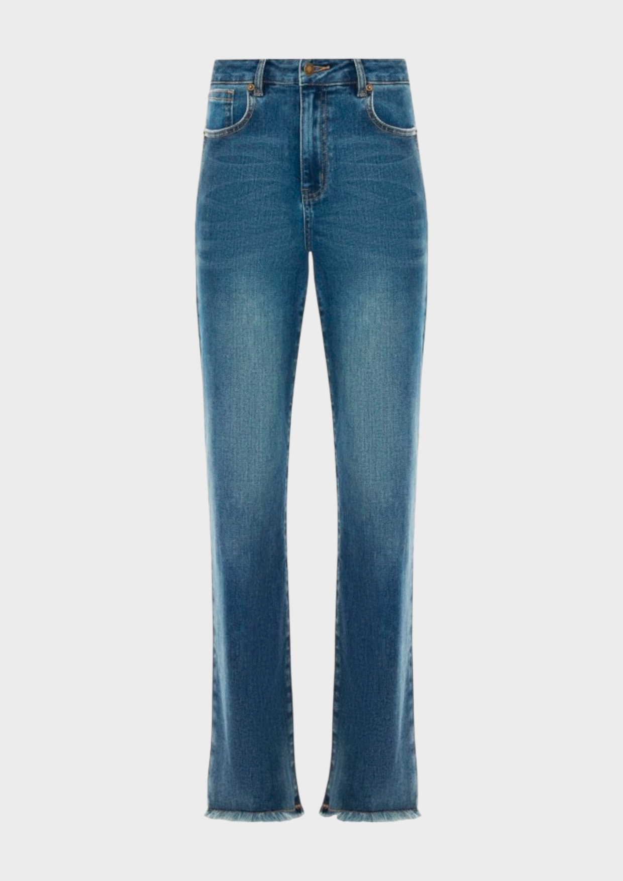 Джинсы с деликатной варкой и бахромой. Прямой силуэт заужен к низу. Застежка на молнию и металлическую пуговицу. Пять карманов. Вход в боковые карманы в швах. В составе спандекс.