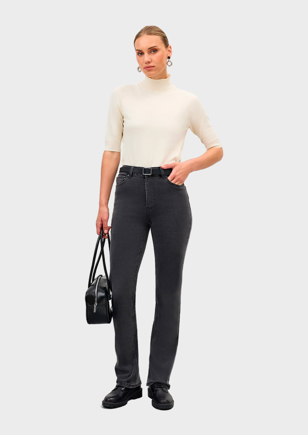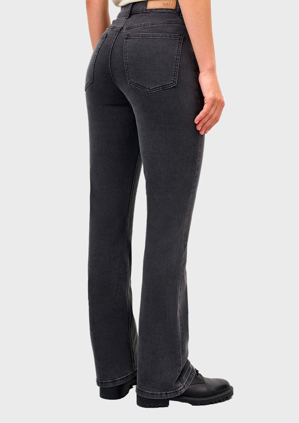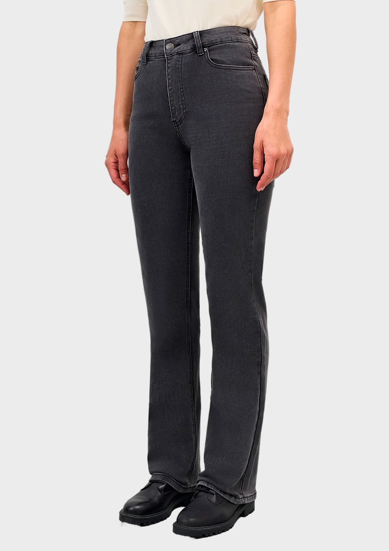 Джинсы bootcut из эластичного денима в трендовом графитовом цвете. Застежка на молнию и металлическую пуговицу. Пять карманов. Акцент на задних карманах. В составе спандекс.