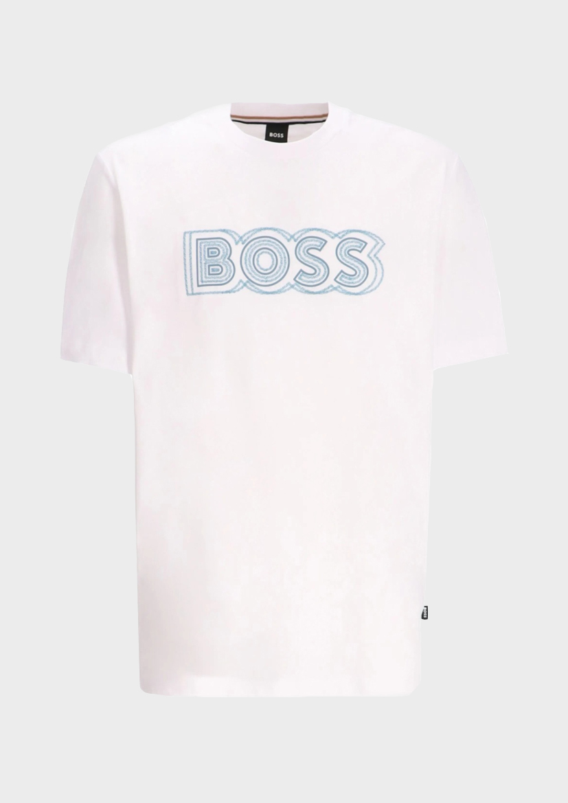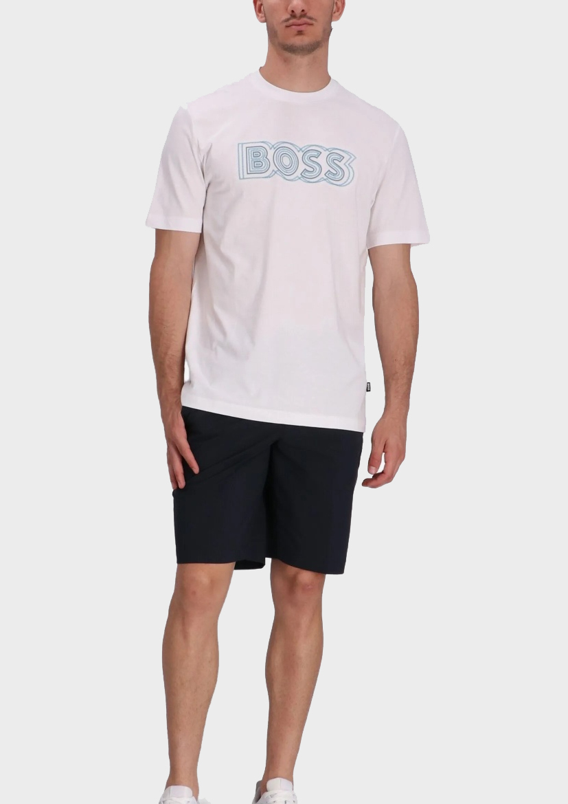 Хлопковая футболка с логотипом BOSS на передней части, круглый вырез, короткие рукава и прямой низ.