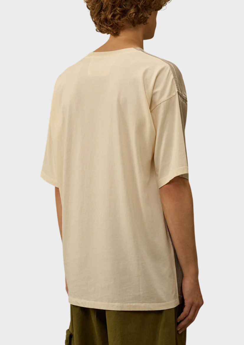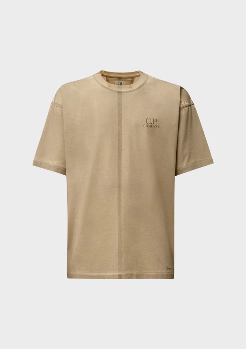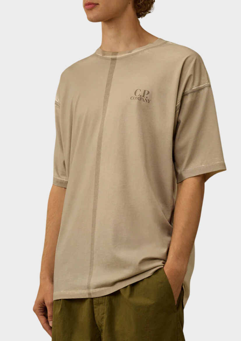 Бежевая хлопковая футболка с короткими рукавами, круглым вырезом и аккуратной деталью с логотипом на груди.