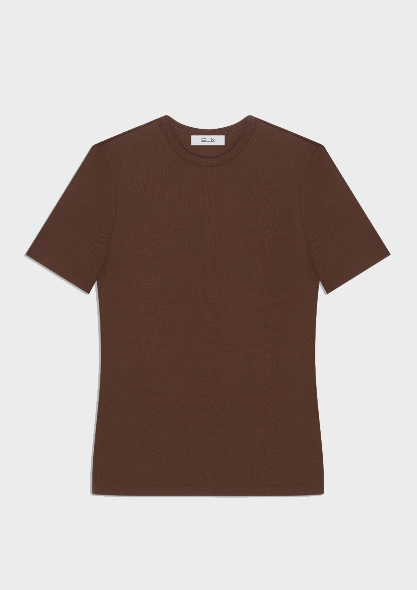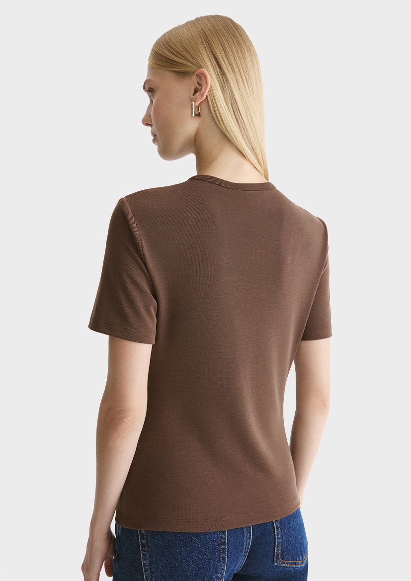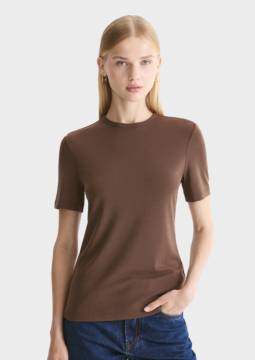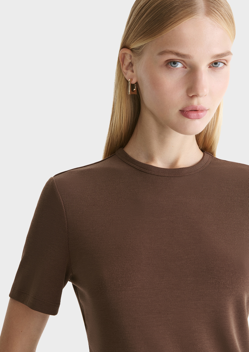Облегающая футболка с круглым вырезом и отделкой горловины бейкой - актуальный участник базового гардероба в благородном коричневом оттенке.