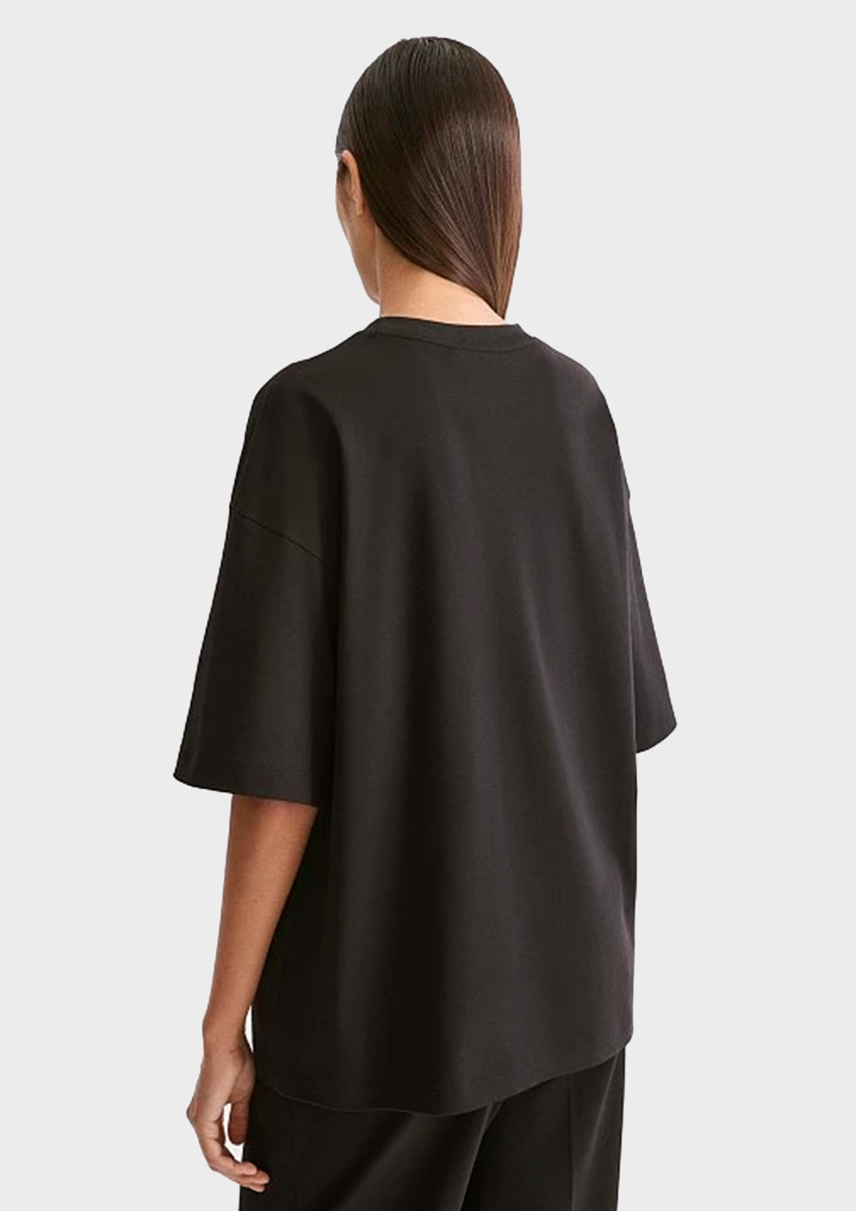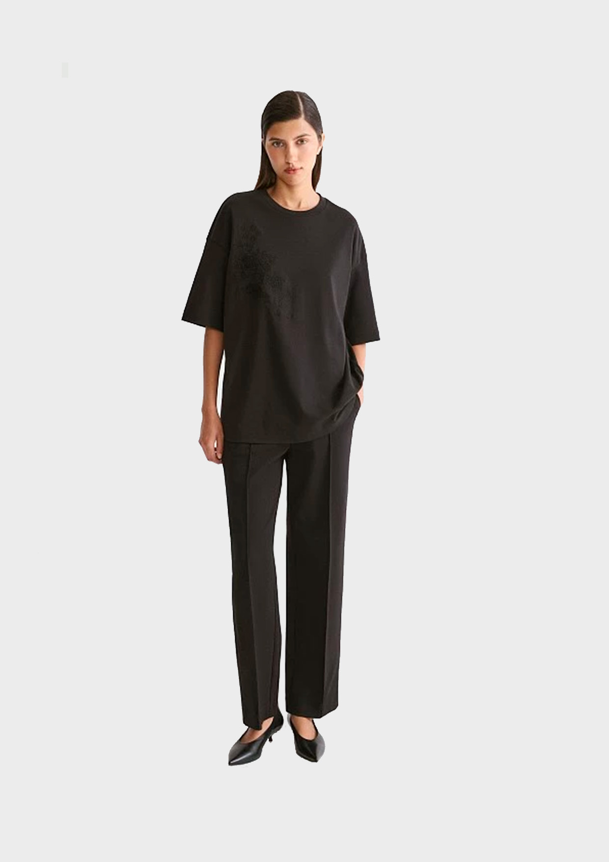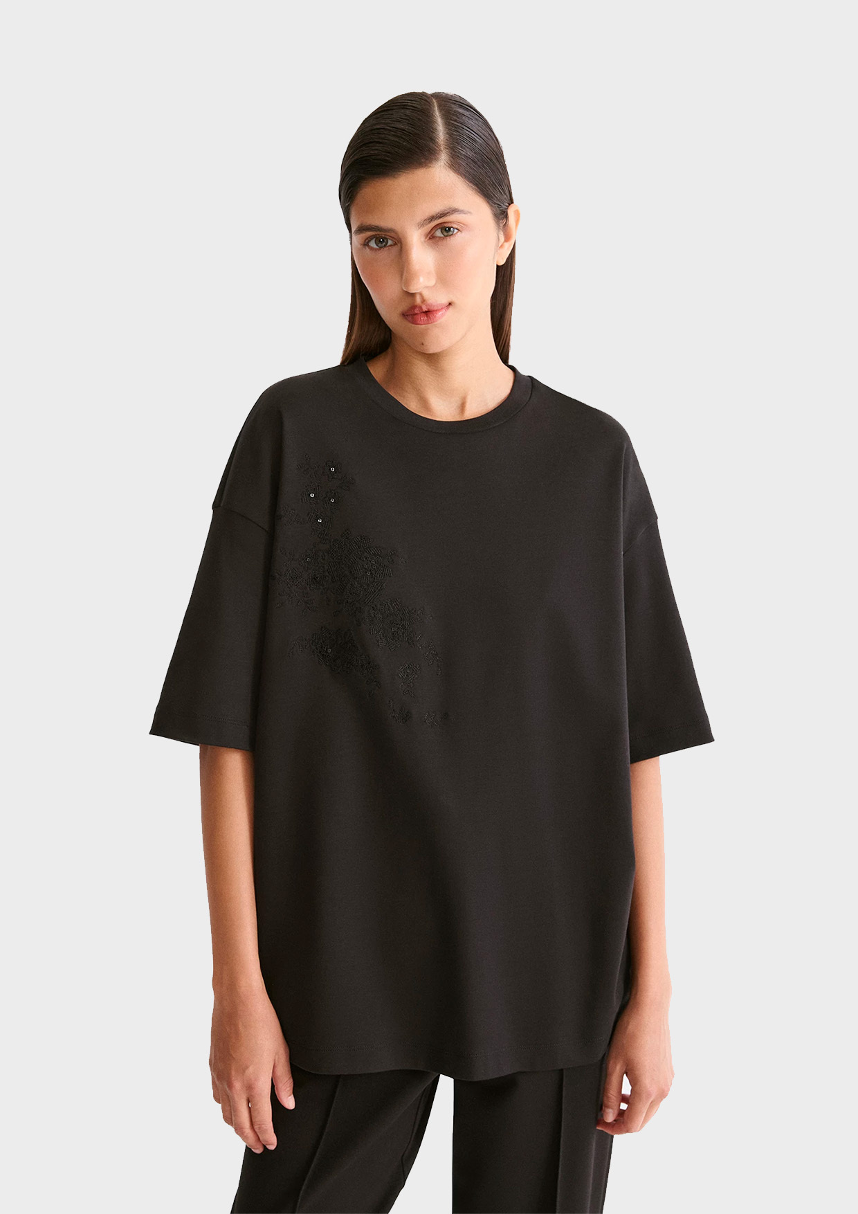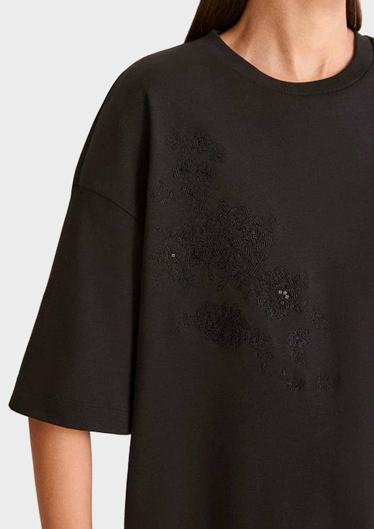 Черная хлопковая футболка с вышивкой - универсальна, сочетает комфорт и презентабельность. Ее непринужденный силуэт создан свободным кроем со спущенным плечом.
