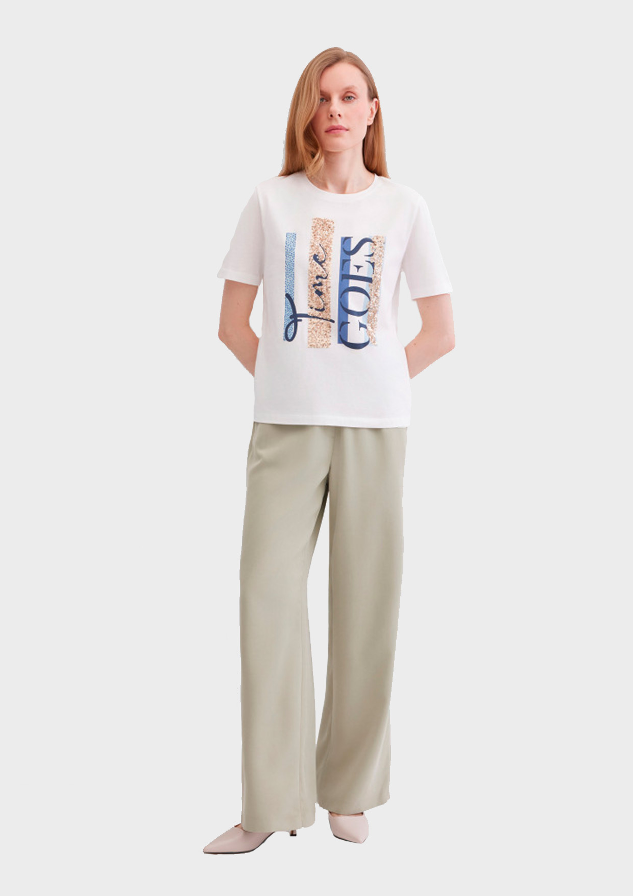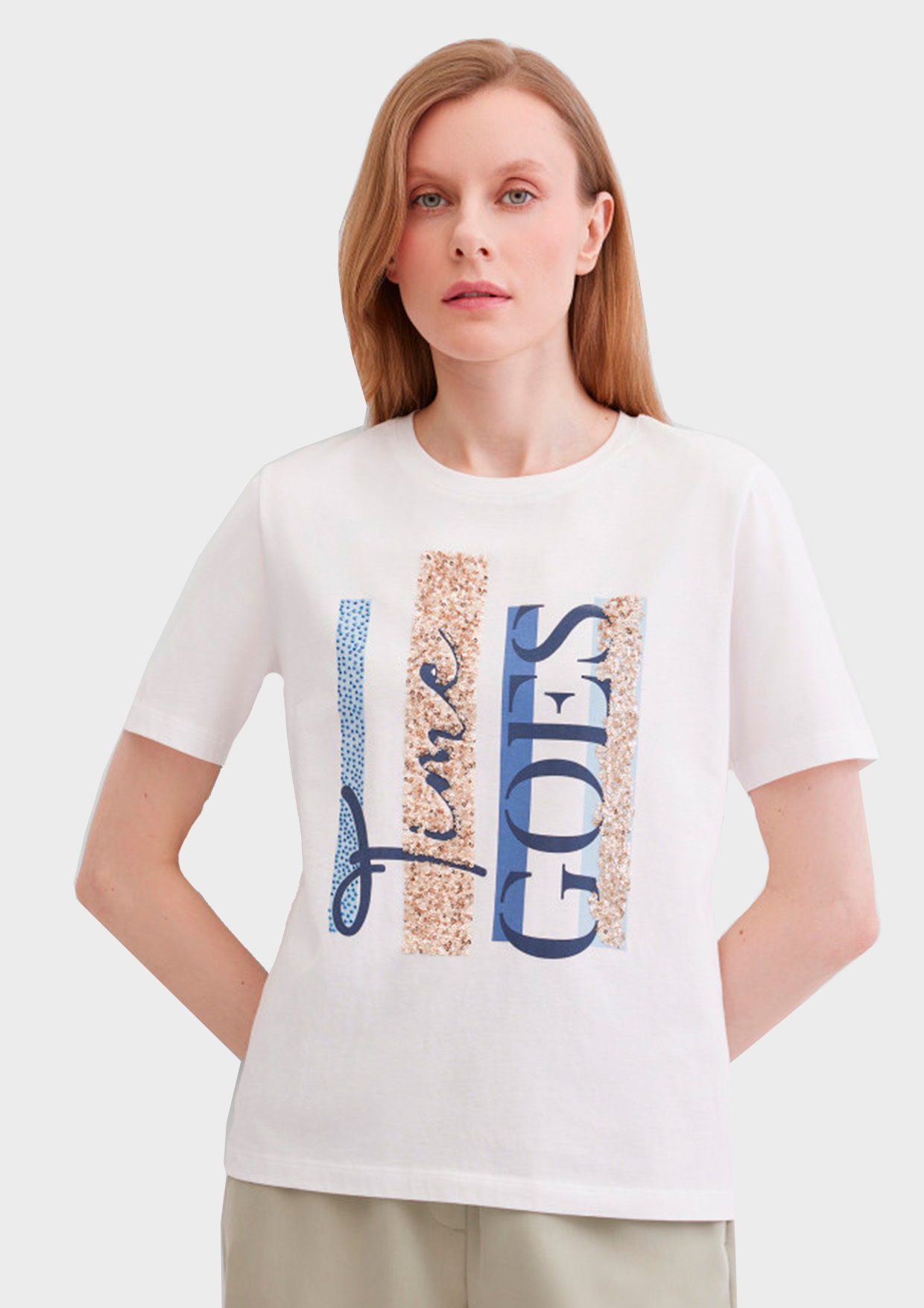 Футболка с округлым вырезом и короткими рукавами выделяется выразительным вертикальным принтом с эффектом коллажа. Пайетки добавляют визуальный акцент и лёгкое сияние. Прямой силуэт и лаконичная форма создают сбалансированный образ, а графика делает модель яркой деталью повседневного гардероба.