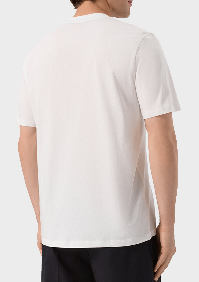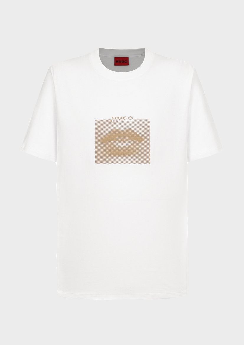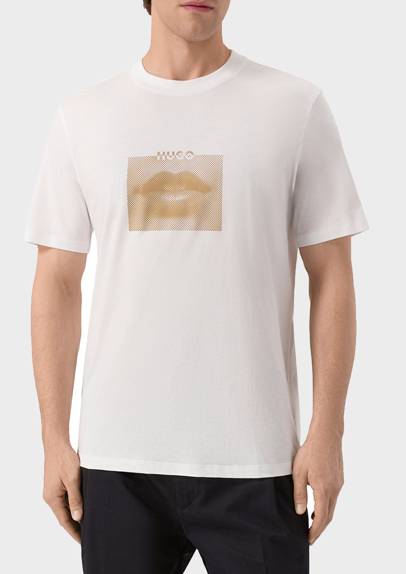 Футболку Deterni прямого кроя сшили из хлопкового джерси. Эластичную модель с круглым вырезом украсили спереди фотопринтом с логотипом марки.