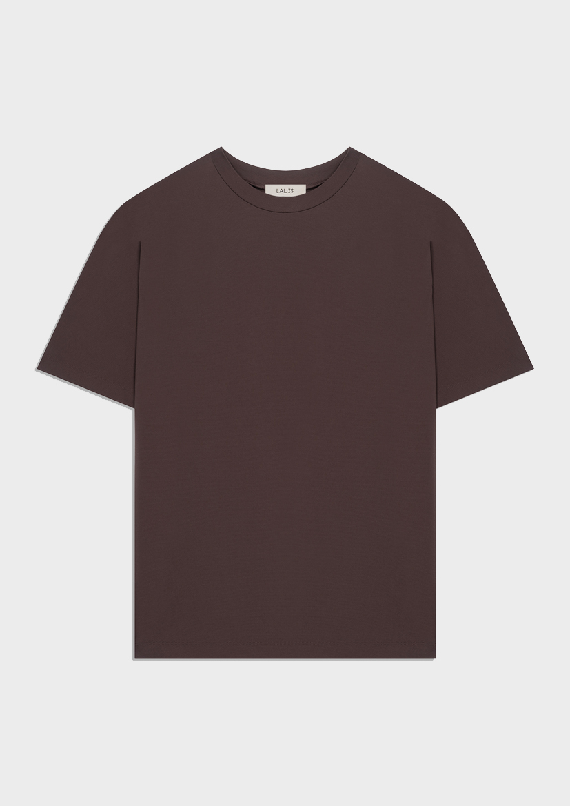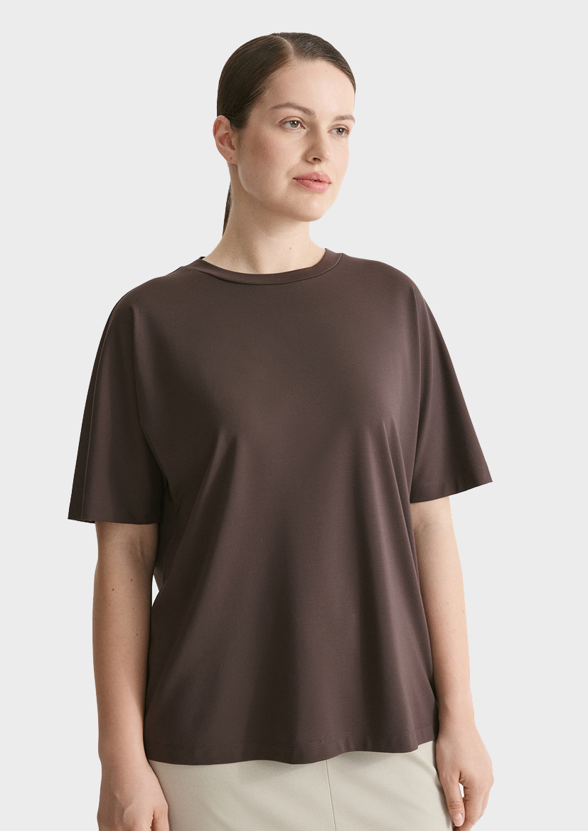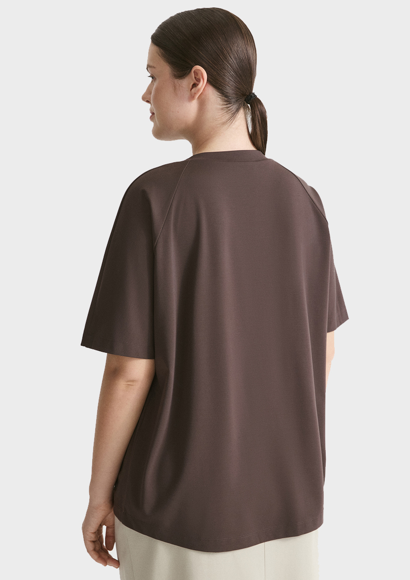 Футболка в благородном оттенке "коричневая печать" будет прекрасным дополнением к джинсам и брюкам из коллекции, а также под пиджак