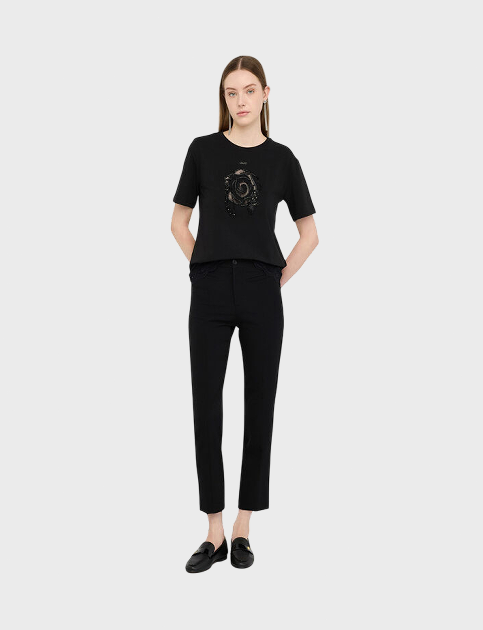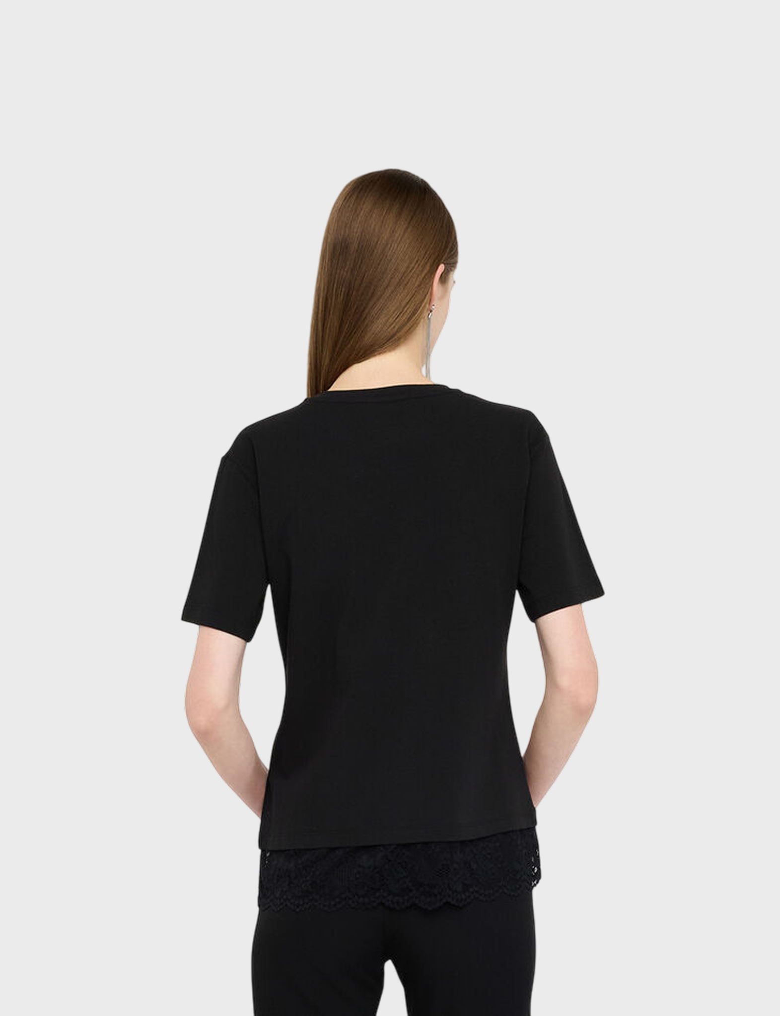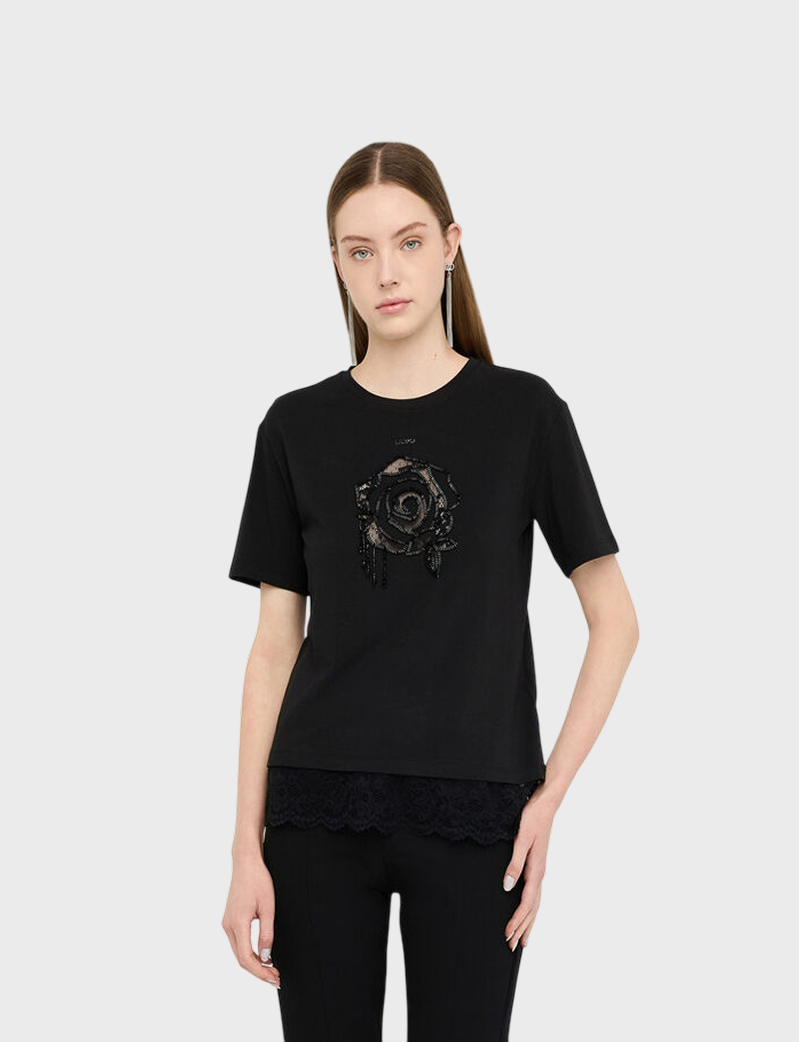 Черная футболка Liu Jo из мягкого хлопка (95%) с добавлением эластана (5%), идеально подчеркивает фигуру и дарит комфорт весь день! Идеальный базовый элемент гардероба женщины, который легко сочетается с джинсами, юбками и жакетами – незаменимая вещь в любом гардеробе.