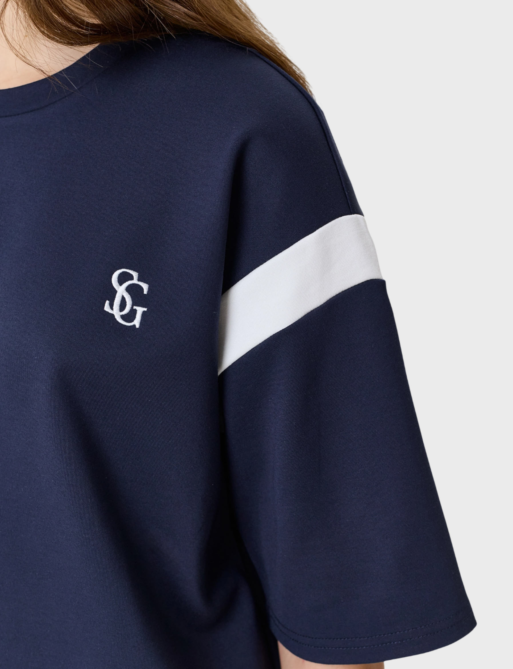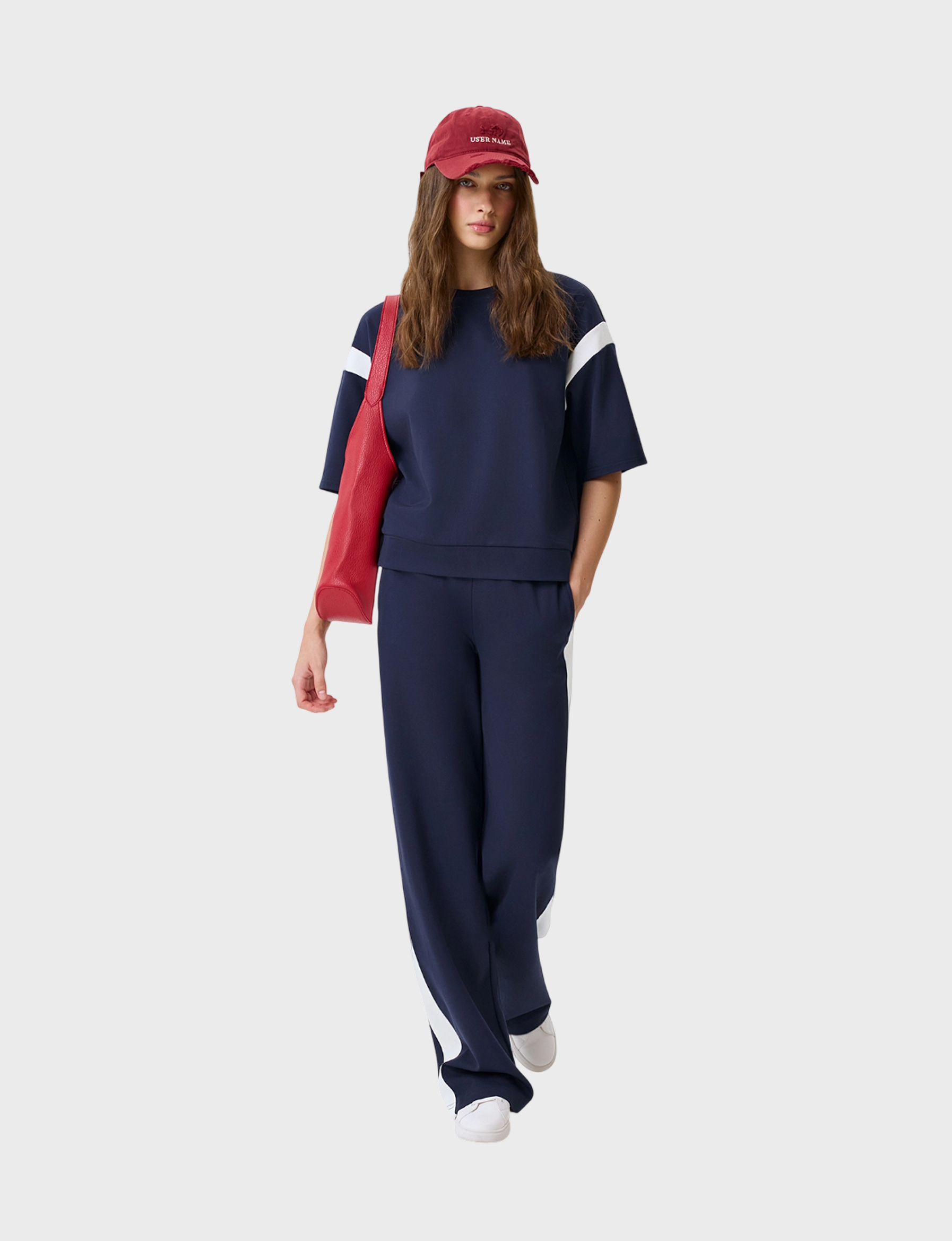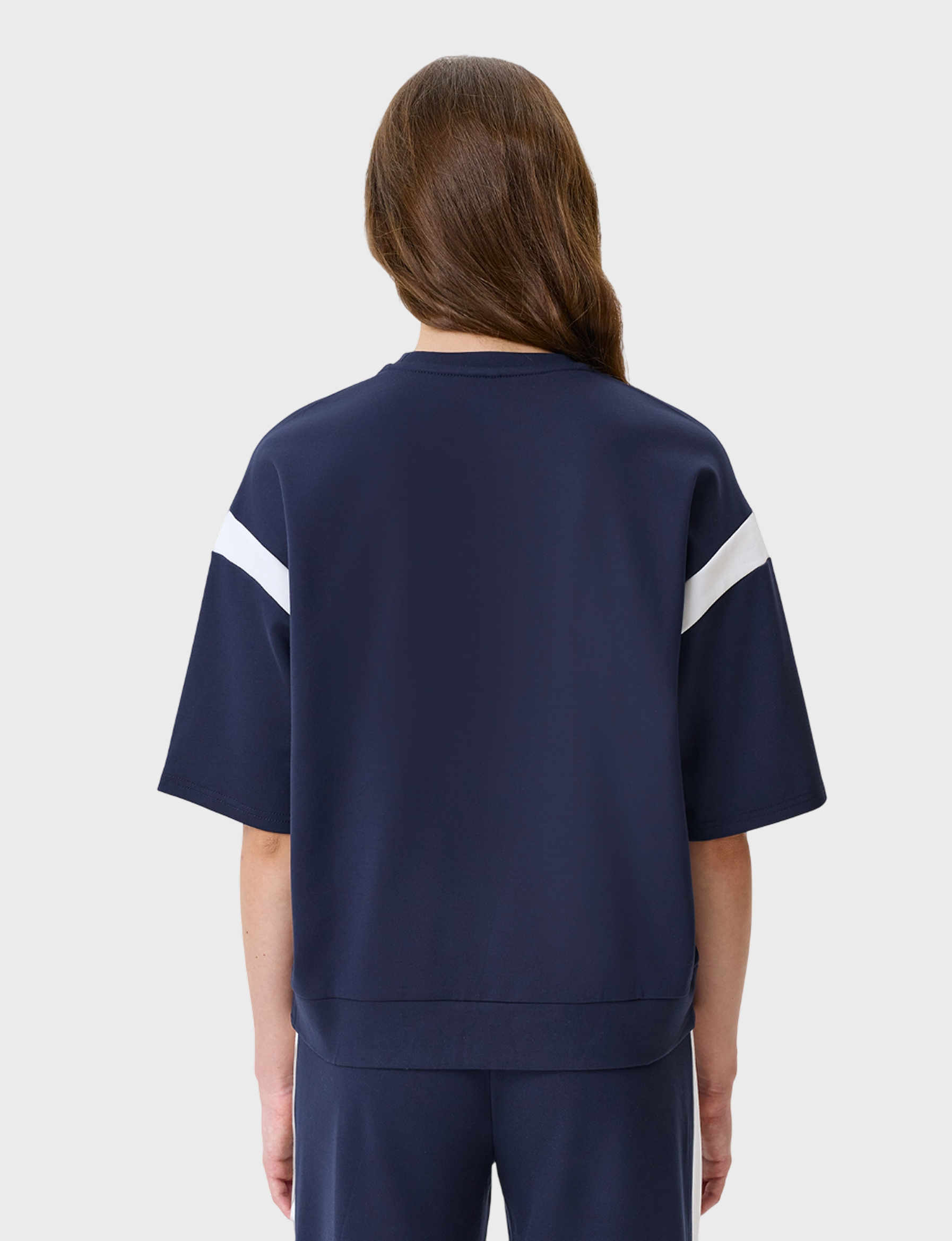 Футболка с контрастными вставками и вышивкой. Свободный силуэт. Круглый вырез. Спущенная линия плеч. Укороченные широкие рукава. Риб по горловине и низу изделия. В составе вискоза и нейлон.