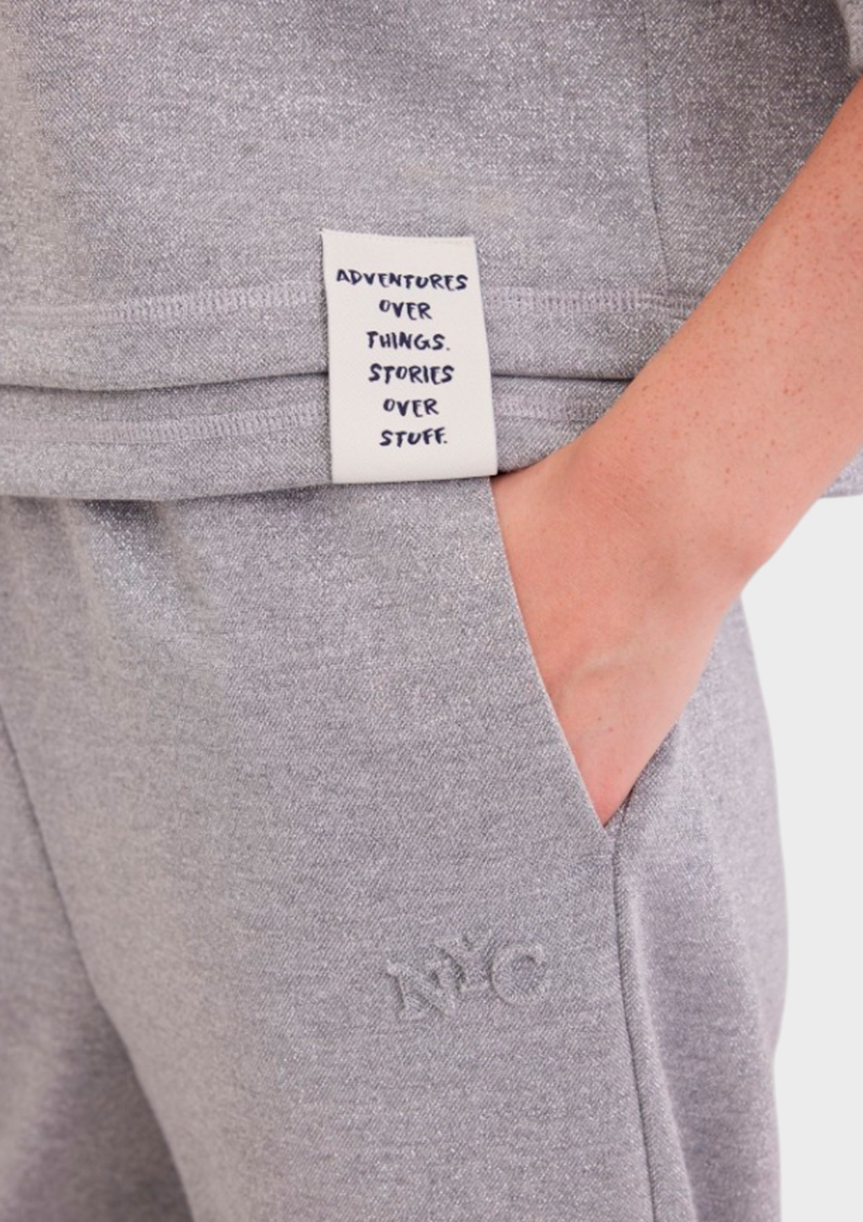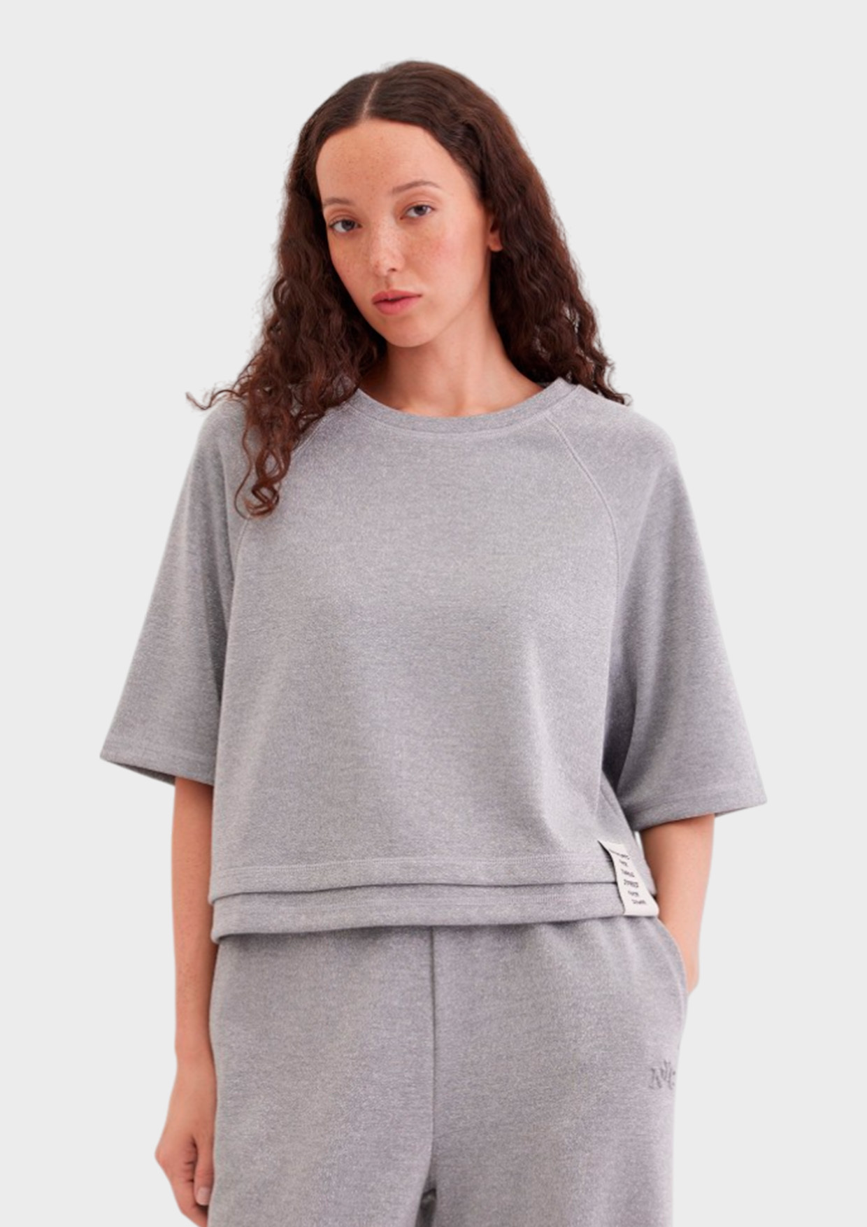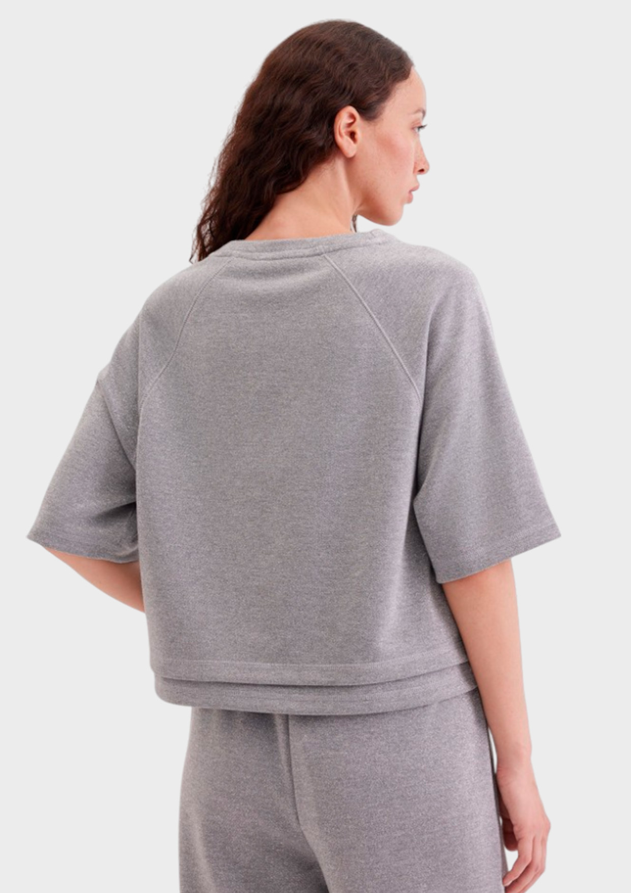Широкая прямая футболка укороченного кроя из мягкой смесовой вискозы с добавлением люрекса, с коротким рукавом реглан, круглым вырезом, двойным краем по низу и нашивкой сбоку.