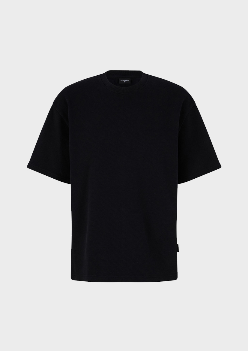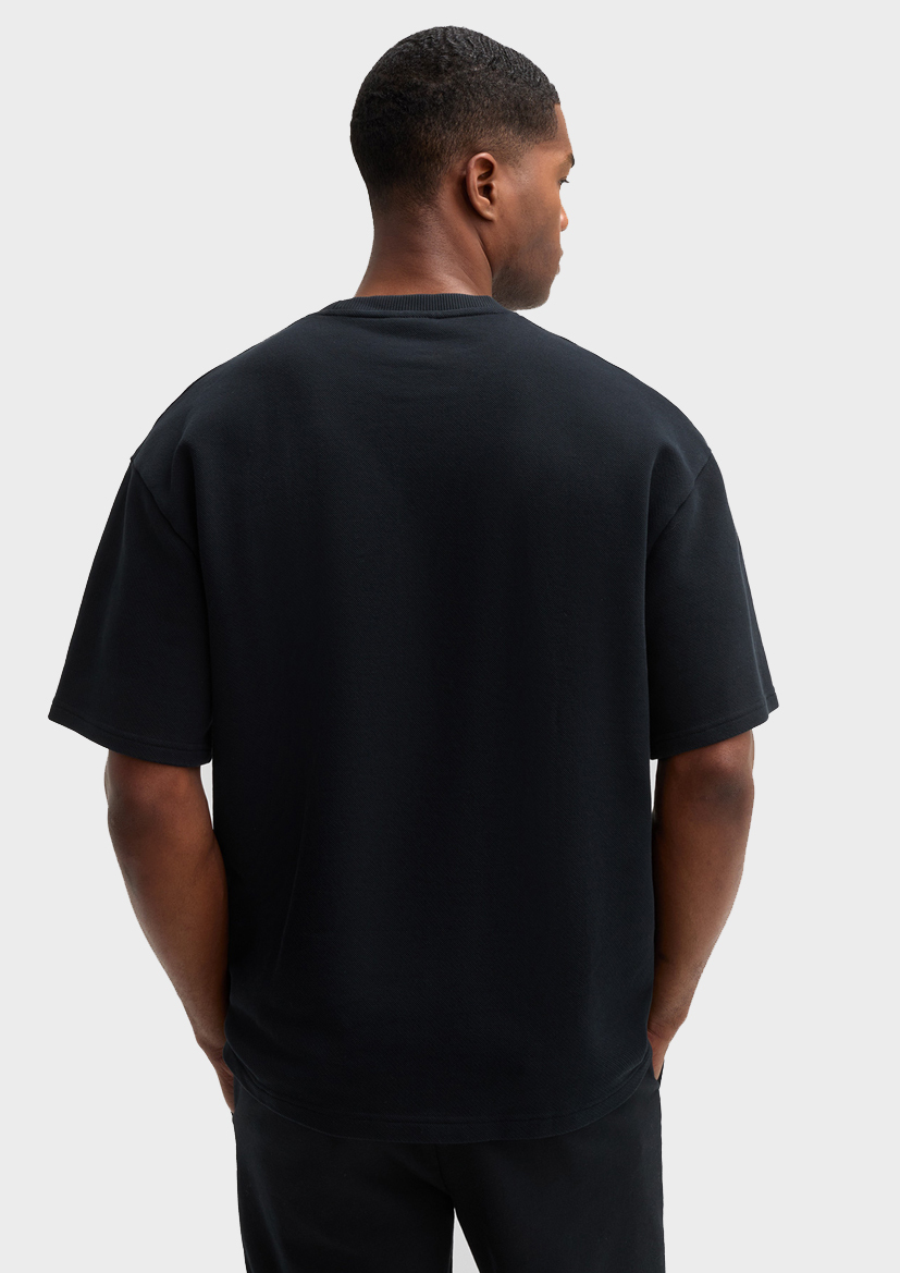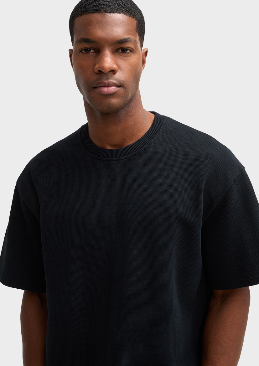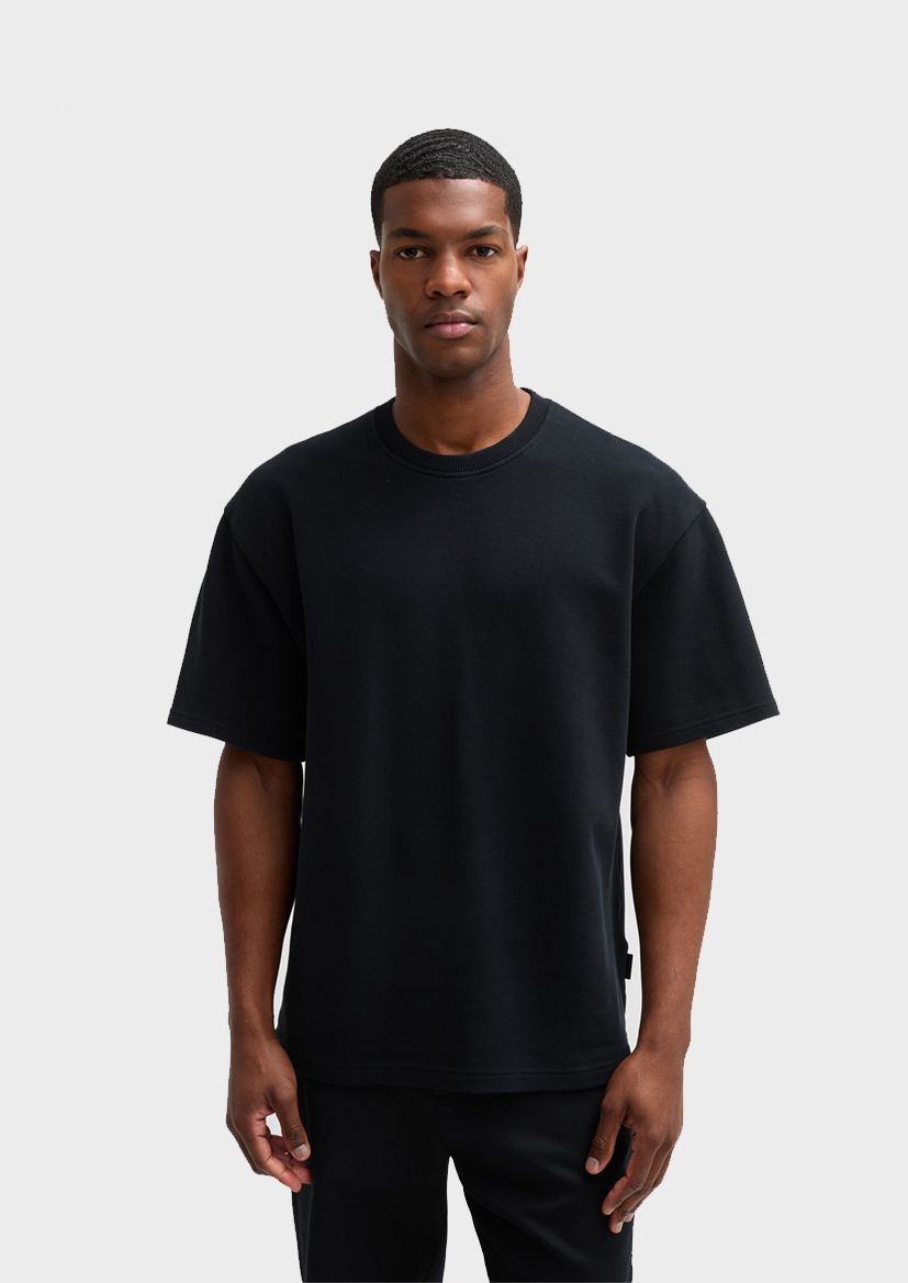 Городская модель: футболка Pico из плотного хлопка высокого качества с заниженными плечами, резинкой-флажком и манжетами с двойной строчкой.