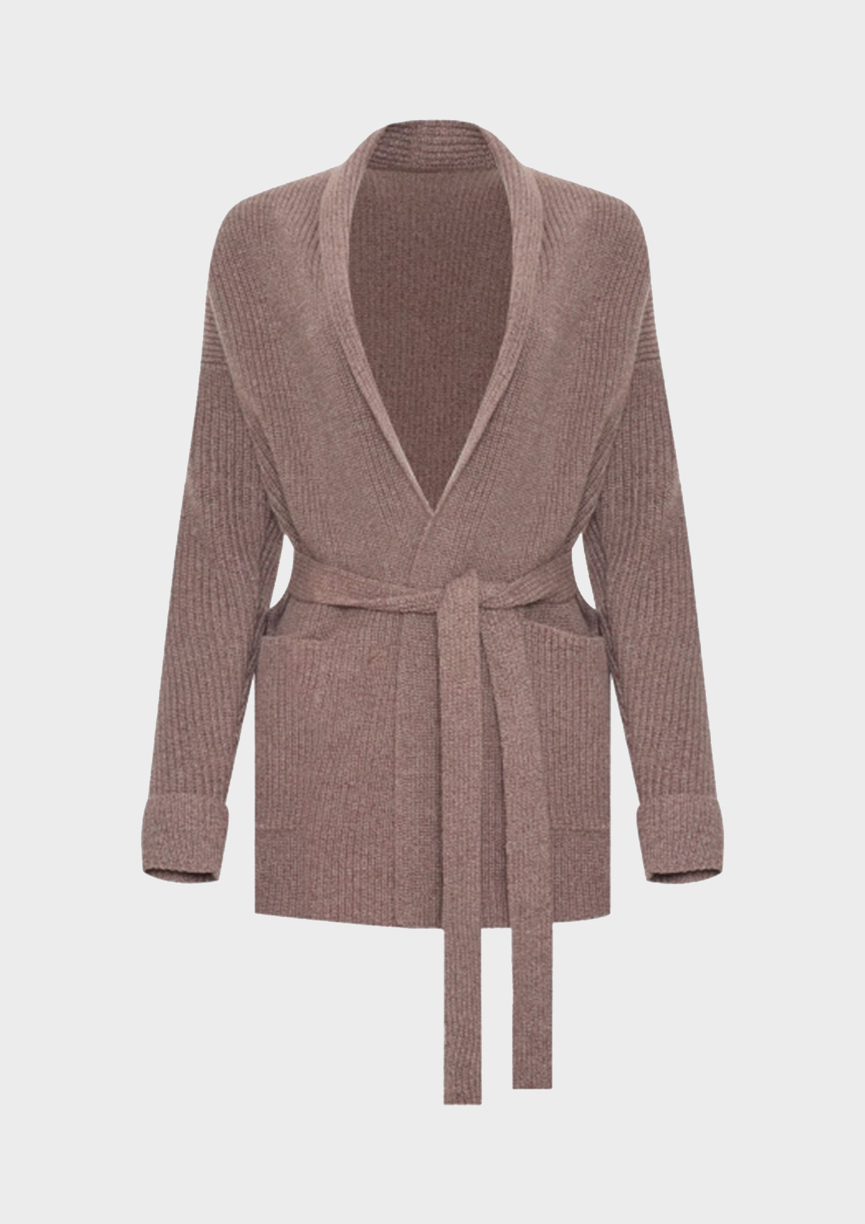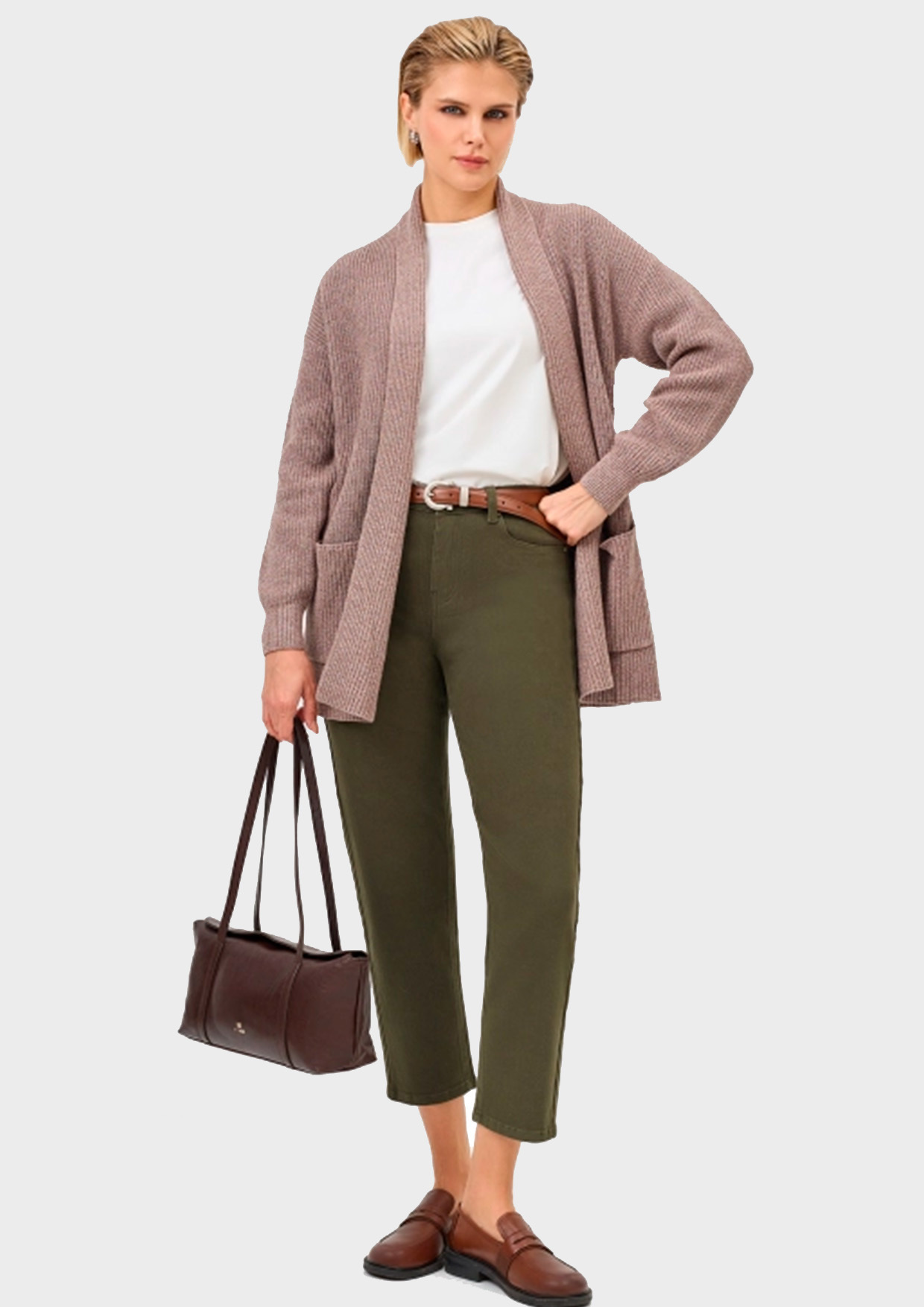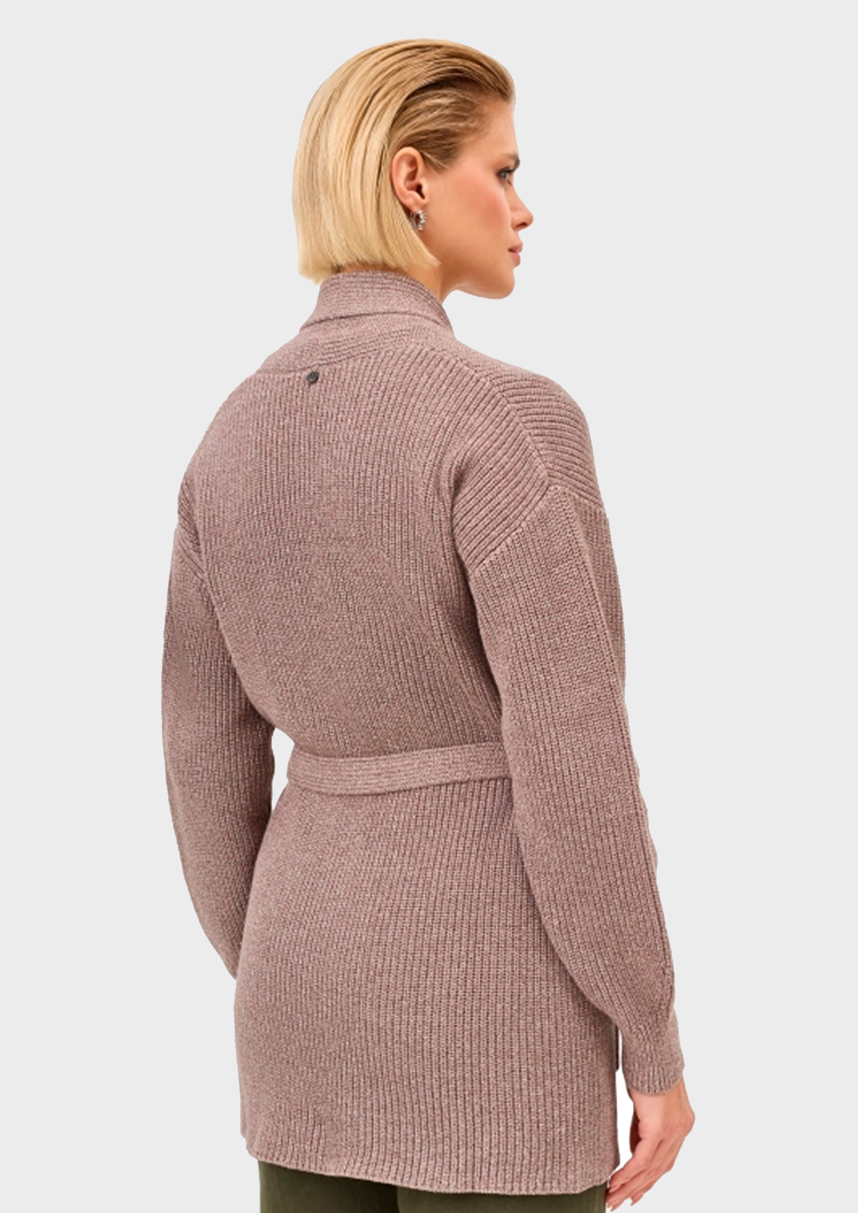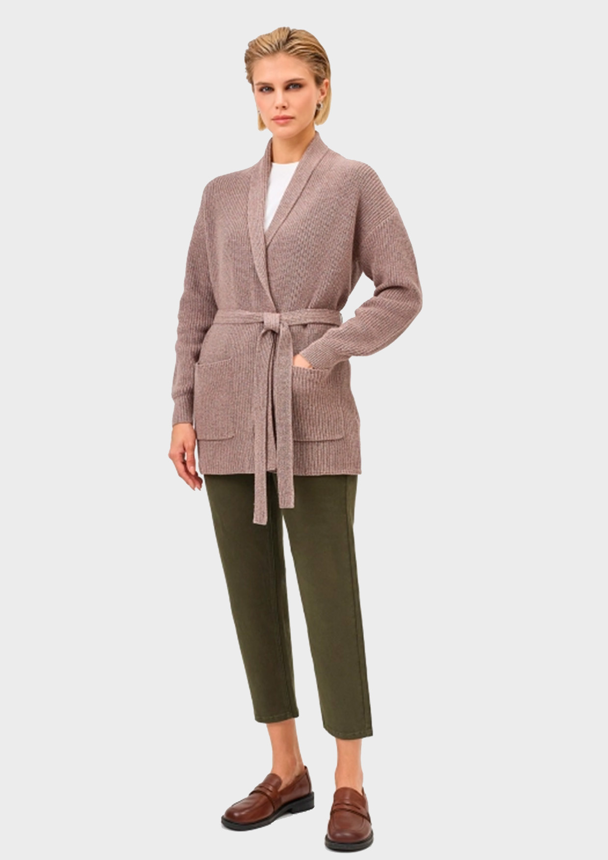 Вязаный свободного силуэта из 100% хлопка. Объемная вязка. Свободный силуэт можно приталить поясом. V-образный вырез. Спущенная линия плеч. Длинные рукава с широкими отворотами по низу. Накладные боковые карманы.