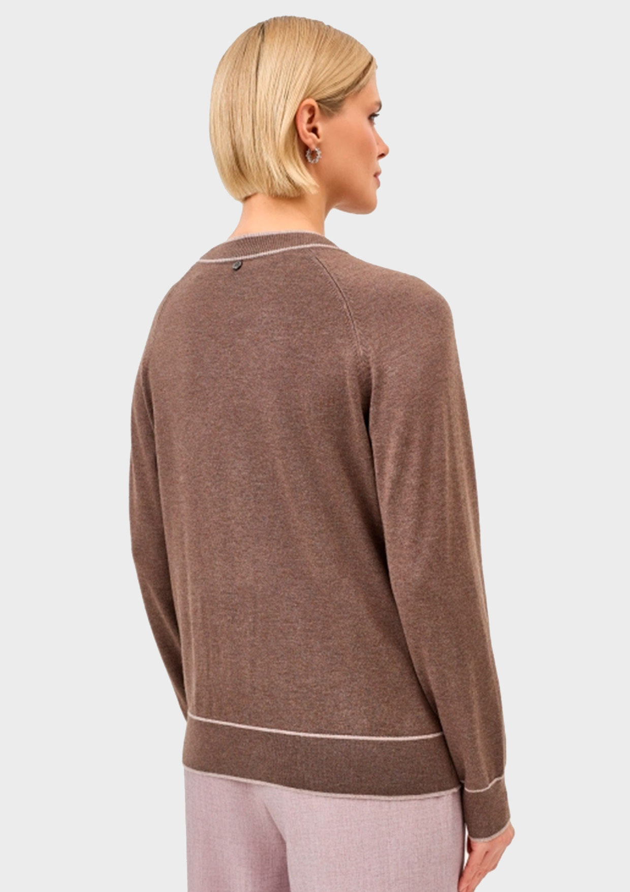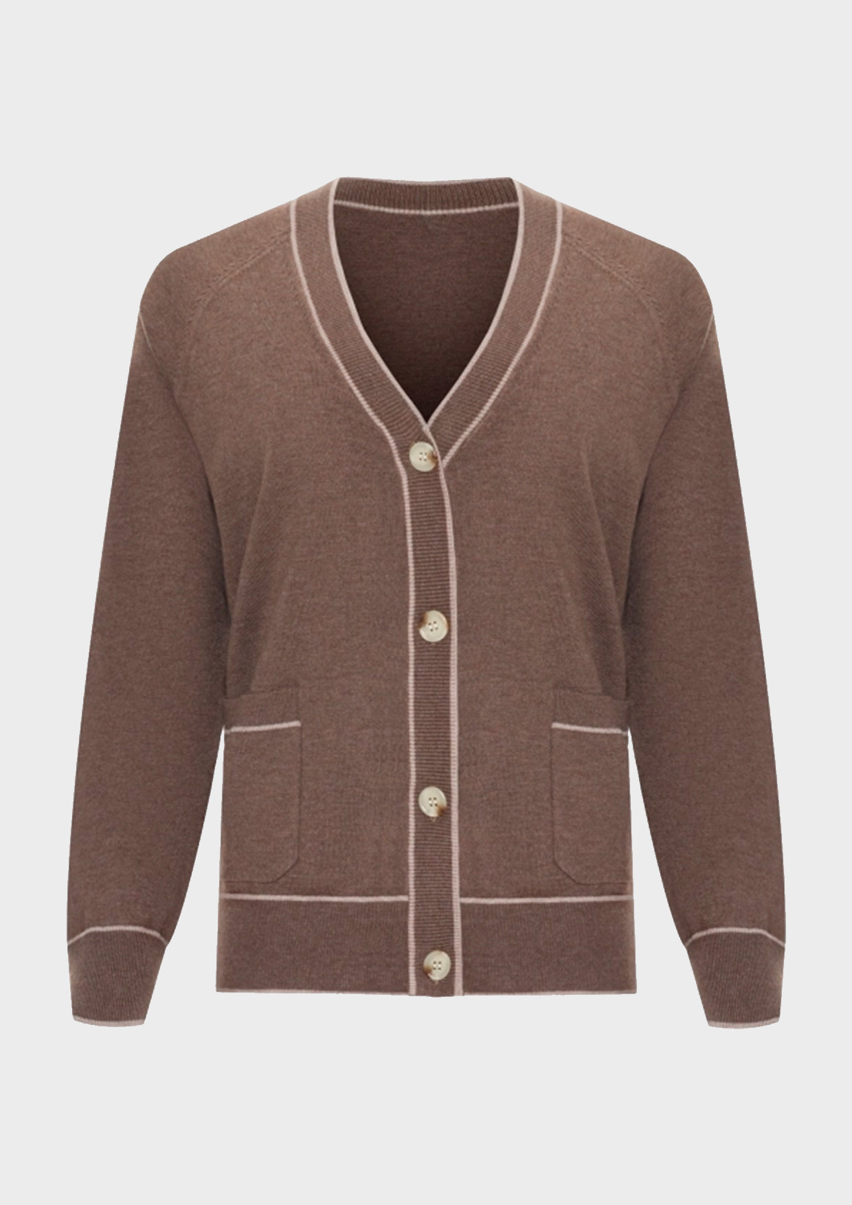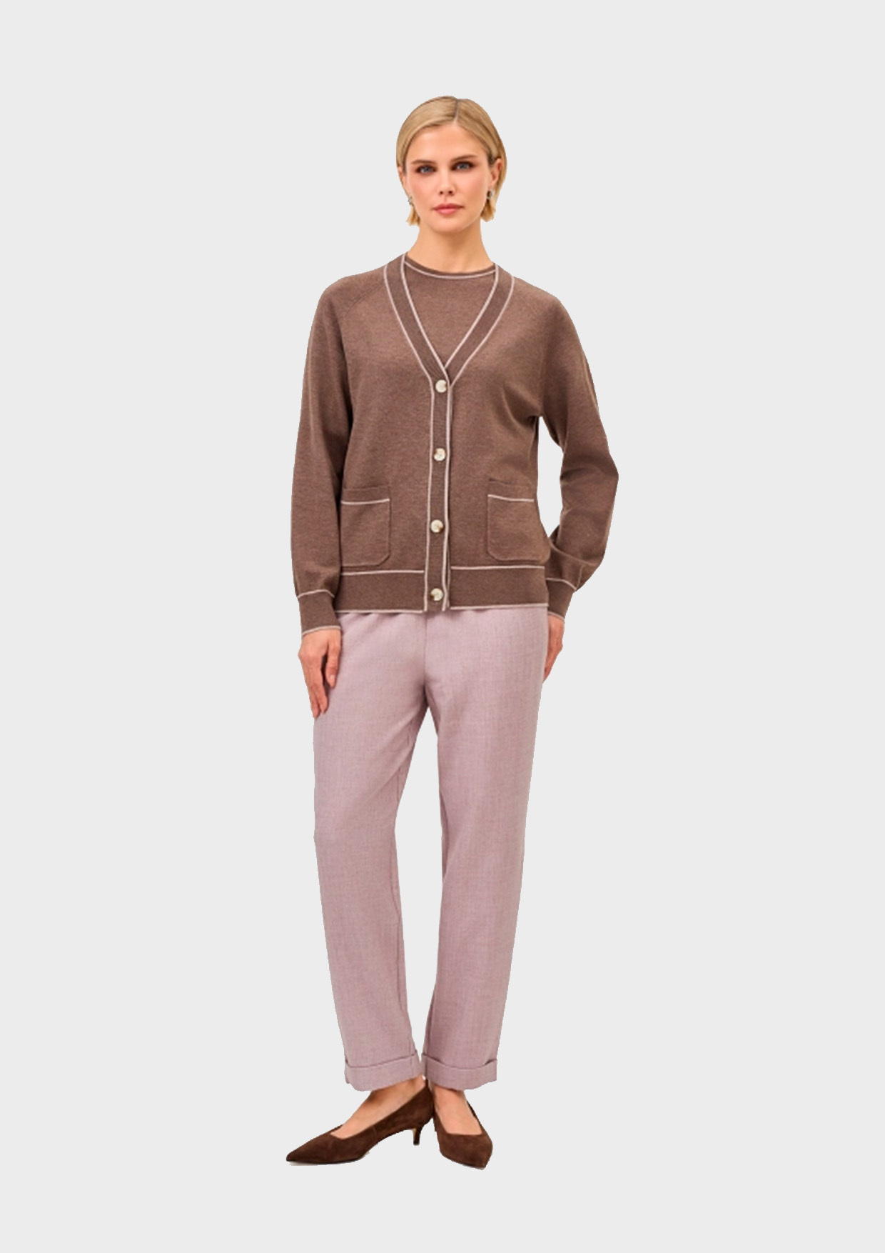 Вязаный кардиган с контрастной отделкой и шелком в составе. Прямой силуэт. V-образный вырез. Длинные рукава реглан с манжетами. Застежка на контрастные пуговицы. Накладные карманы. В составе тенсель, шерсть и шелк.