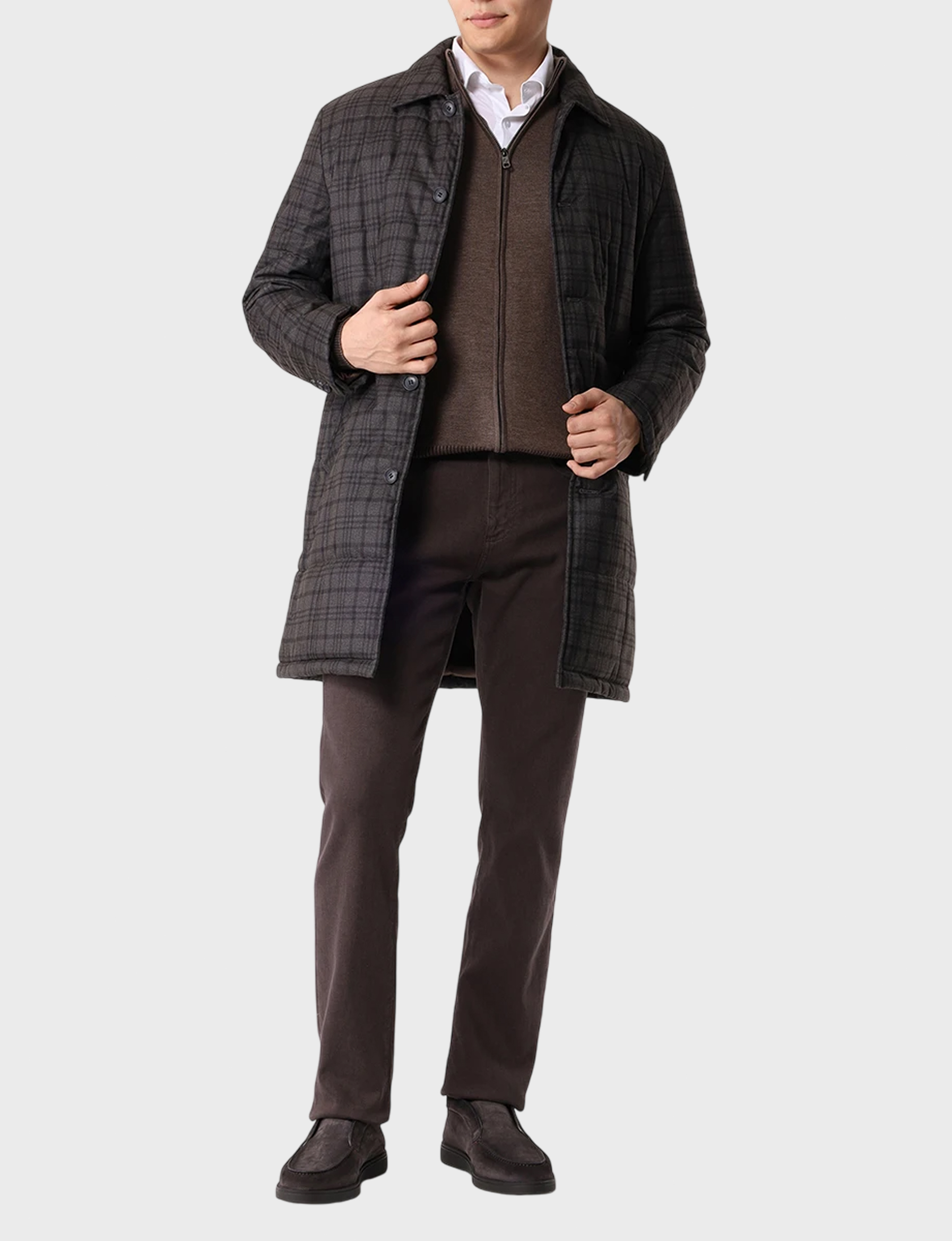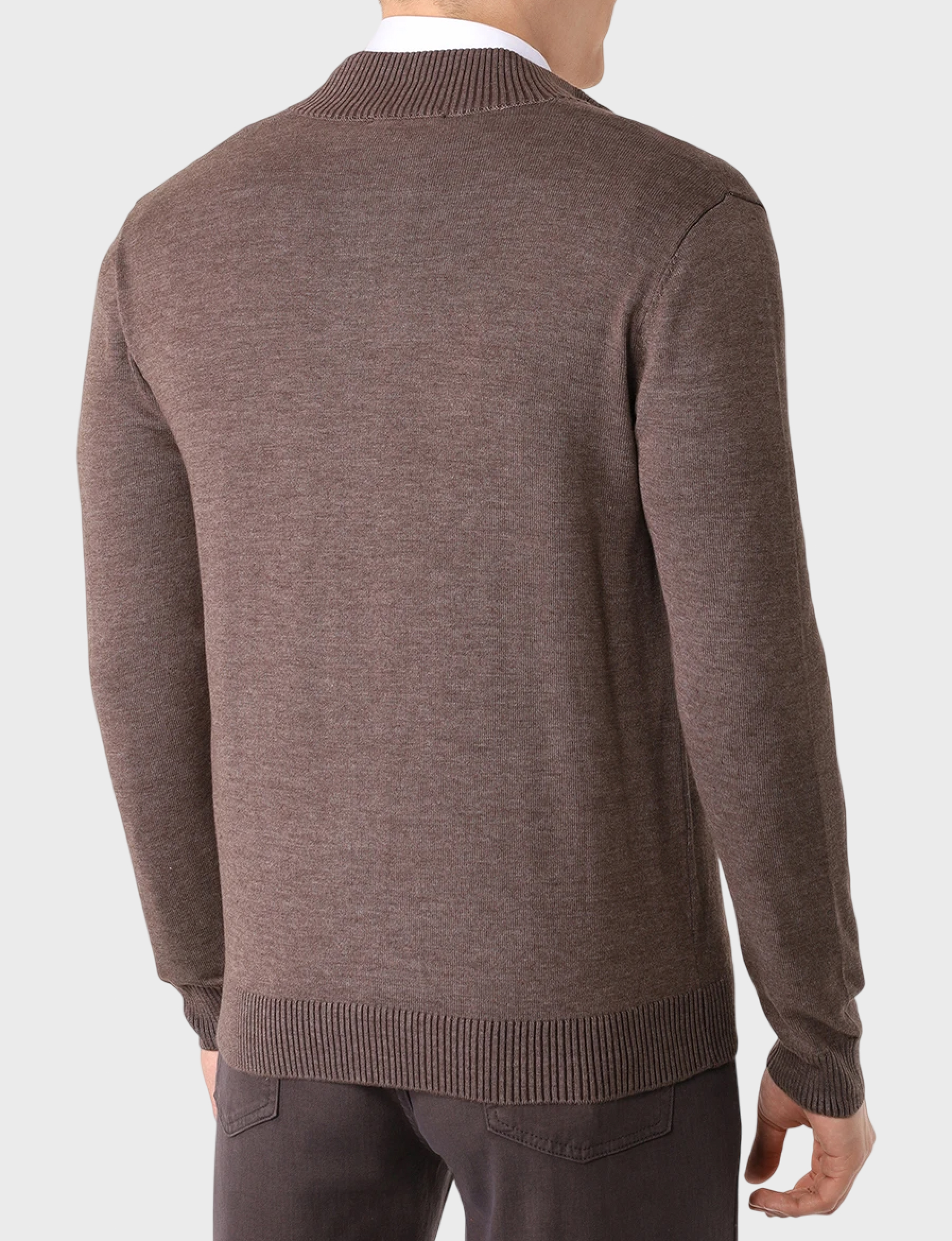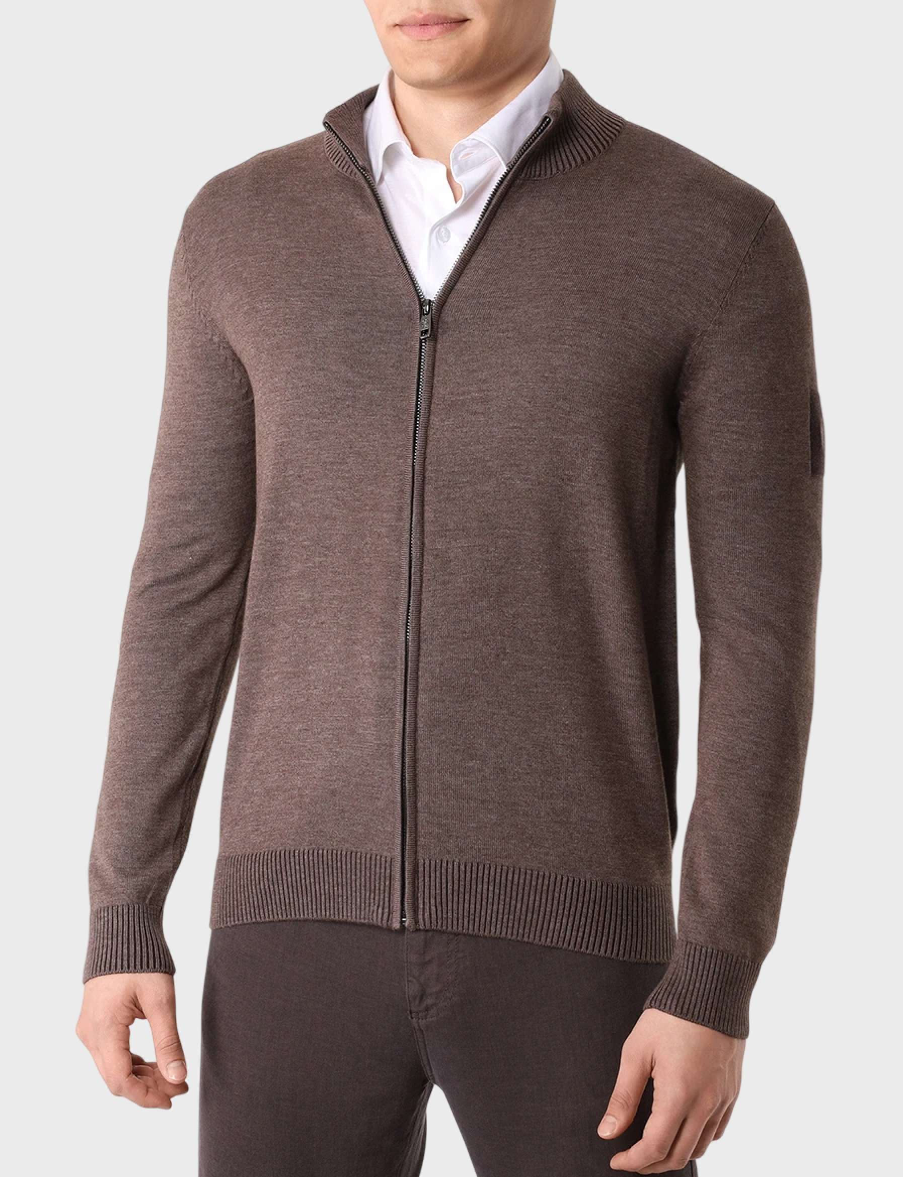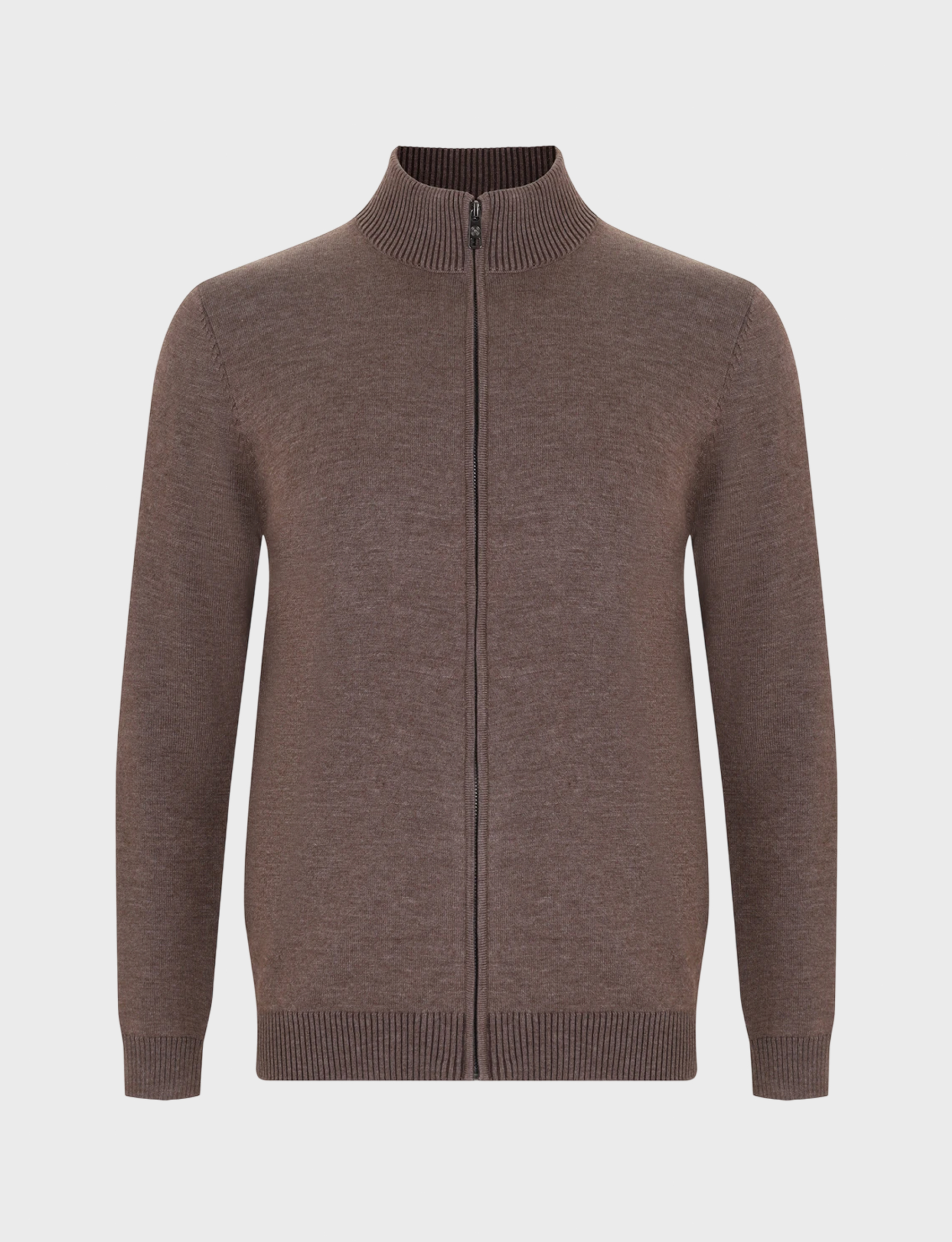 Коричневый кардиган из мягкого хлопка от CUDGI. Модель полуприлегающего силуэта с длинными рукавами, рельефными манжетами, поясом и высоким воротником, логотипом бренда на плече, застежкой на молнию. Кардиган дополнит повседневные образы с джинсами и базовой футболкой или тонким трикотажем.