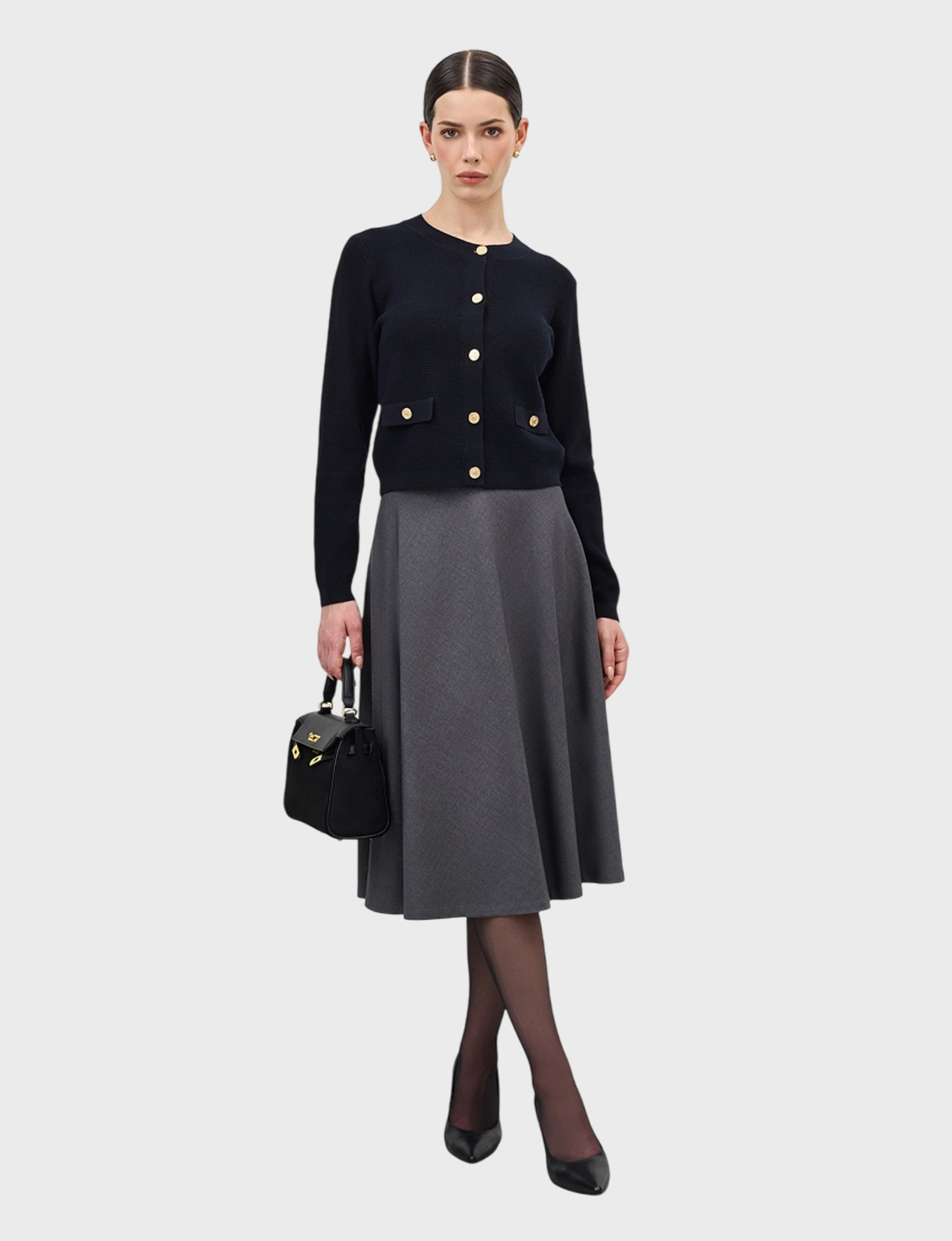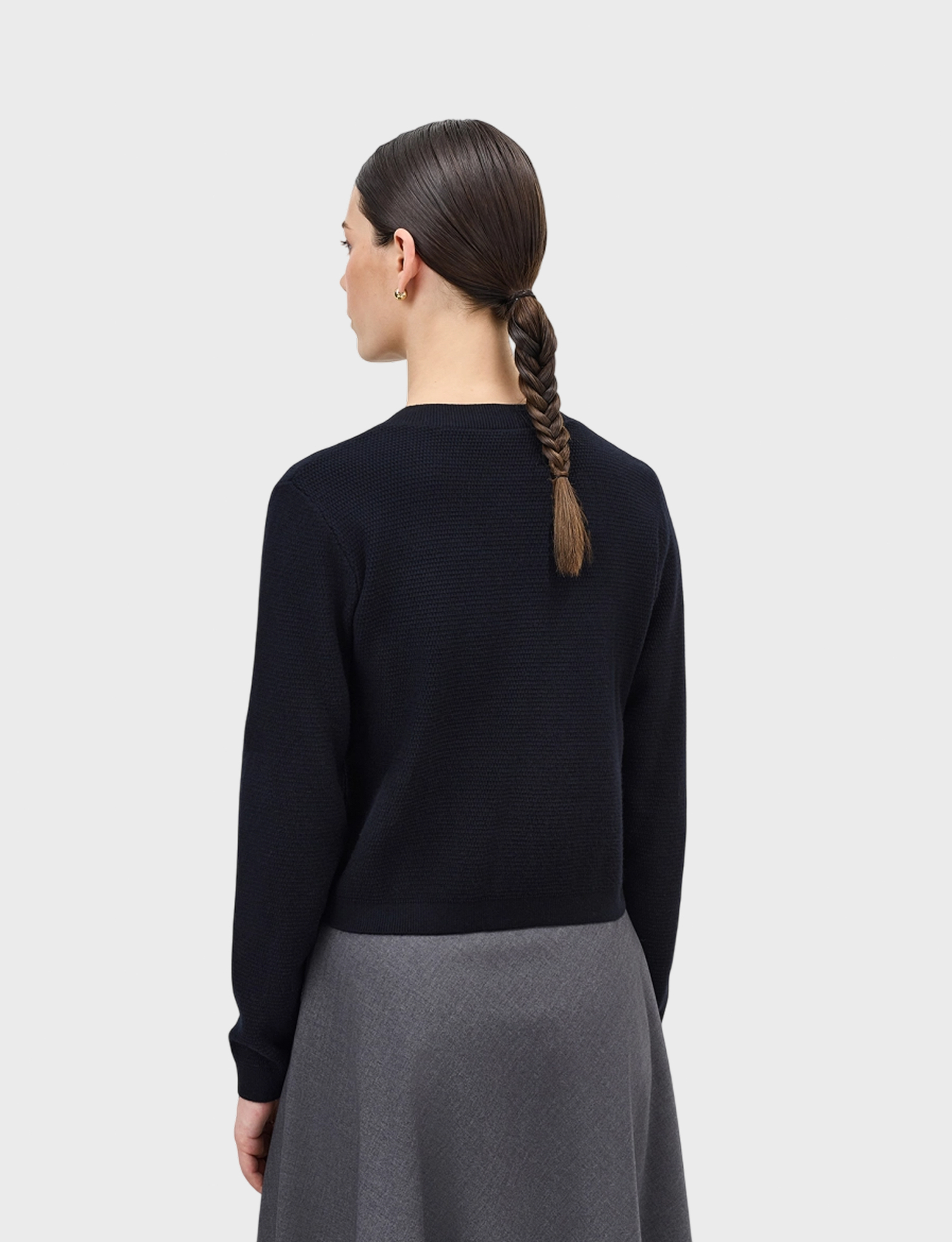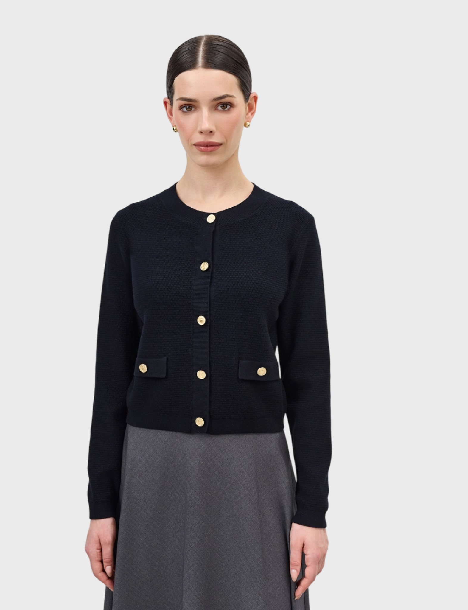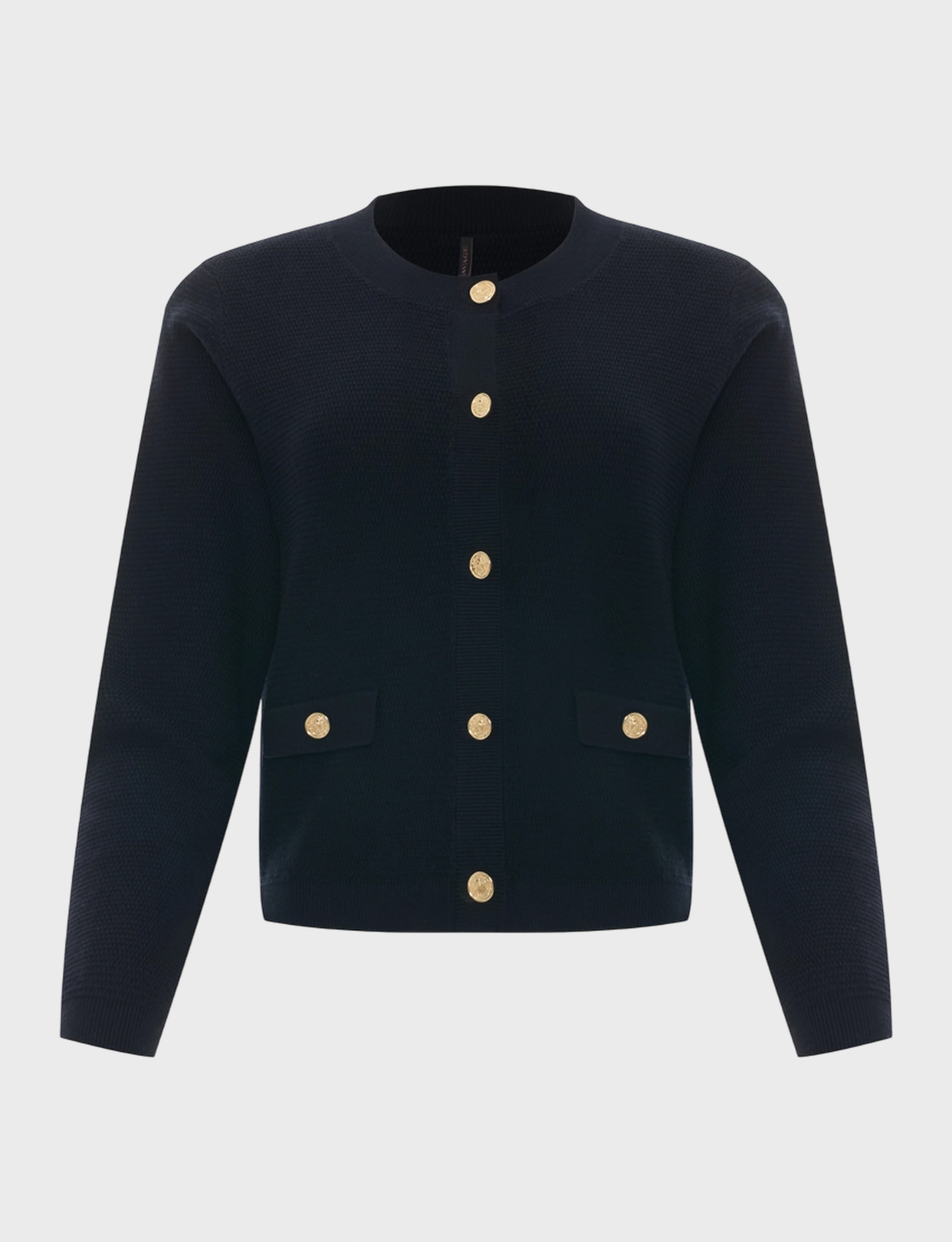 Вязаный жакет-кардиган с акцентными металлическими пуговицами. Прямой силуэт. Фактурная вязка. Круглый вырез. Застежка на пуговицы. В составе вискоза и нейлон.