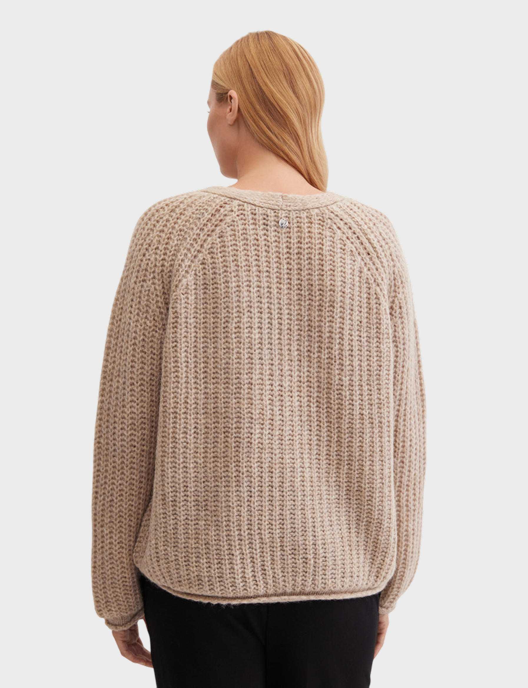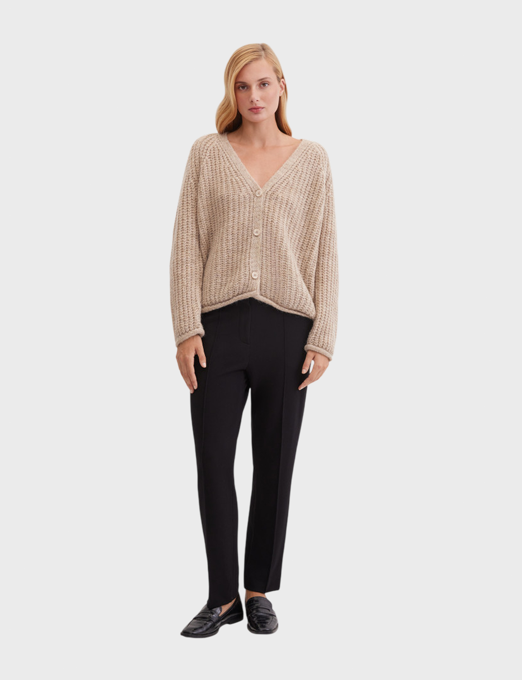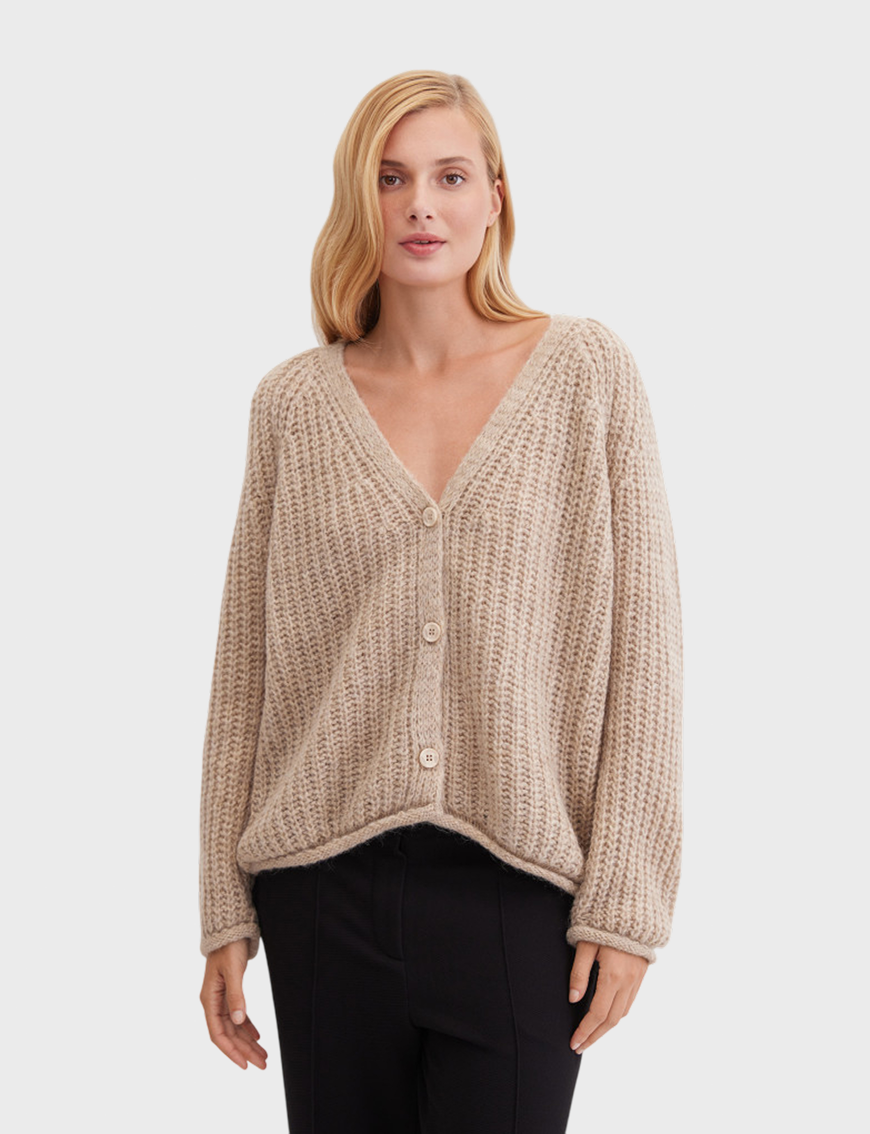 Прямой кардиган крупной вязки свободного кроя из теплого мягкого материала с добавлением шерсти и мохера, на пуговицах, с длинным рукавом реглан и металлической нашивкой лого на спине, без карманов.