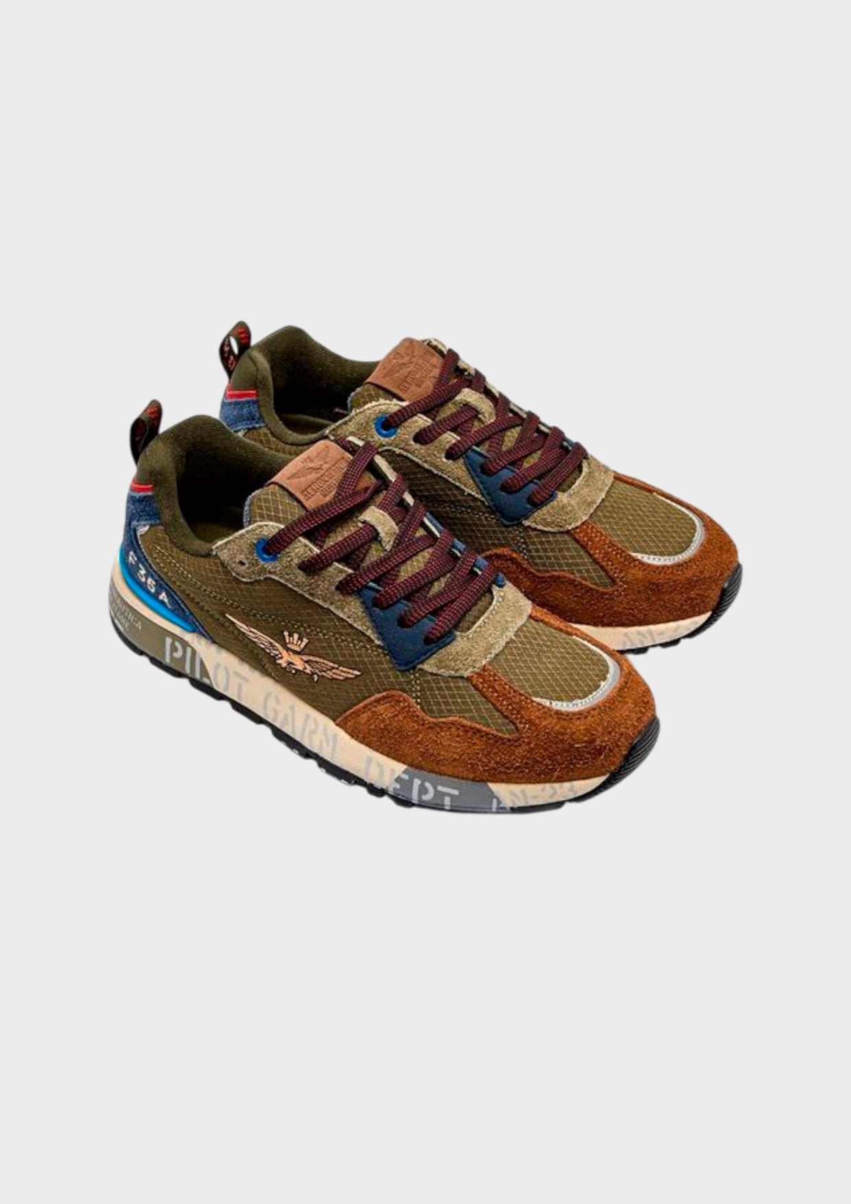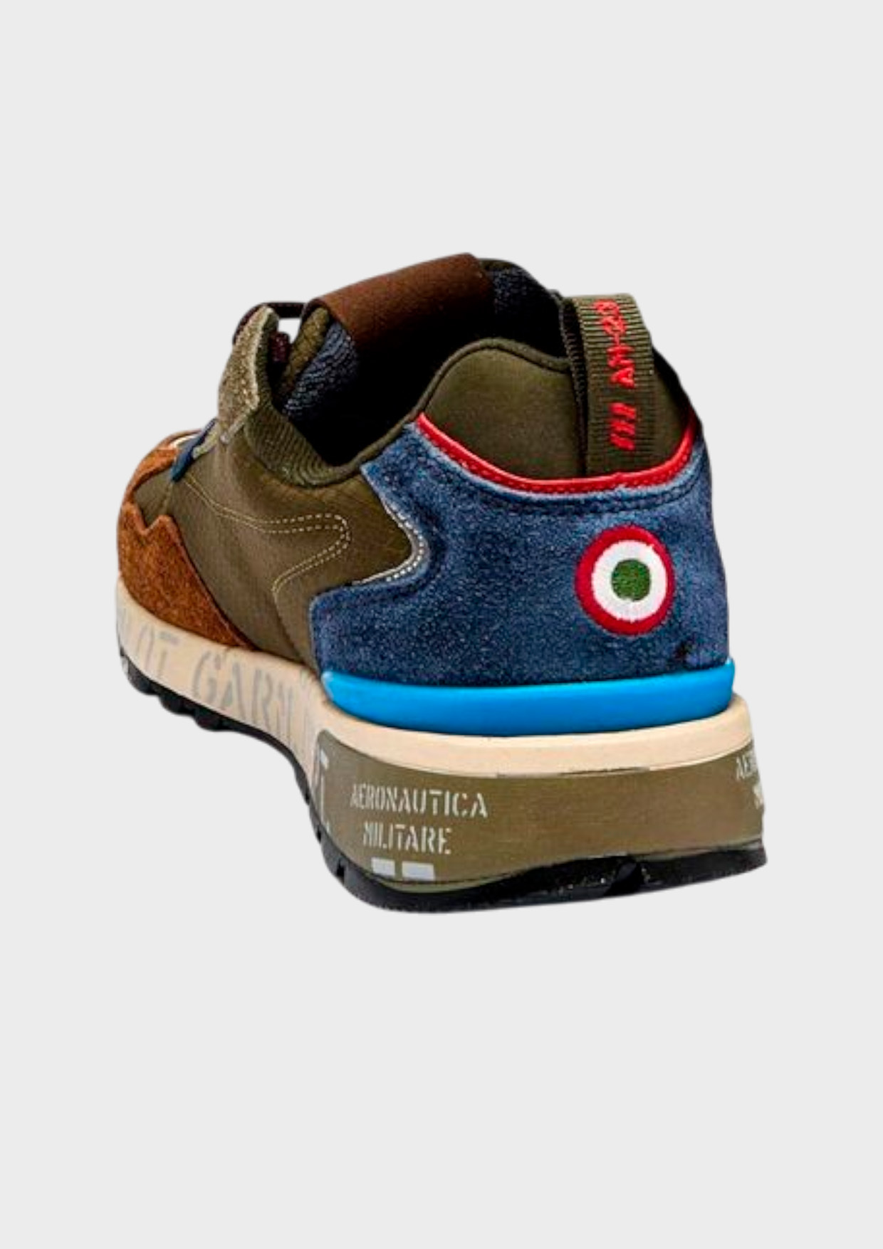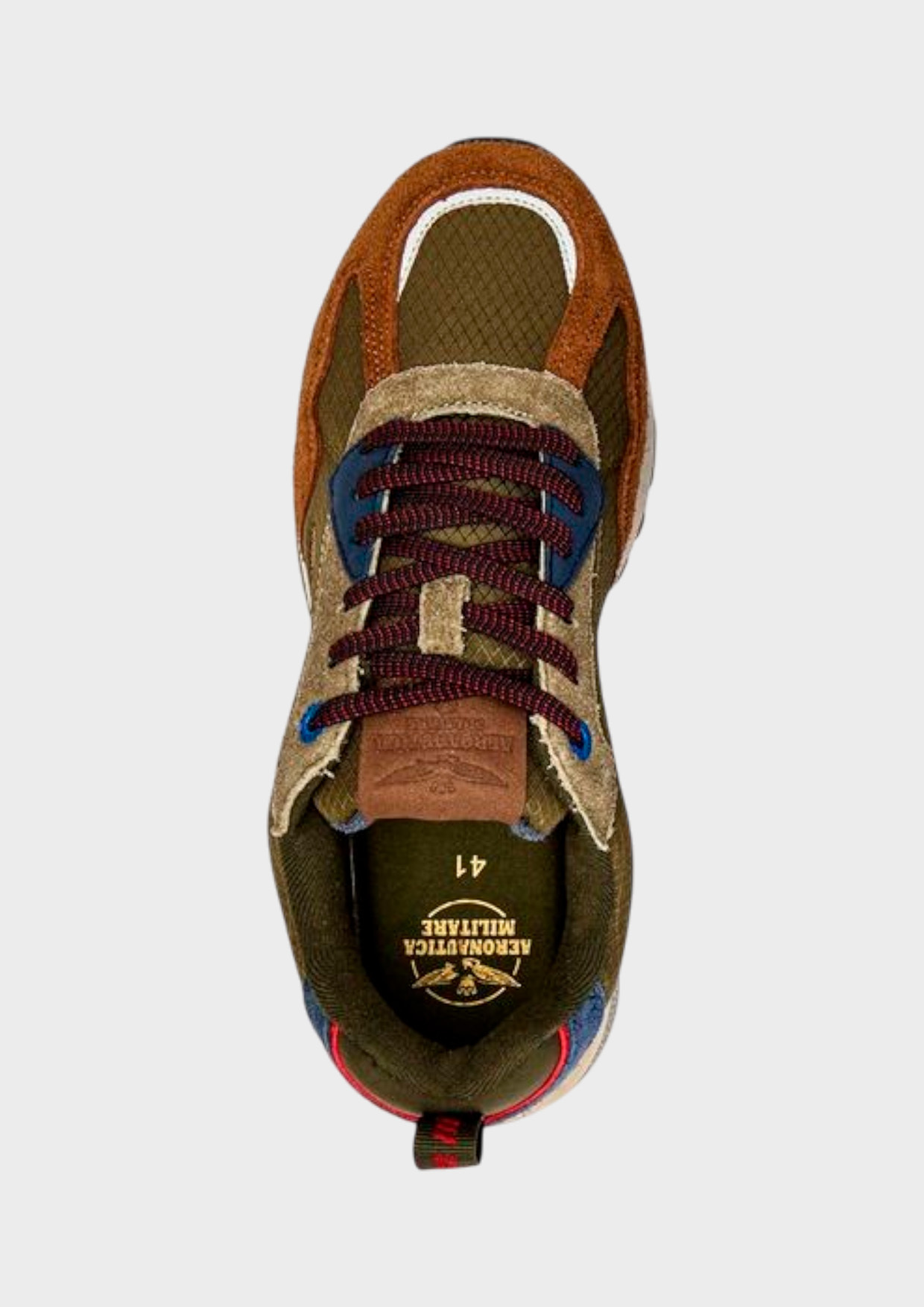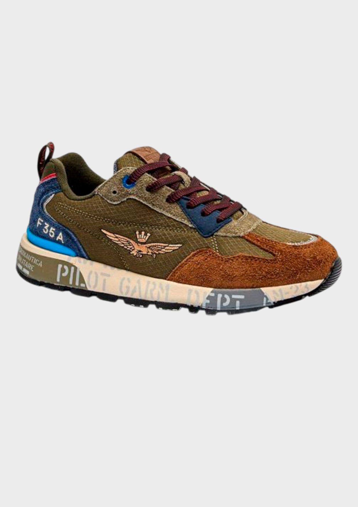 Обувь оформлена рифленой резиновой подошвой, на которую нанесен фирменный принт. Анатомическая стелька с эффектом памяти обеспечивает поддержку и комфорт. Кроссовки выполнены с классической шнуровкой, на язычке нашивка с фирменным логотипом. Завершает декор вышитый орел - символ Аэронавтика Милитари на боковой вставке и вышивка на усиленной пятке.