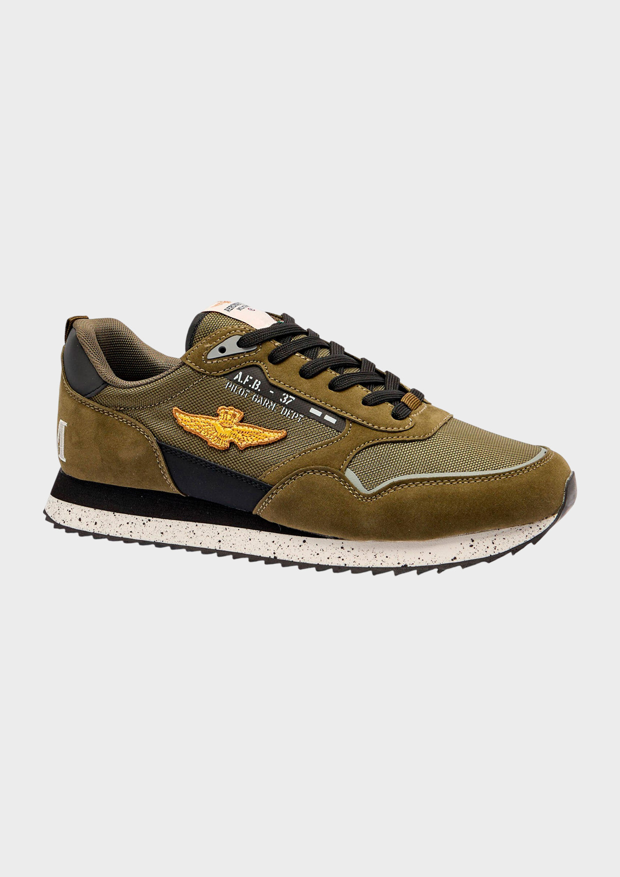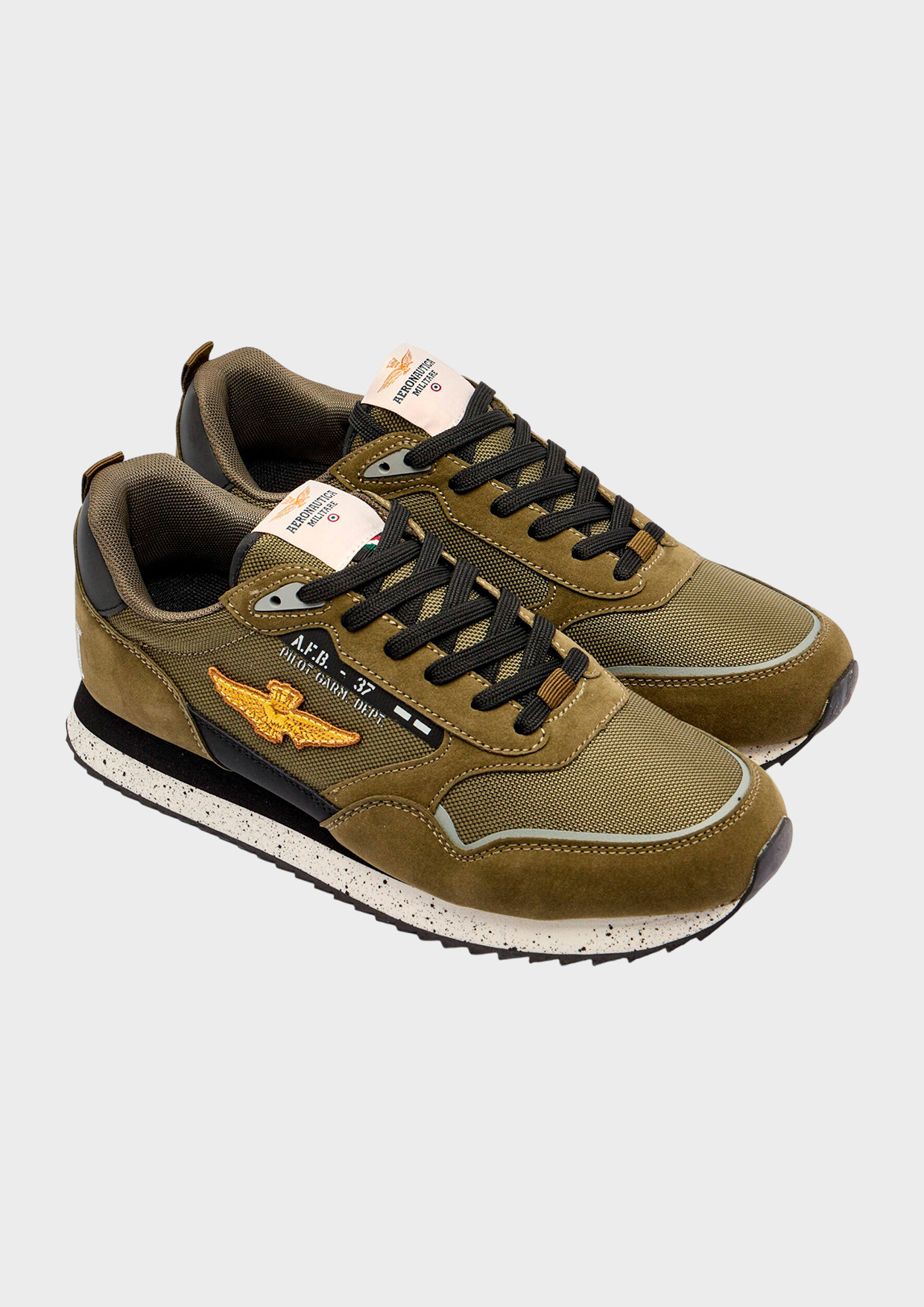 Обувь оформлена рифленой резиновой подошвой, на которую нанесен фирменный принт. Анатомическая стелька с эффектом памяти обеспечивает поддержку и комфорт. Кроссовки выполнены с классической шнуровкой, на язычке нашивка с фирменным логотипом. Завершает декор вышитый орел - символ Аэронавтика Милитари на боковой вставке и вышивка на усиленной пятке.