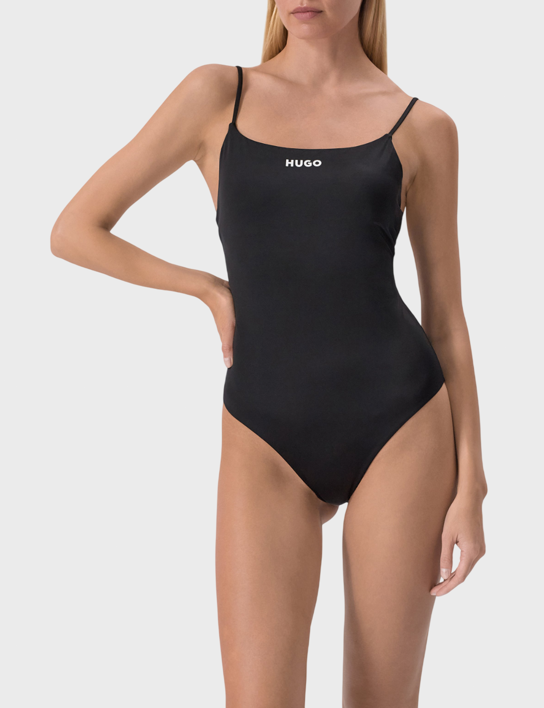 Слитный купальник с регулируемыми бретелями и открытой спиной сшили из быстросохнущего эластичного полиамида. Модель со съемными чашечками украсили контрастным логотипом бренда.