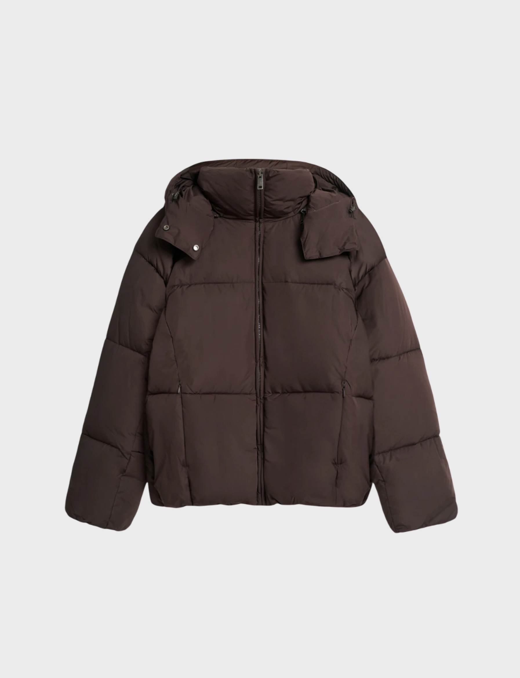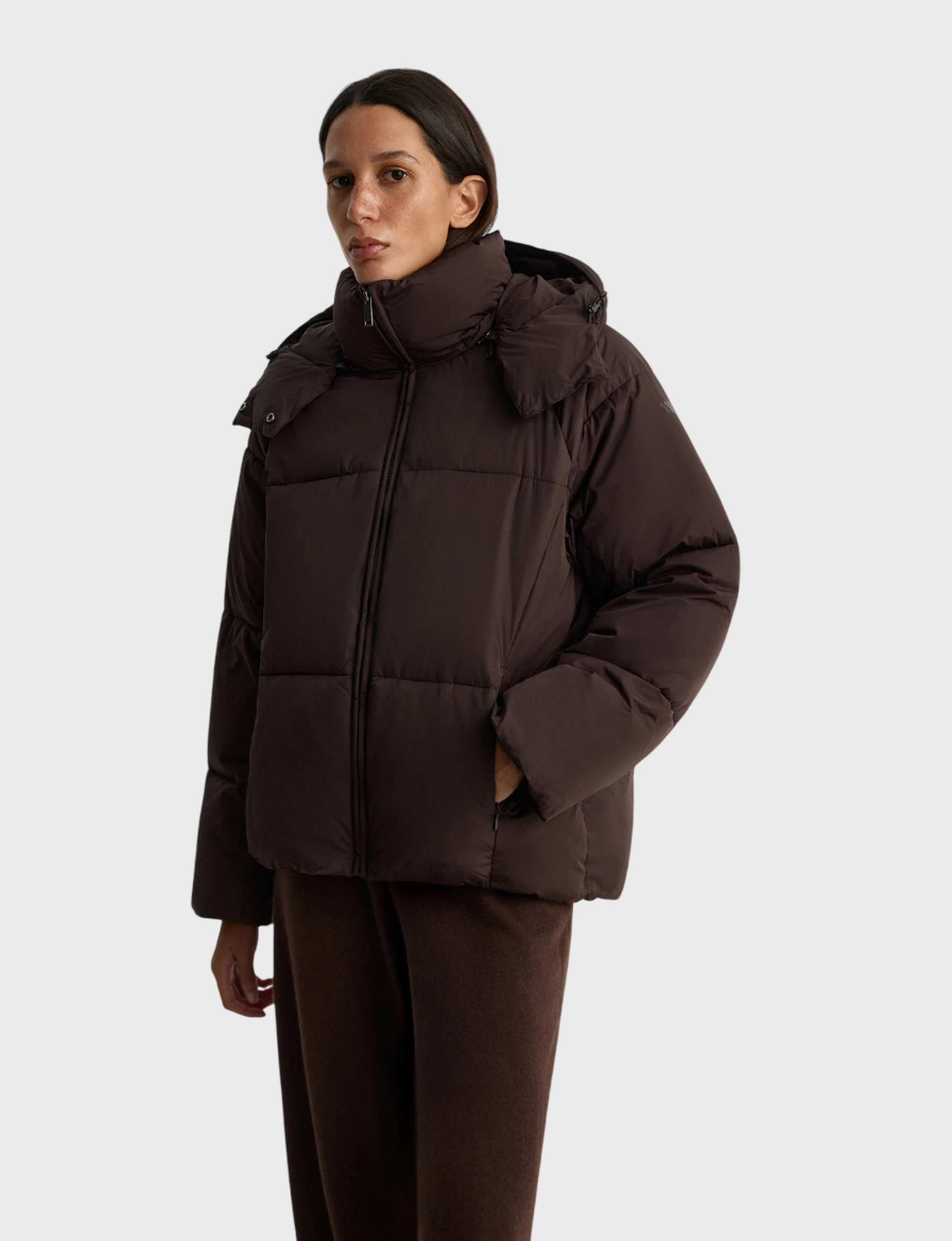 Короткий пуховик с отстегивающимся капюшоном. Минималистичная модель с прорезными карманами. Детали: брендированная подкладка и потайные молнии на карманах. Изделие выполнено из 100% полиэстера — матовой плащевой ткани без фактуры.