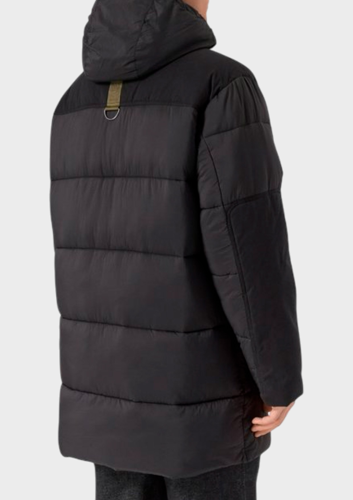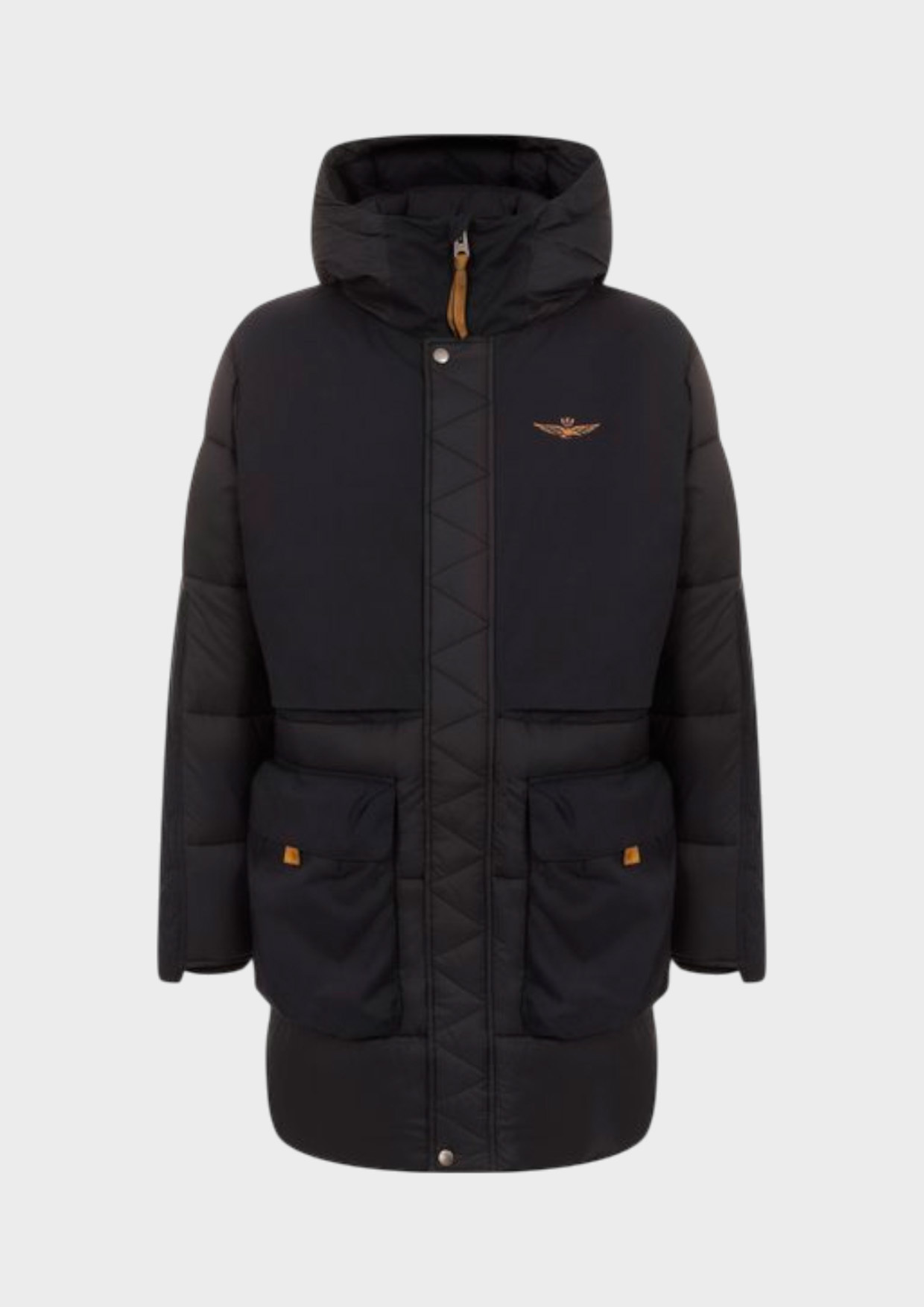 Для изготовления парки на синтетическом утеплителе использовали нейлоновый рипстоп и ткань с добавлением хлопка. Модель с регулируемым капюшоном, накладными боковыми карманами с клапанами и парой внутренних декорировали вышитой эмблемой ВВС Италии спереди и брендированной лентой на спинке.