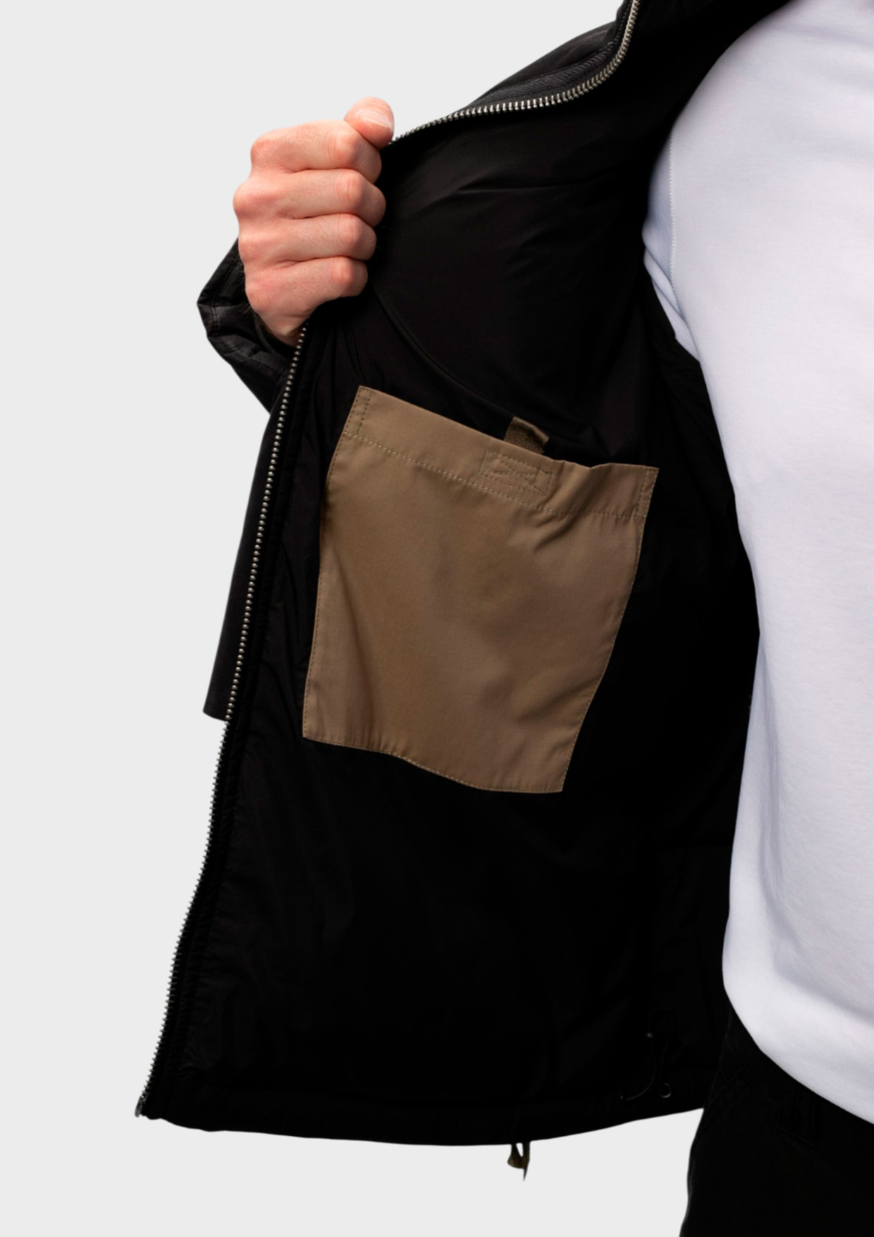 Изделие выполнено из 100% полиамида с утеплителем из 100% полиэстера, что обеспечивает защиту от холода и комфорт в непогоду. Куртка имеет объемный, но структурированный силуэт с высоким воротником-стойкой и центральной застежкой-молнией. Главный акцент сделан на четырех крупных накладных карманах с клапанами на передней части, которые подчеркивают ее утилитарный, полевой стиль.