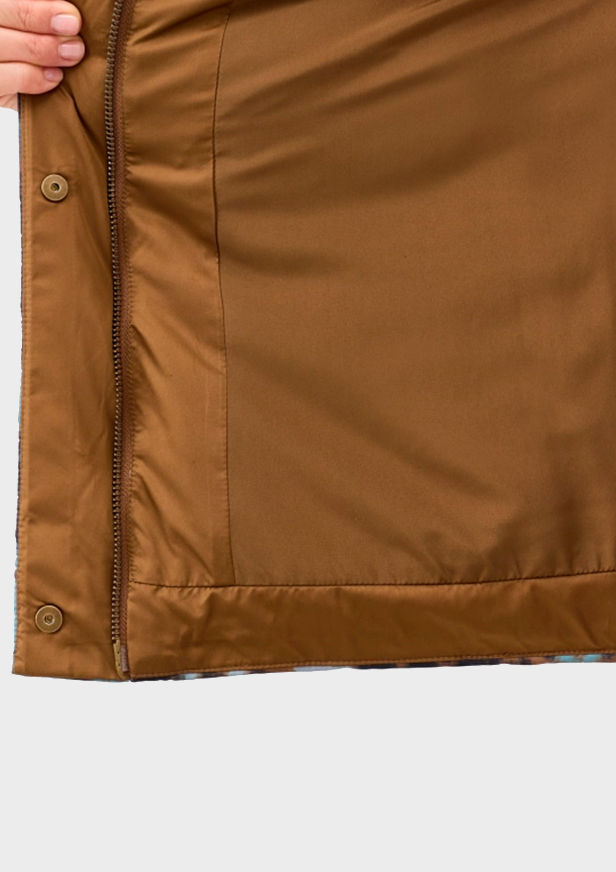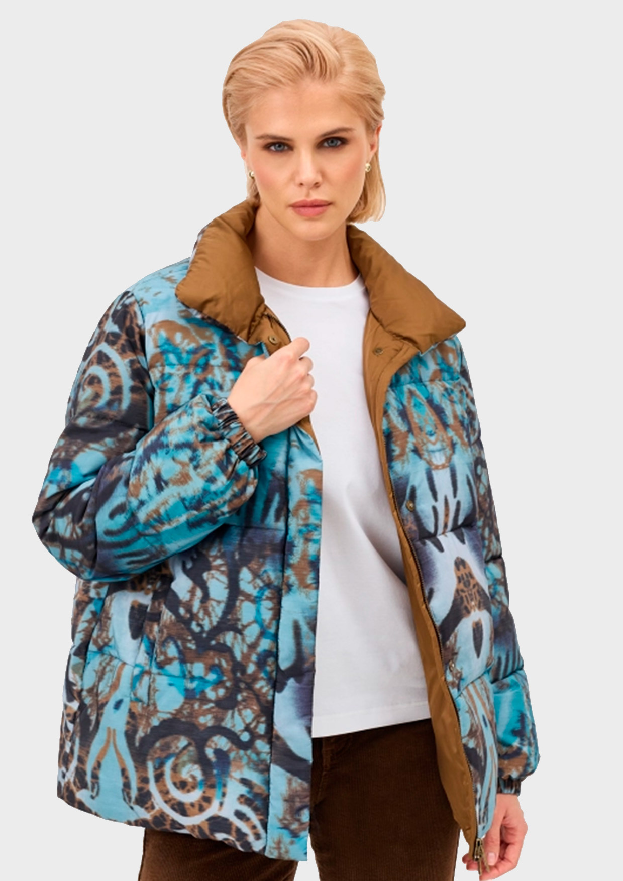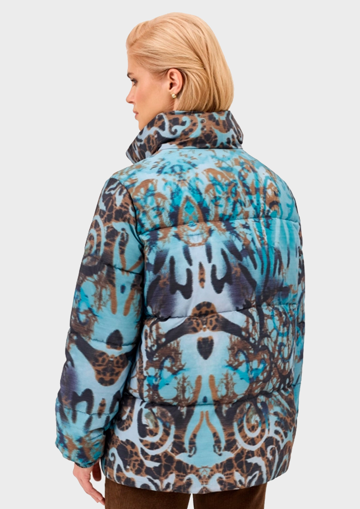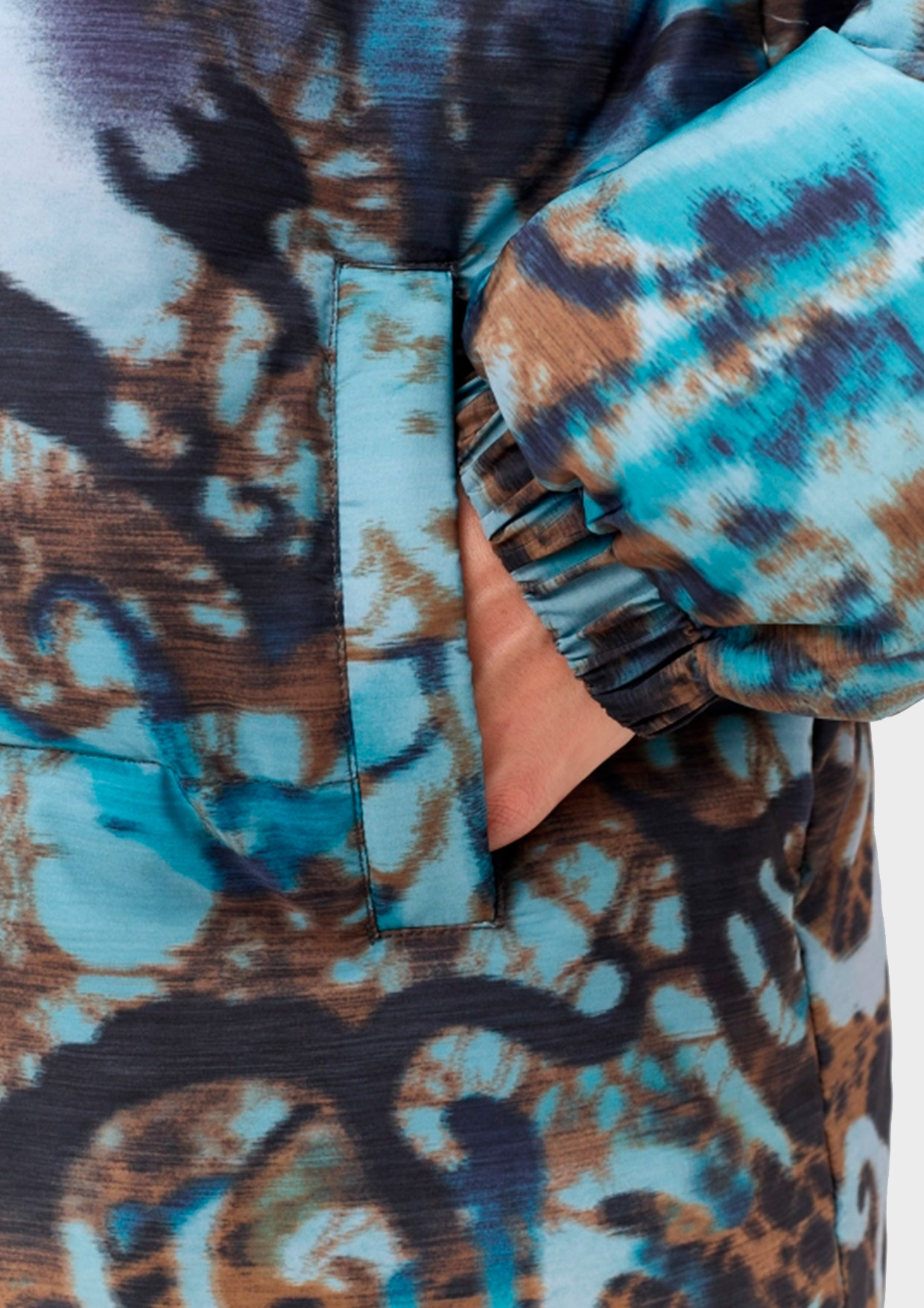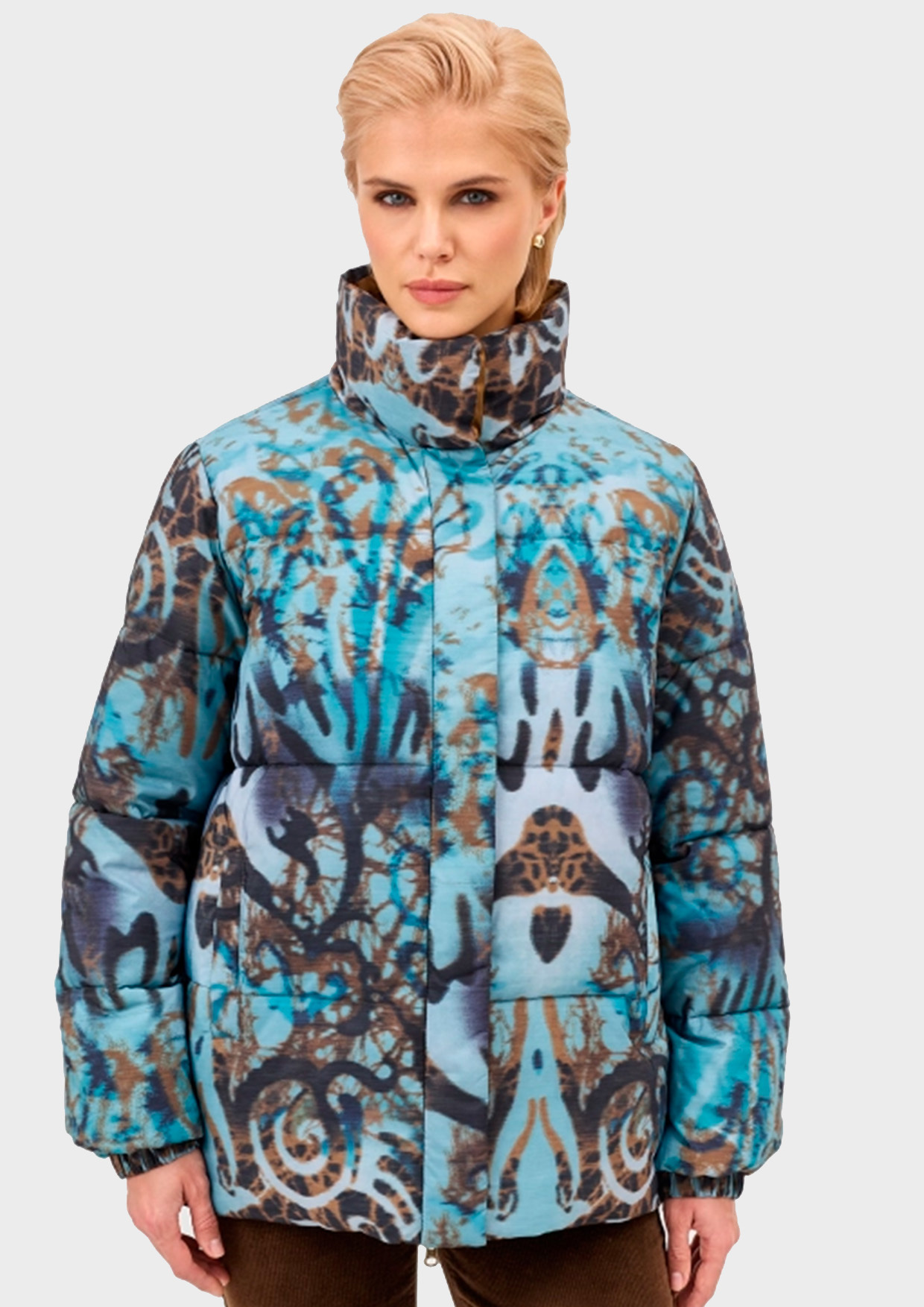 Яркая куртка с красочным дизайнерским принтом прямого силуэта. Воротник стойка. Боковые карманы с листочками. Застежка на молнию и планку со скрытыми кнопками. Втачные рукава. Резинки по низу рукавов и кулиса по низу для защиты от ветра.