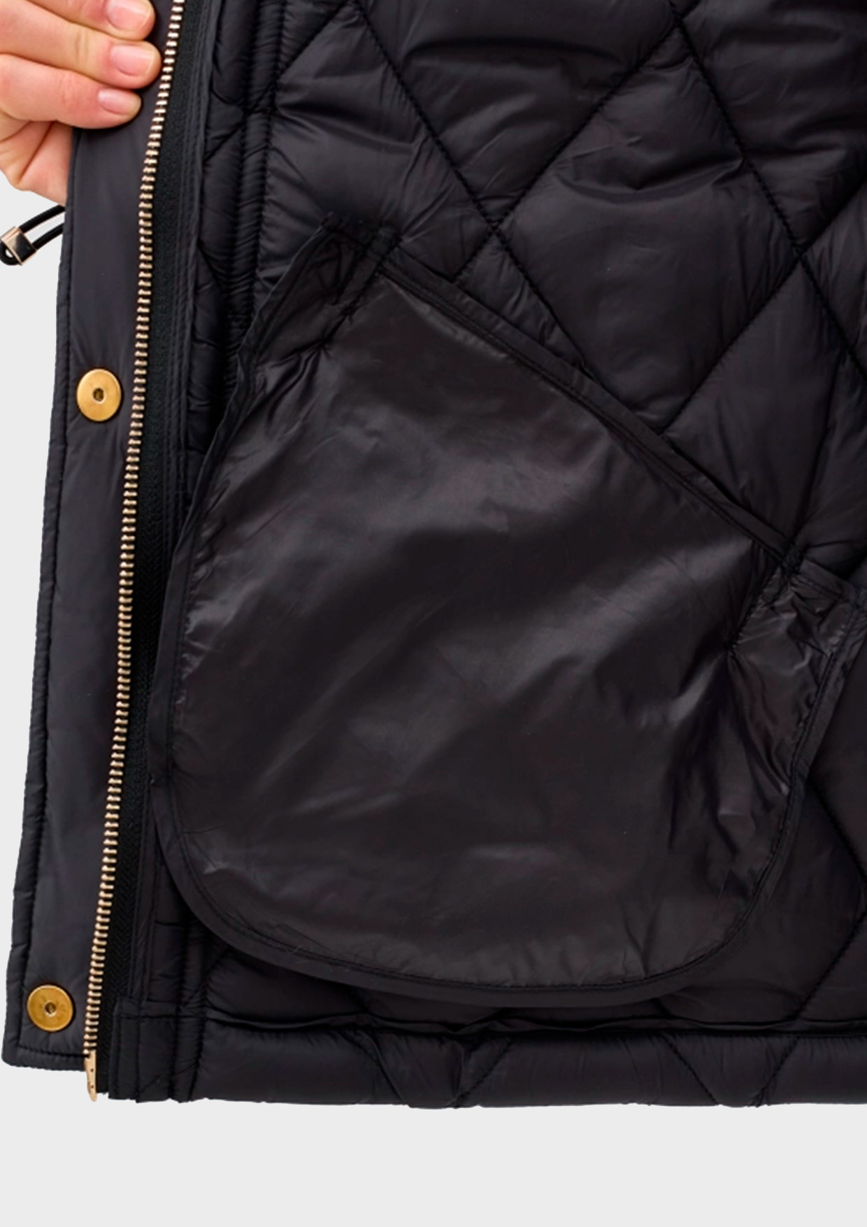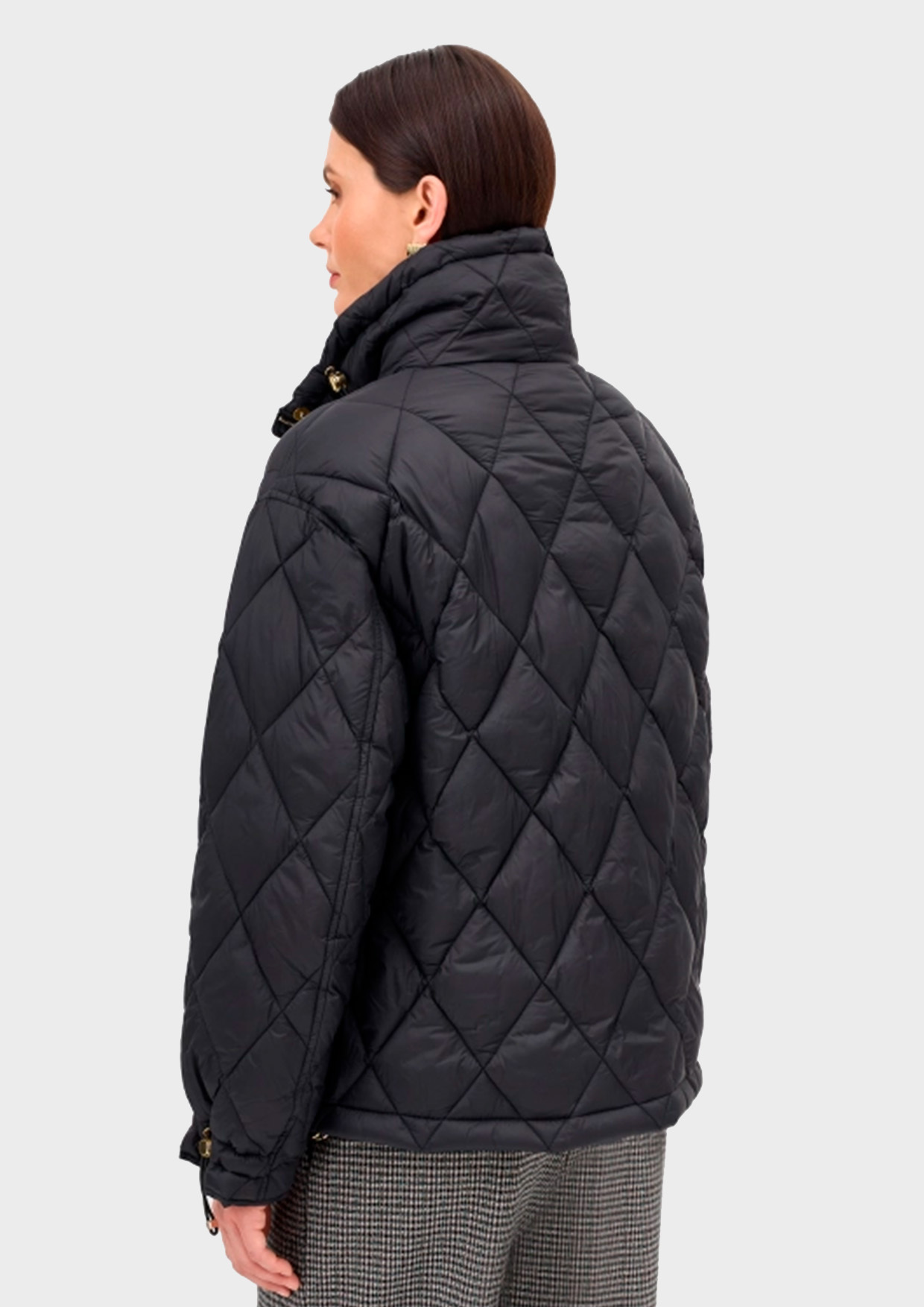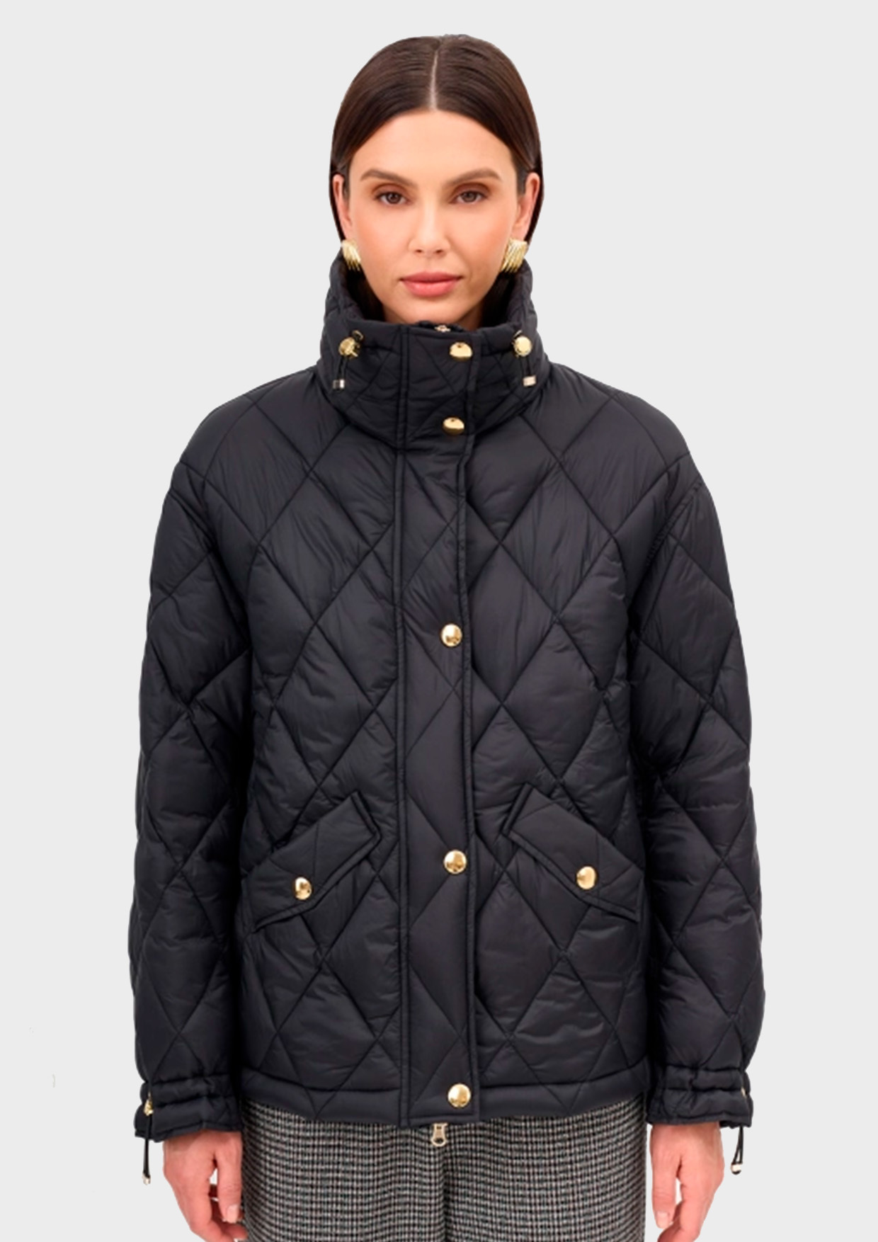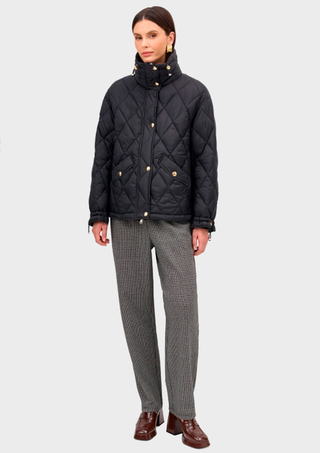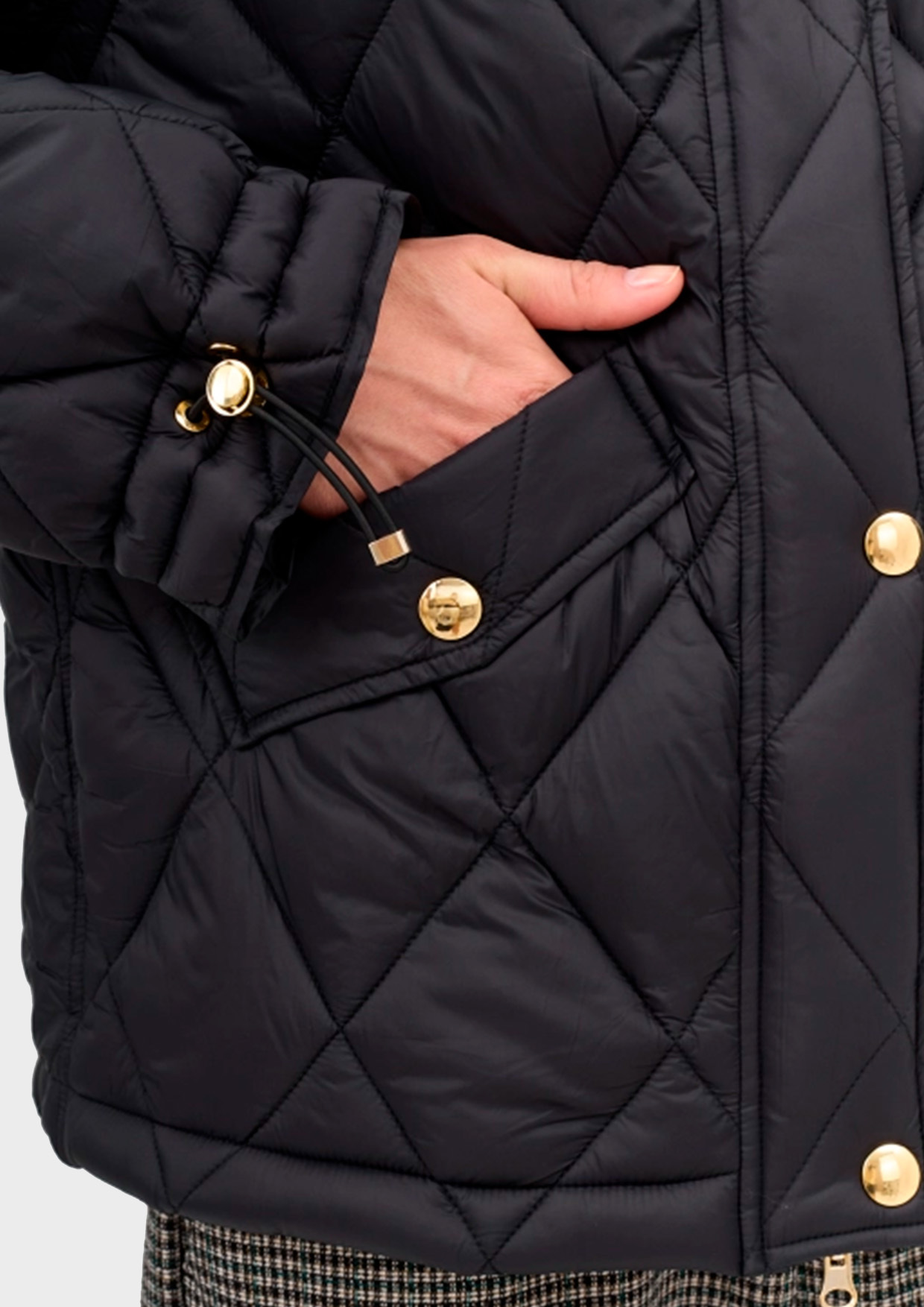 Утепленная куртка с акцентной золотистой фурнитурой. Прямой силуэт. Ромбовидная стежка. Спущенная линия плеч. Воротник стойка с утяжниками. Застежка на молнию и ветрозащитную планку с декоративными кнопками. Боковые карманы с клапанами. Кулиса по низу изделия для защиты от ветра. Манжеты с декоративными кнопками по низу рукавов.