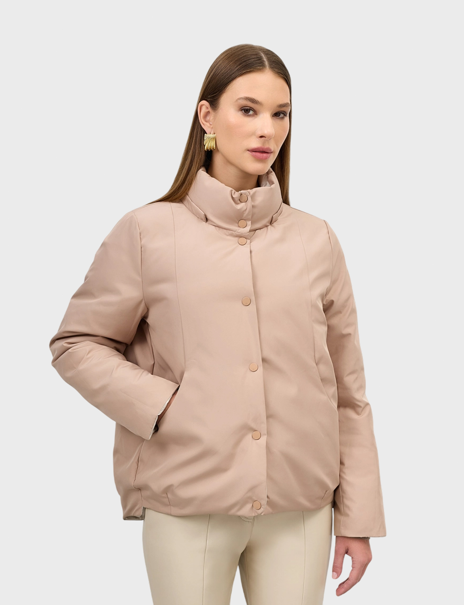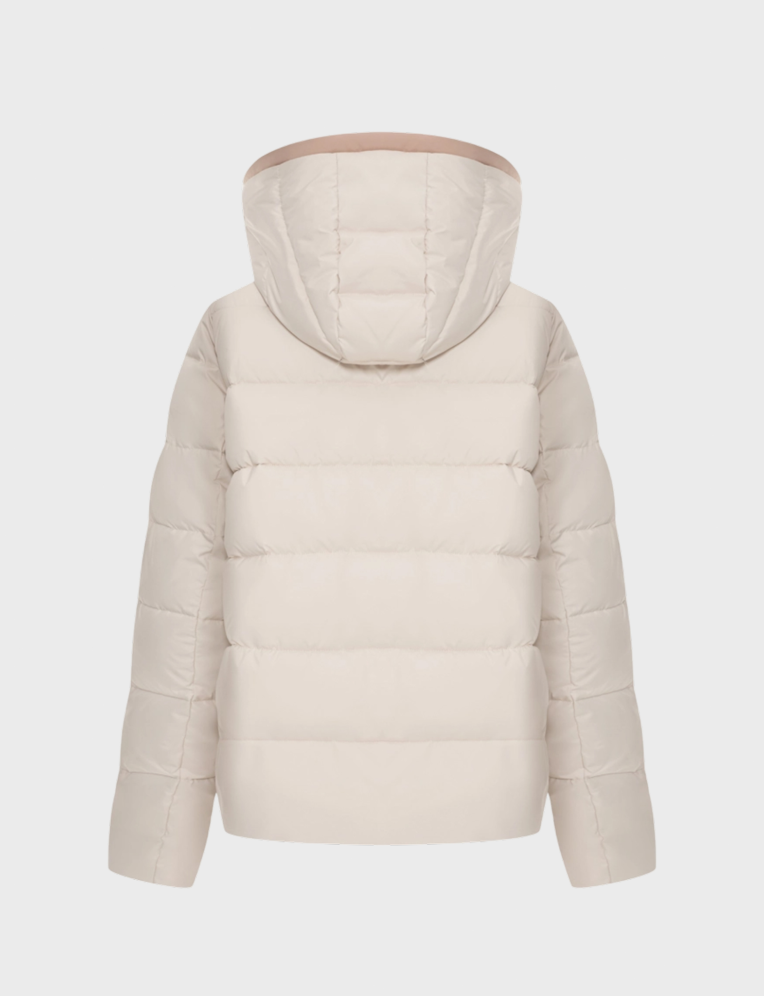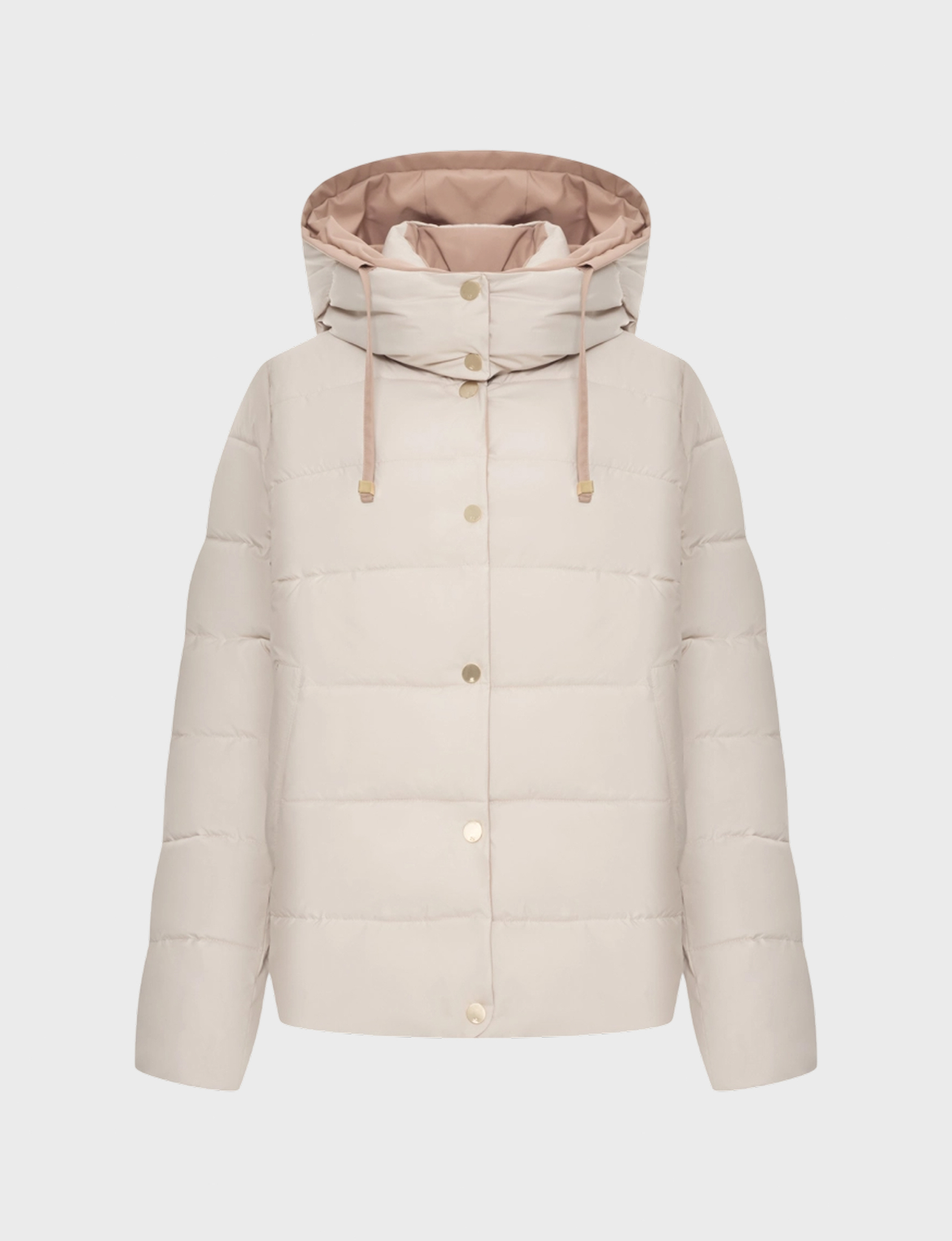 Двусторонняя утепленная куртка с капюшоном. Прямой силуэт. Стежка по одной из сторон. Воротник стойка дополнен съемным капюшоном на кнопках со шнурком. Капюшон можно перестегнуть на вторую сторону. Боковые карманы с листочками. Застежка на кнопки. Спинка немного удлинена.