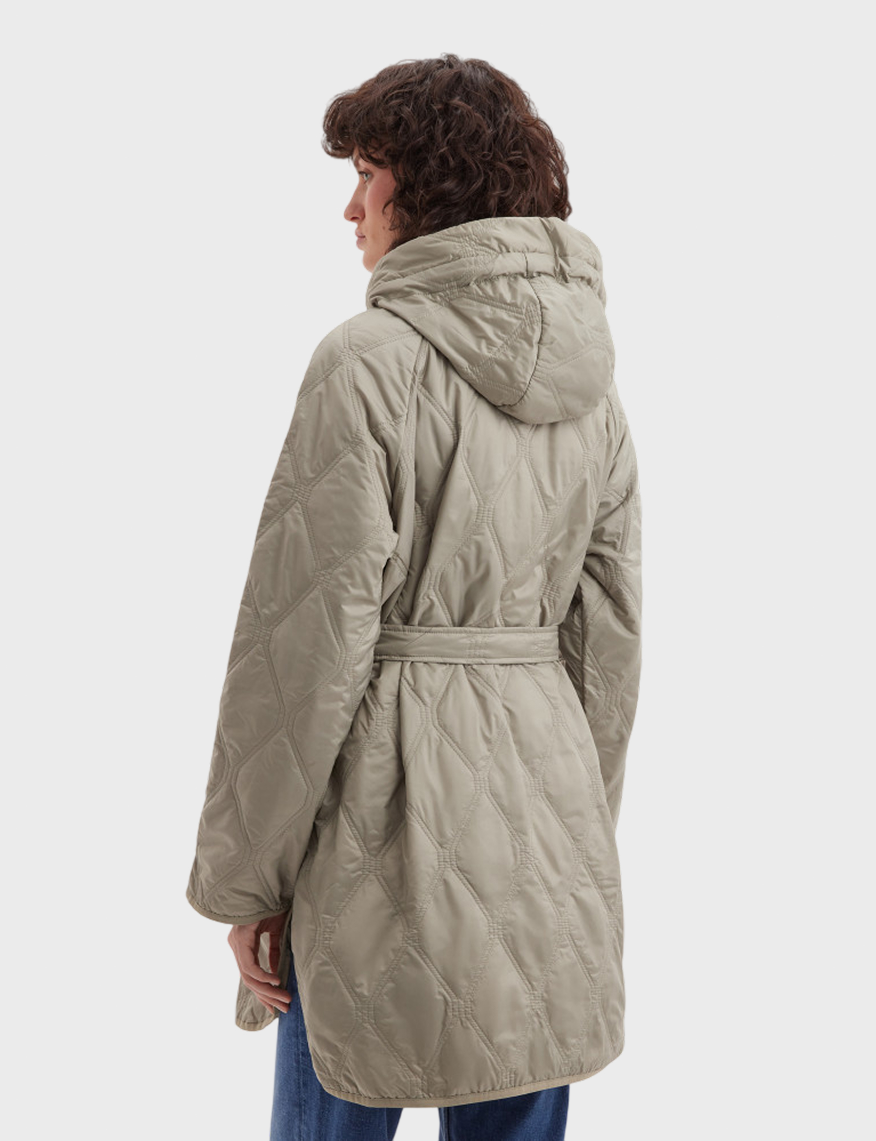 Свободная удлиненная куртка выделяется оригинальной фигурной стежкой и утонченным дизайном. Она выполнена с использованием ультралегкого утеплителя Сорона, что обеспечивает превосходное тепло без излишней тяжести. Несъемный капюшон добавляет дополнительный комфорт и защиту от неблагоприятных погодных условий, а пояс позволяет подчеркнуть линию талии, создавая более элегантный силуэт. Эта куртка идеально подходит для осенне-зимнего сезона, сочетая функциональность и стиль.