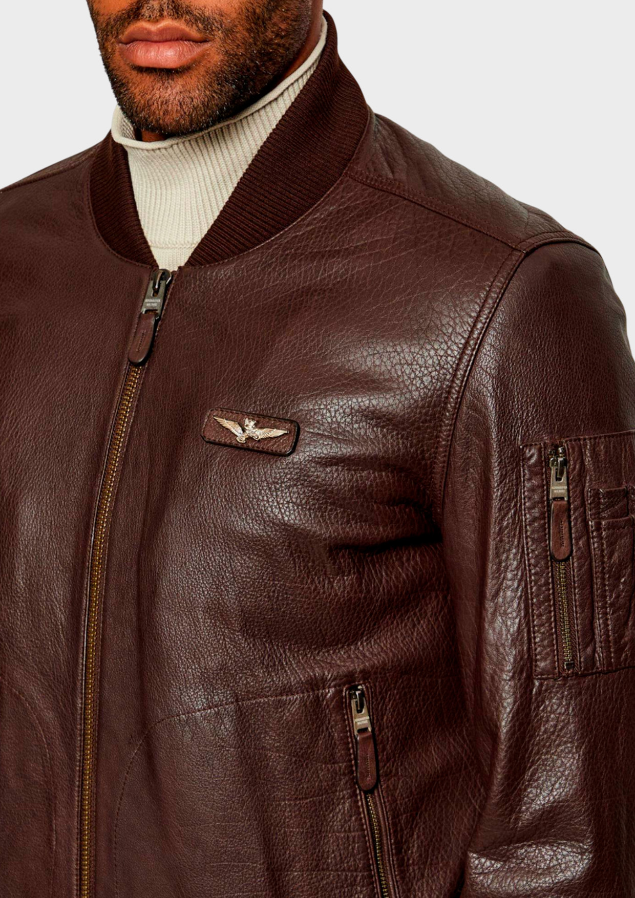 Мужская куртка-бомбер Aeronautica из натуральной кожи – стильный выбор уверенного в себе мужчины! Тёплая, прочная, элегантная: она защитит от непогоды и подчеркнёт статус. Тёмно-коричневый оттенок универсален и легко сочетается с классическими образами. Современный крой идеально сидит по фигуре, подчёркивая достоинства внешности.