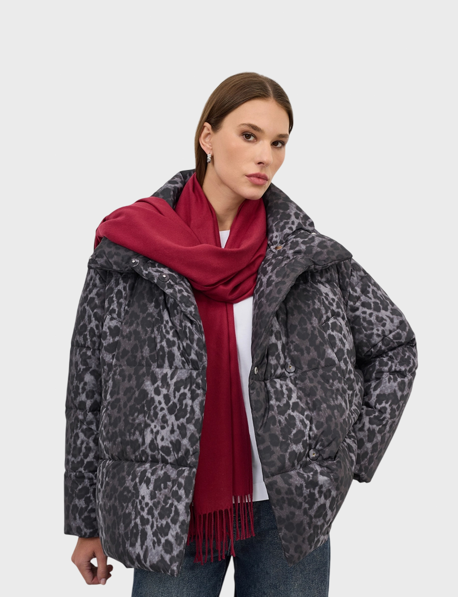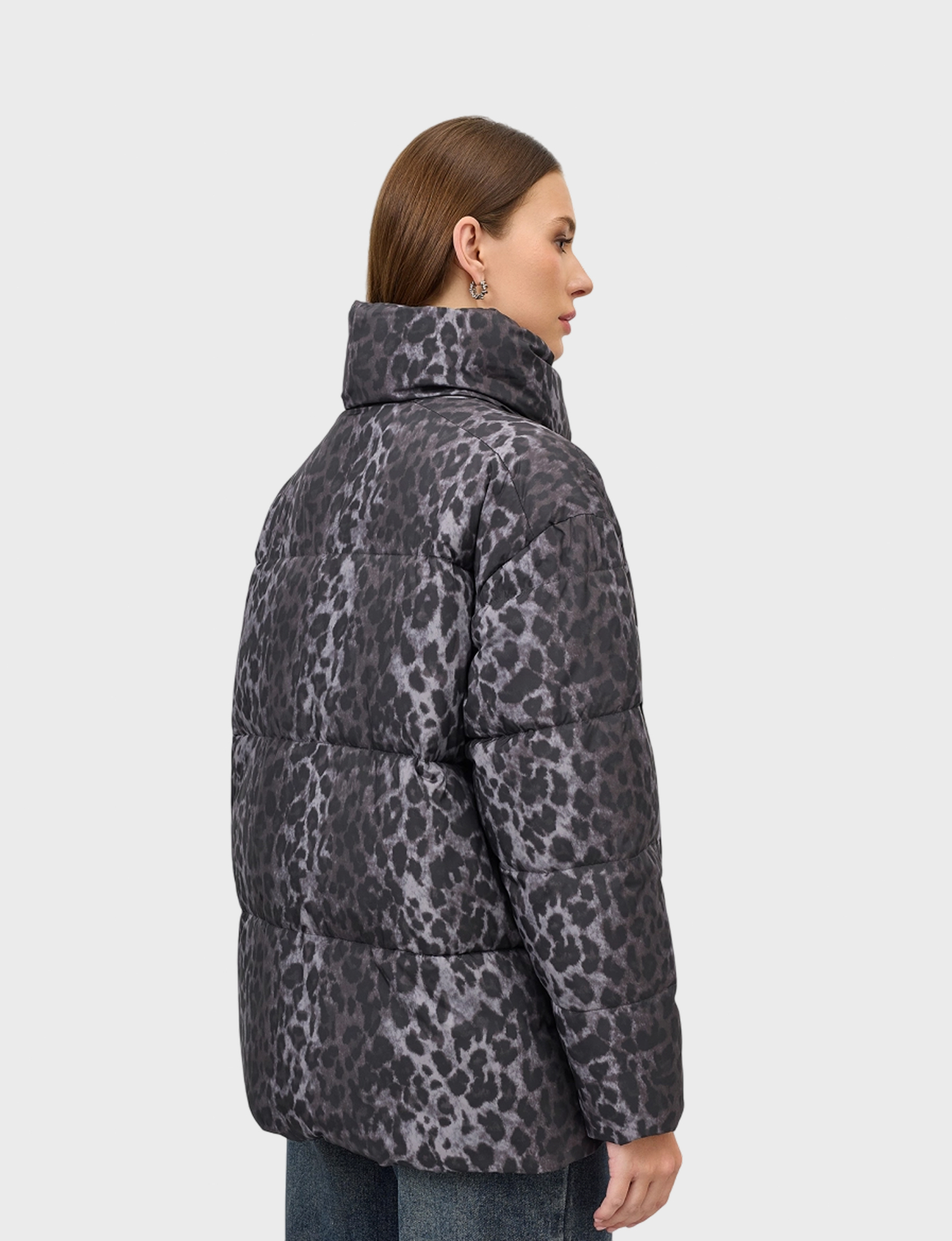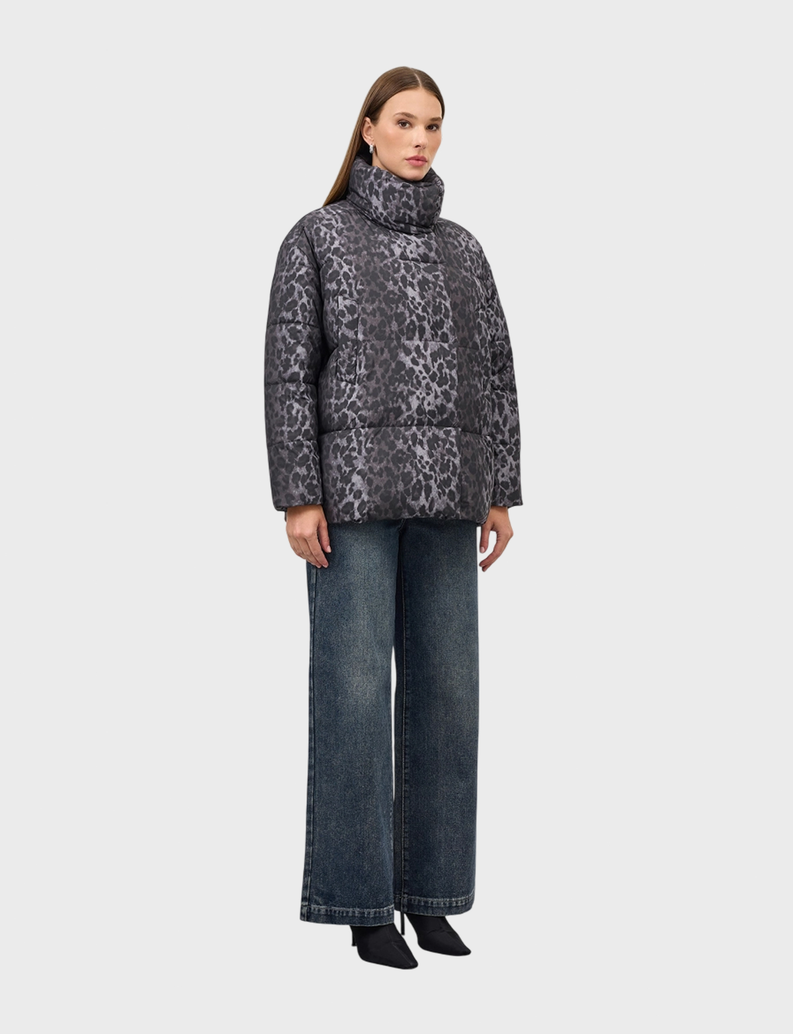 Яркая куртка с анималистичным принтом силуэта Oversize. Спущенная линия плеч. Воротник высокая стойка меняется на отложной. Застежка на кнопки. Боковые карманы с листочками. Кулиса по низу изделия для защиты от ветра.