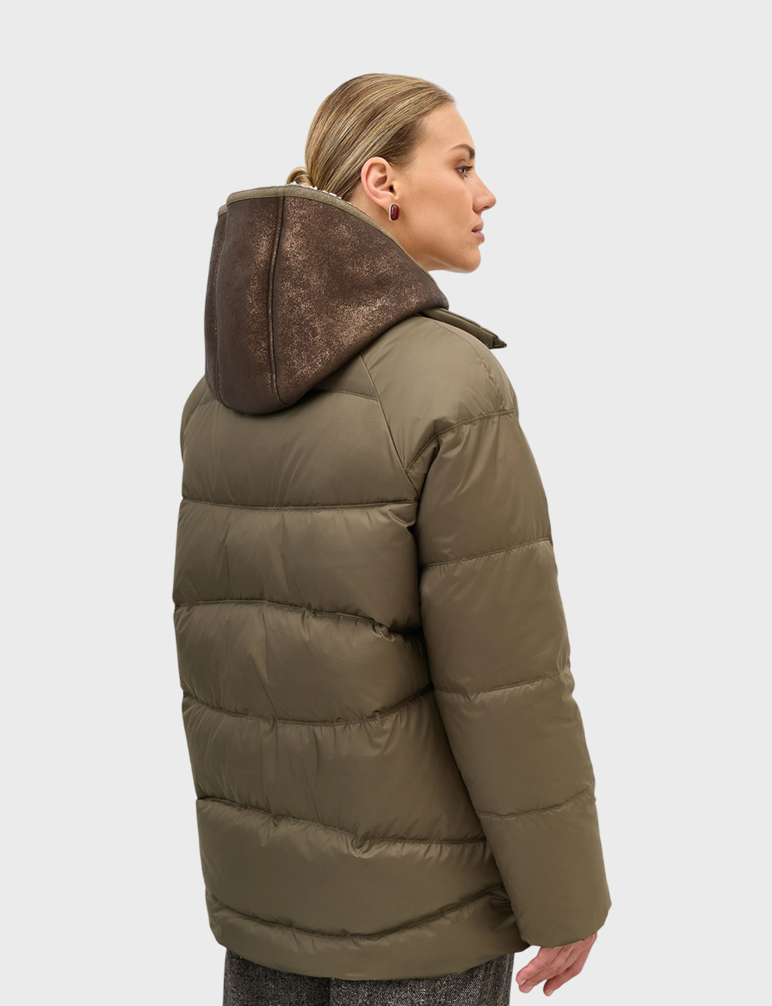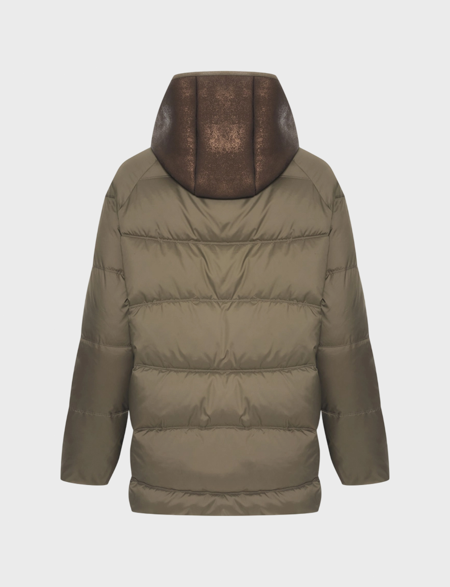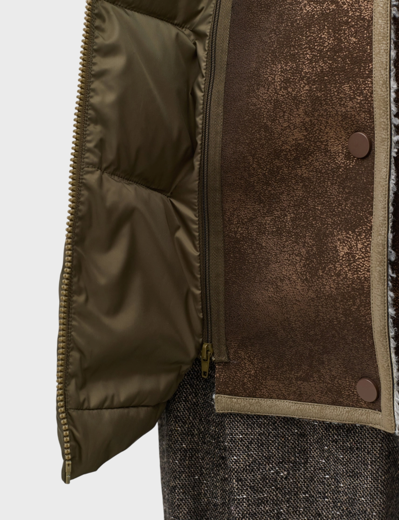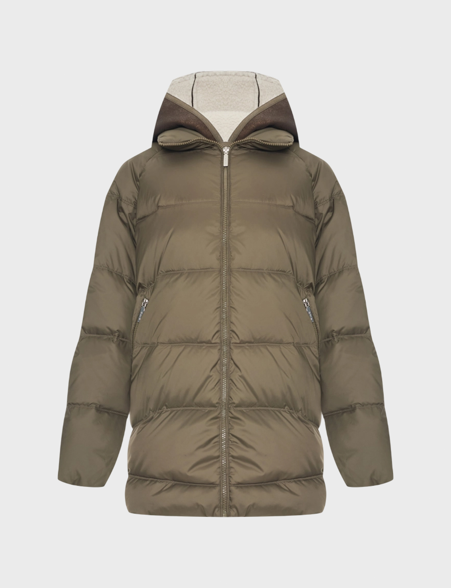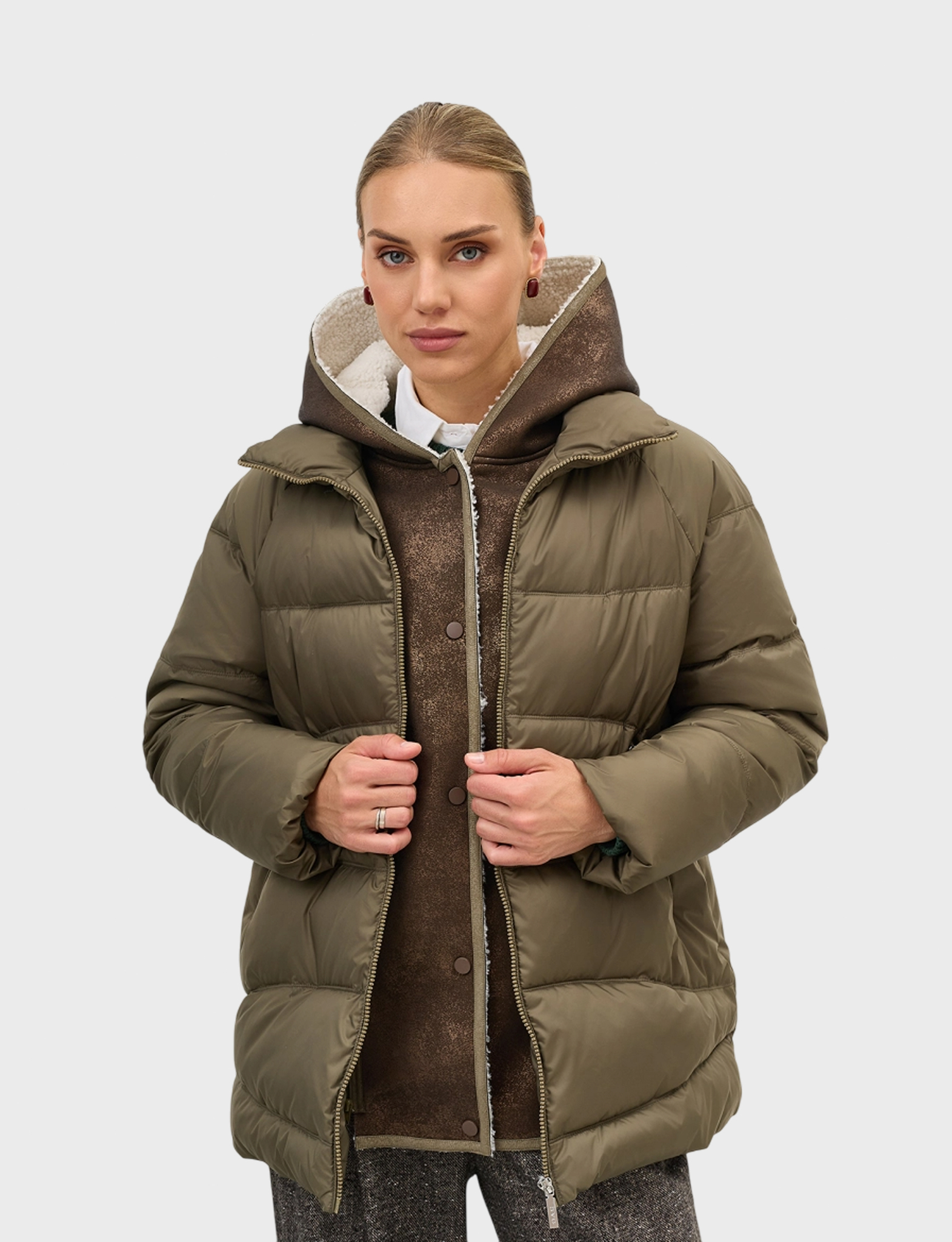 Удлиненная стеганная куртка. Свободный силуэт немного расширен к низу. Спущенная линия плеч. Боковые разрезы на потайных молниях. Застежка на молнию. Завышенные боковые карманы на молнии. Воротник стойка меняется на отложной воротник. Дополнена съемной манишкой из мягкой искуственной овчины на кнопках с капюшоном.