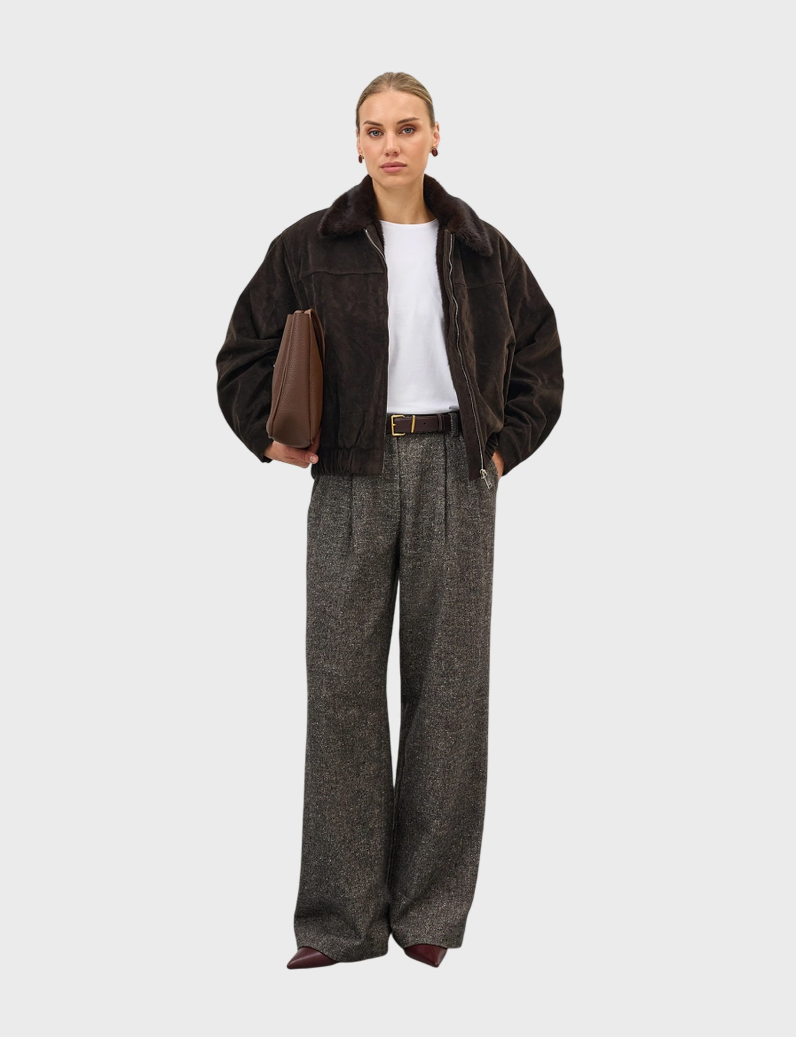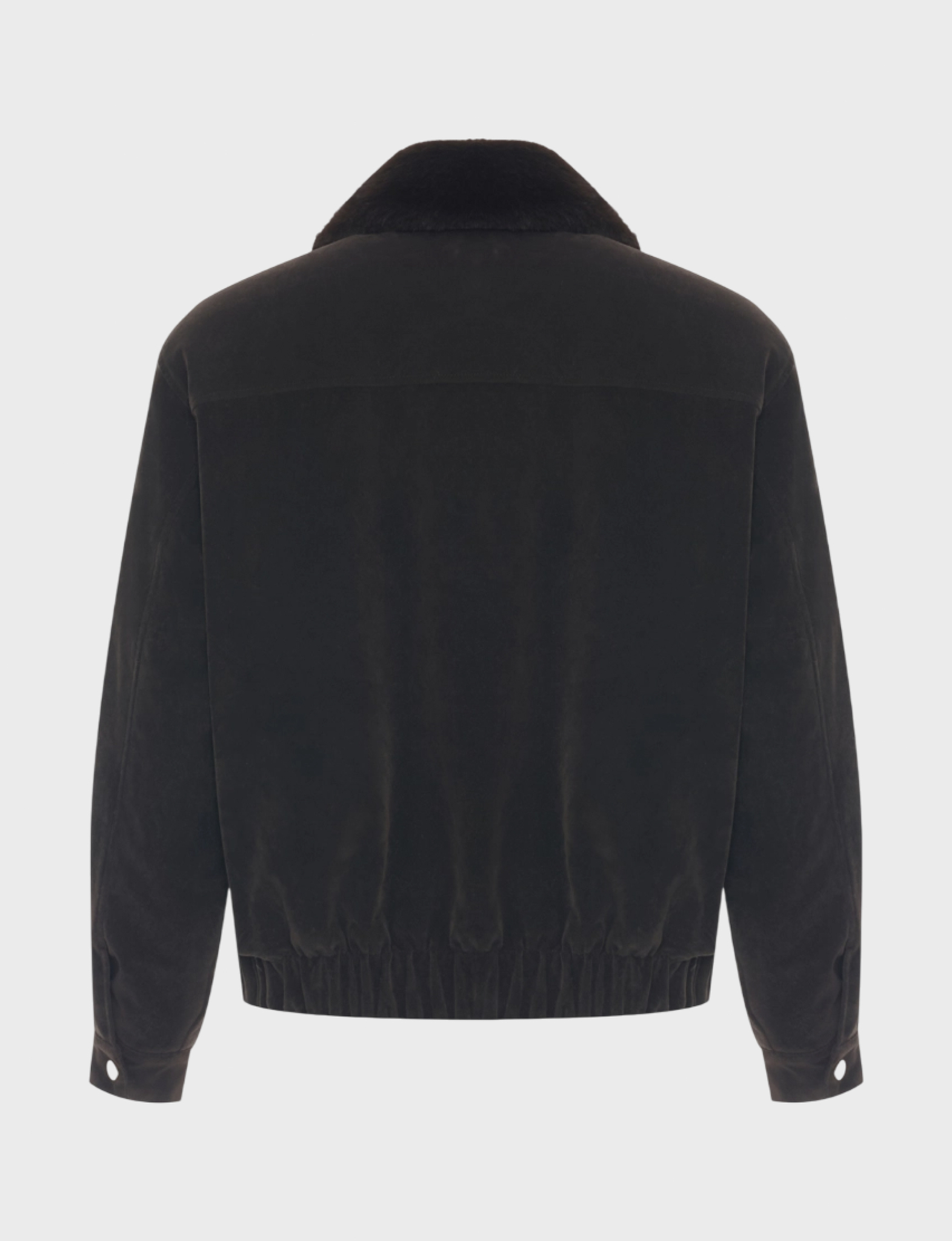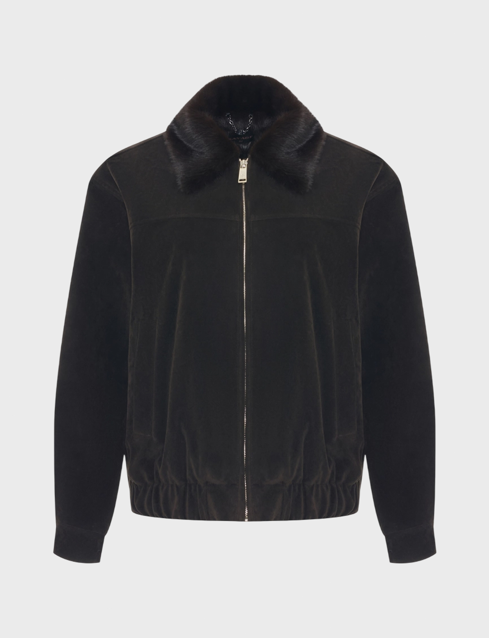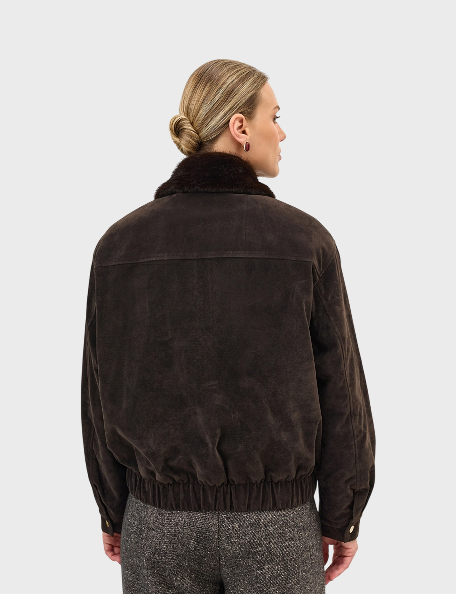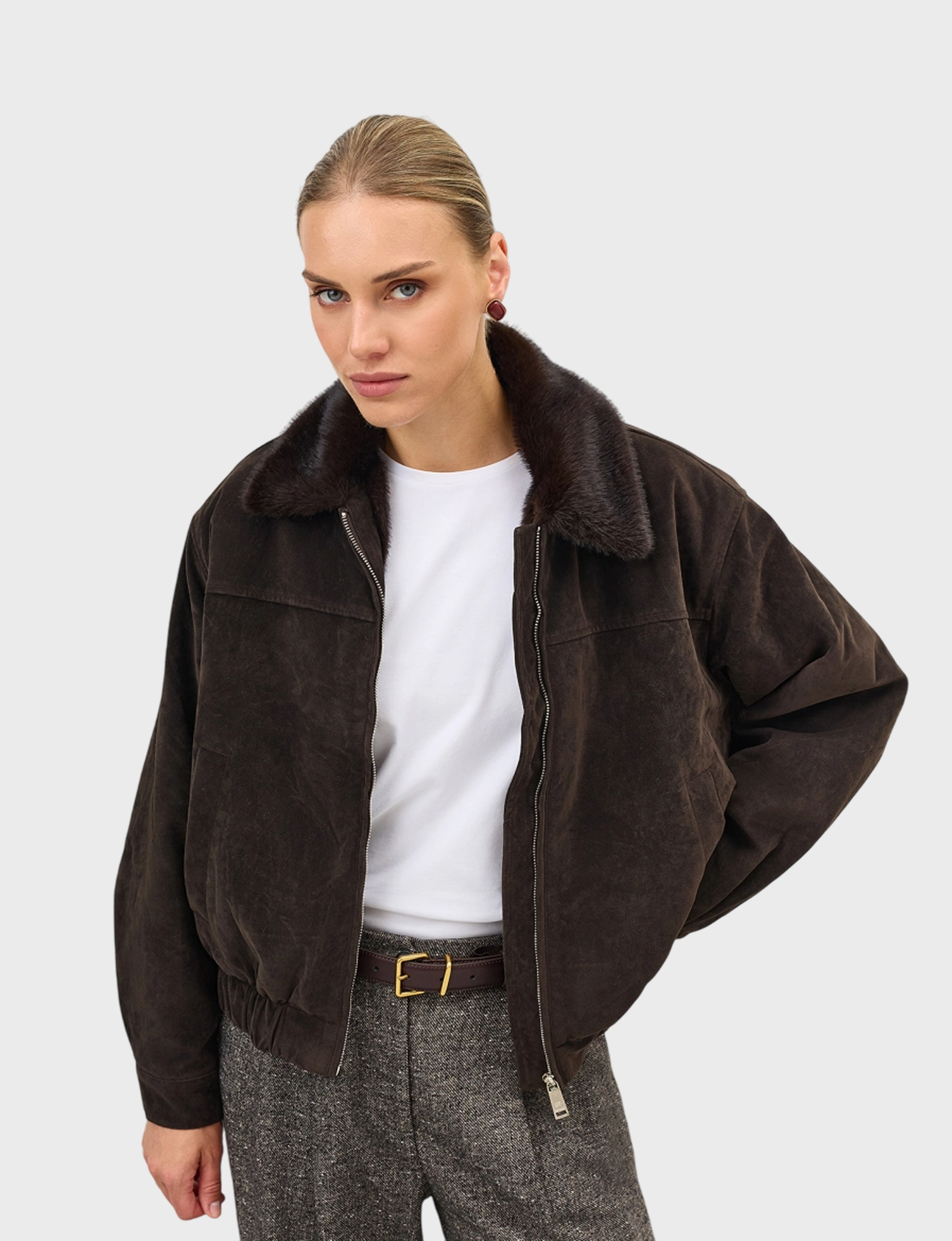 Замшевая укороченная куртка с воротником и подкладкой из искусственного меха норки. Свободный силуэт дополнен резинкой по низу изделия. Спущенная линия плеч. Застежка на молнию. Боковые карманы с листочками.