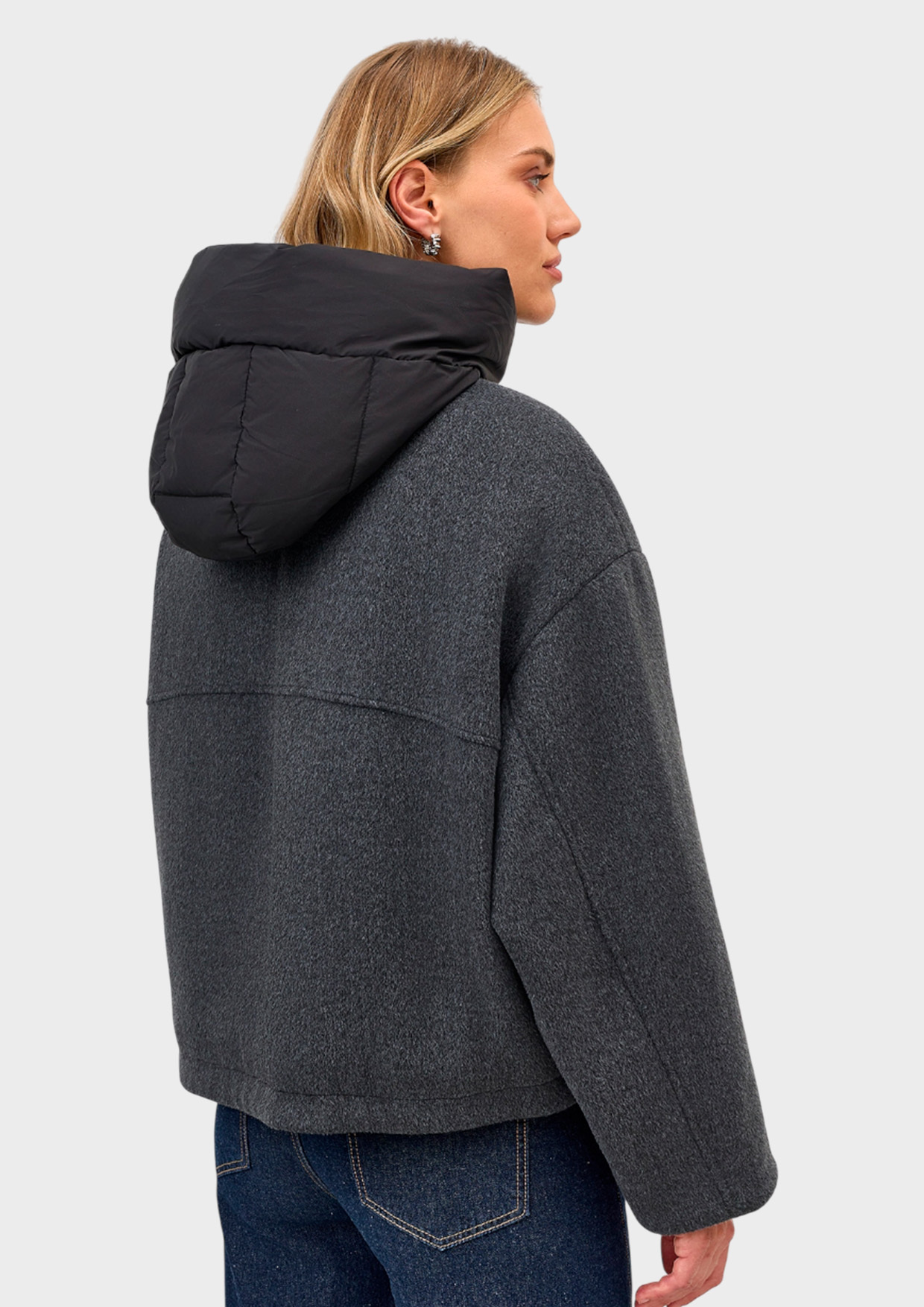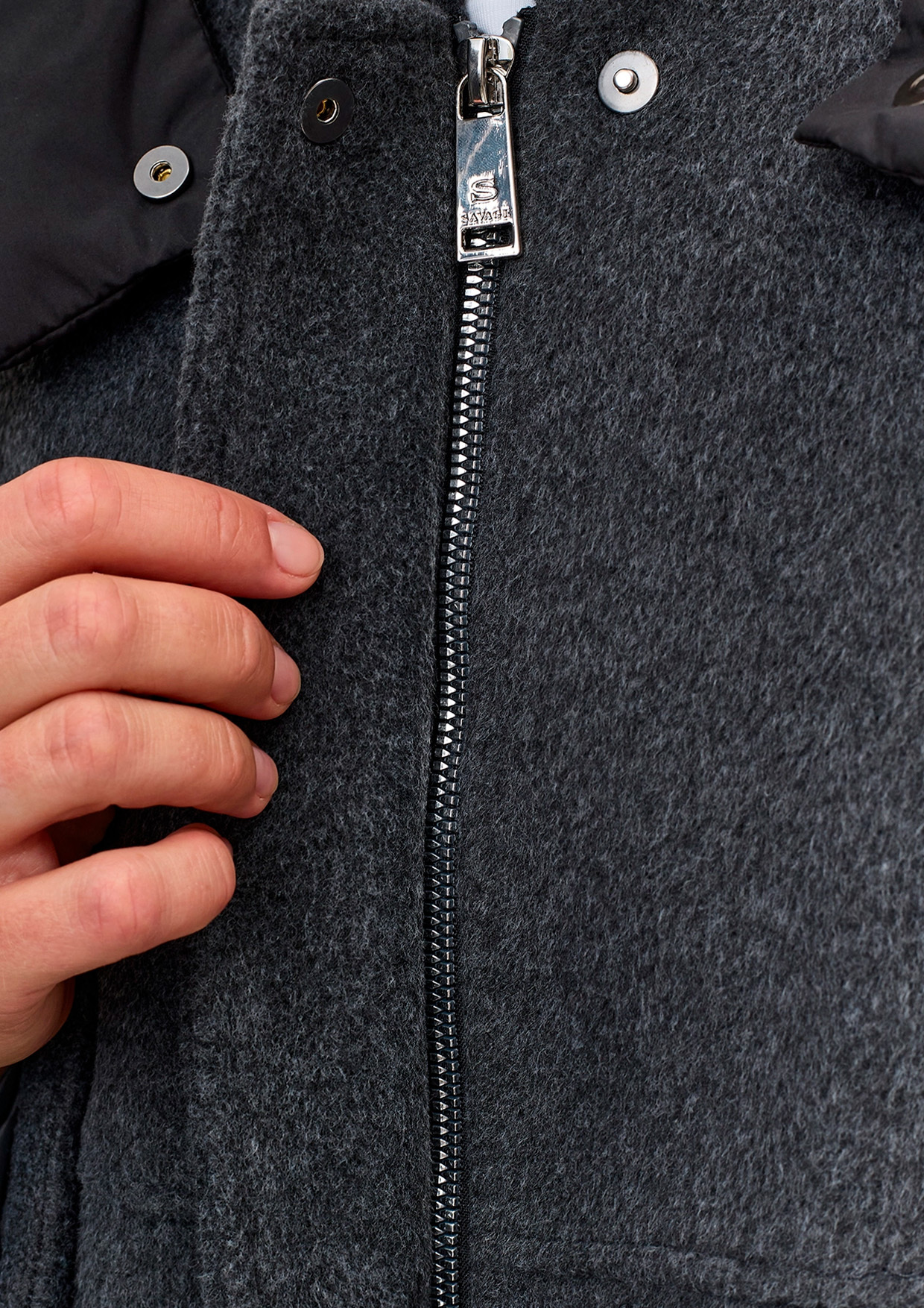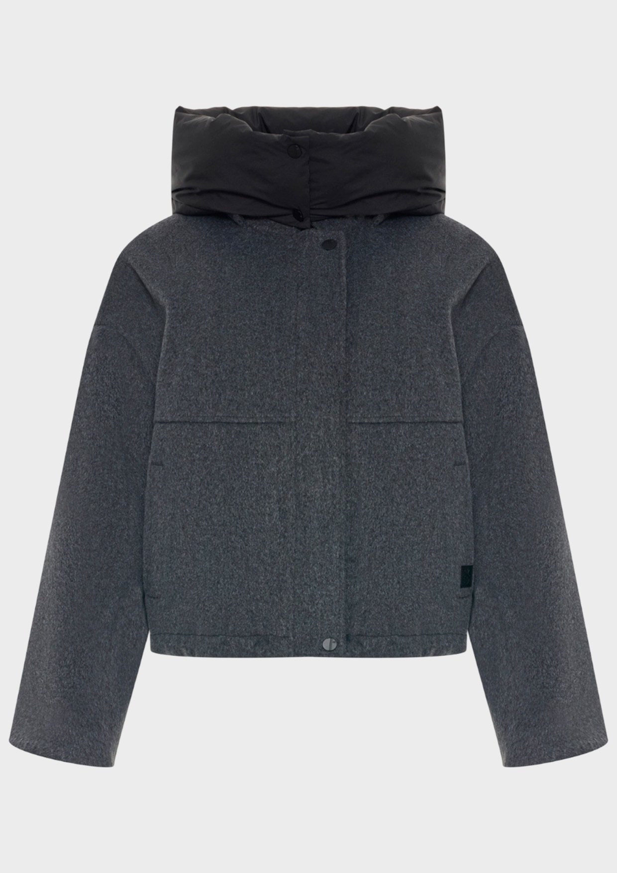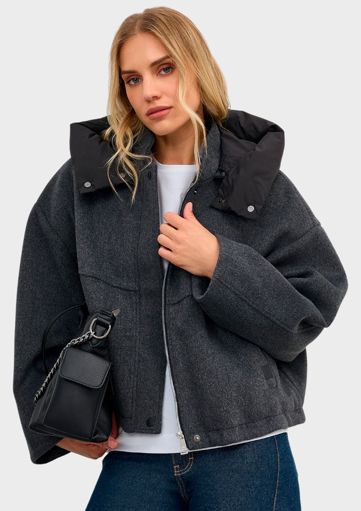 Укороченная куртка Oversize из ворсового текстиля с акцентным съемным капюшоном на кнопках. Свободный объемный силуэт. Спущенная линия плеч. Сборка и кулиса по низу изделия для защиты от ветра. Воротник стойка. Застежка на молнию и планку с кнопками.