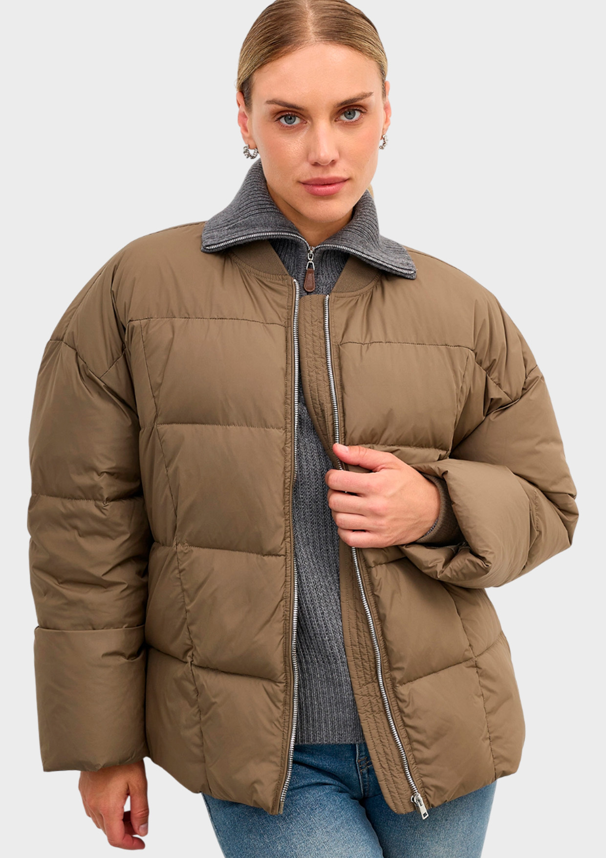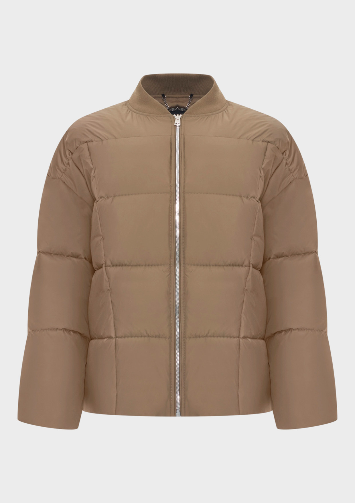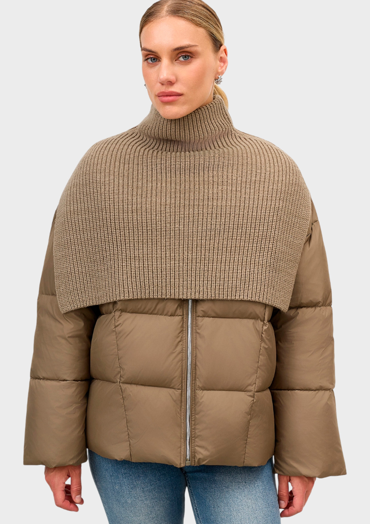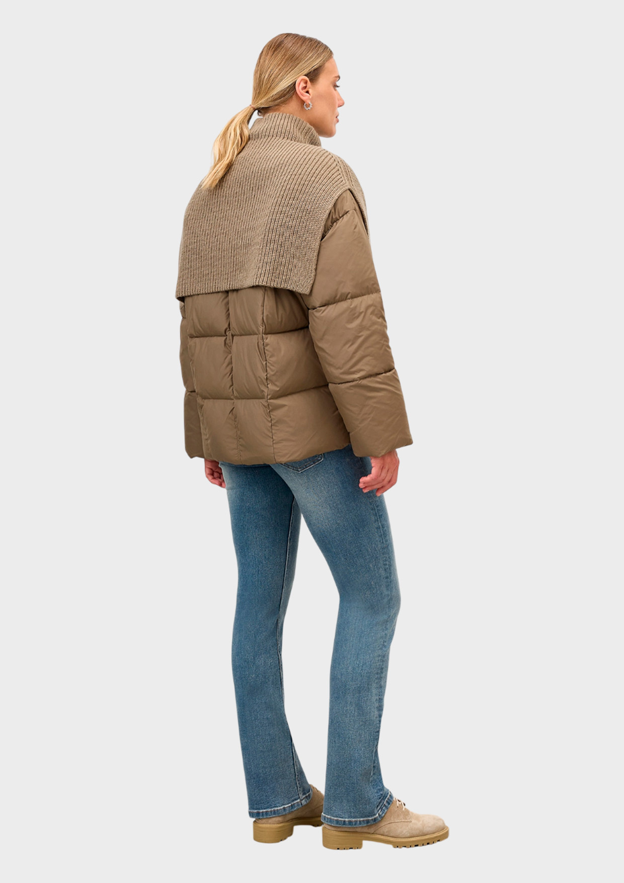 Утепленная куртка со съемной трикотажной манишкой в цвет. Квадратная стежка. Свободный силуэт. Спущенная линия плеч. Воротник небольшая стойка. Застежка на молнию. Боковые карманы на потайных молниях. Кулиса по низу изделия для защиты от ветра.