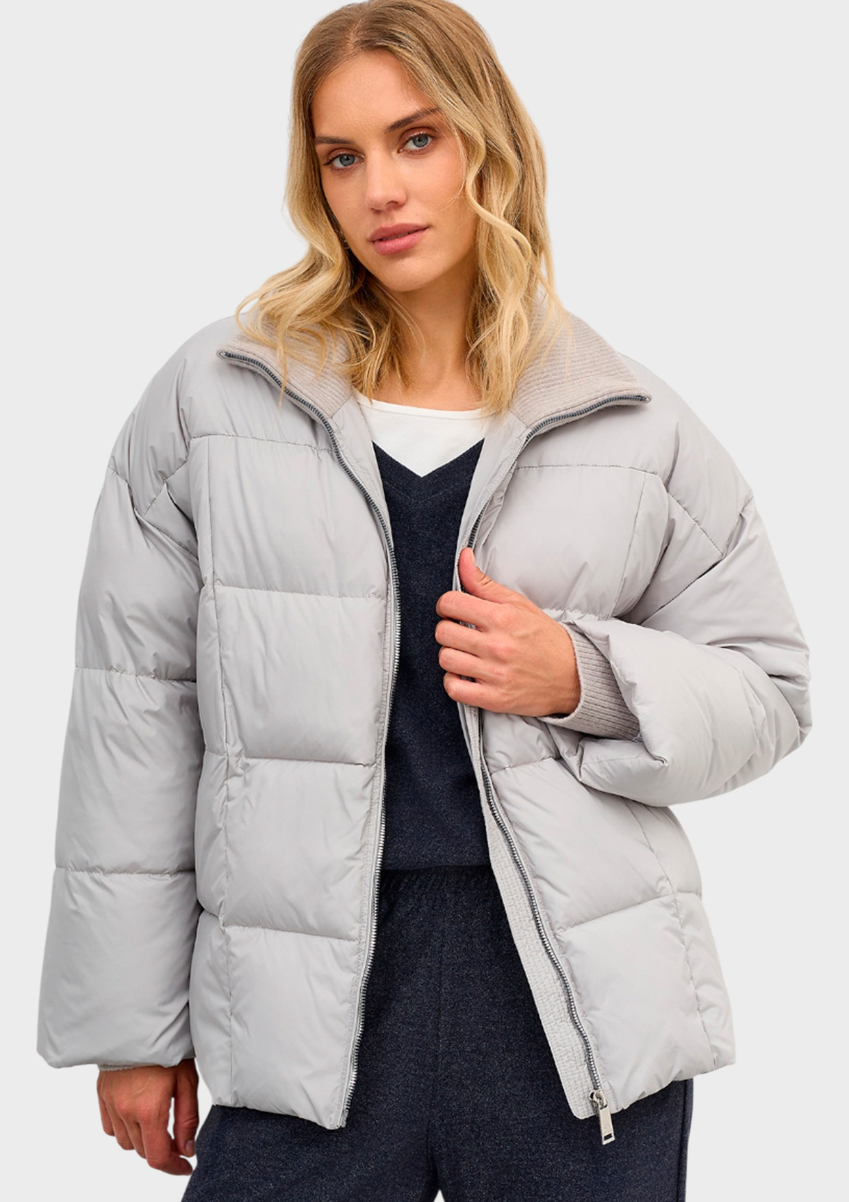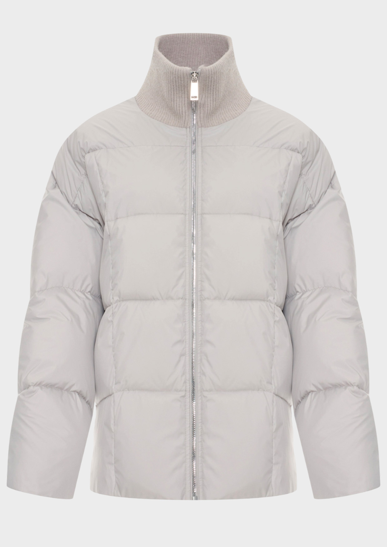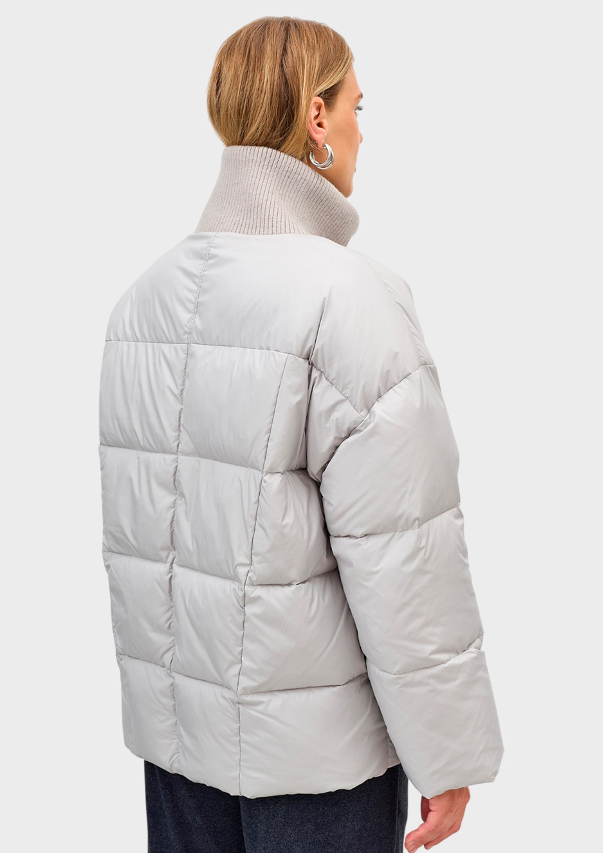 Свободная куртка с трикотажным воротником. Силуэт Oversize. Спущенная линия плеч. Высокий трикотажный воротник стойка. Боковые карманы. Застежка на молнию.