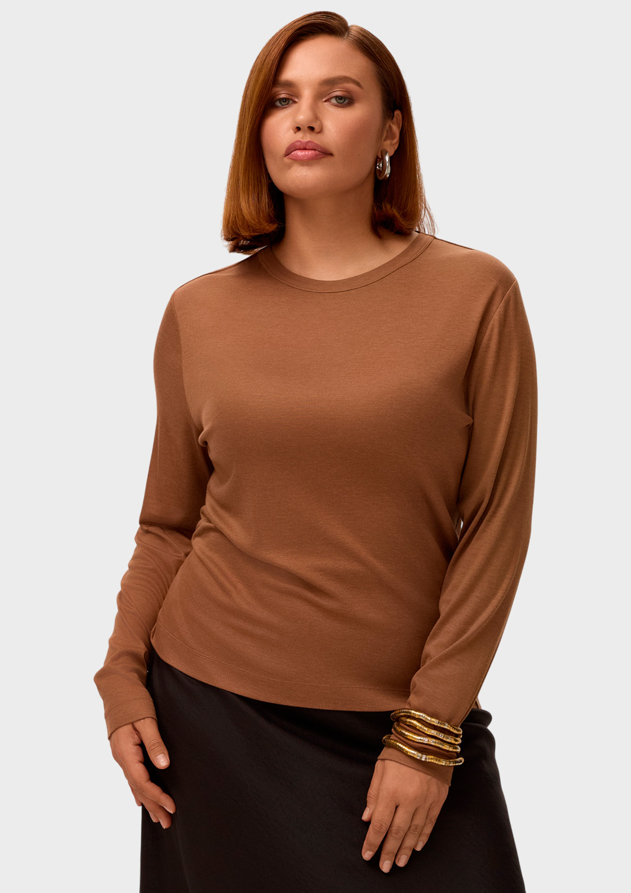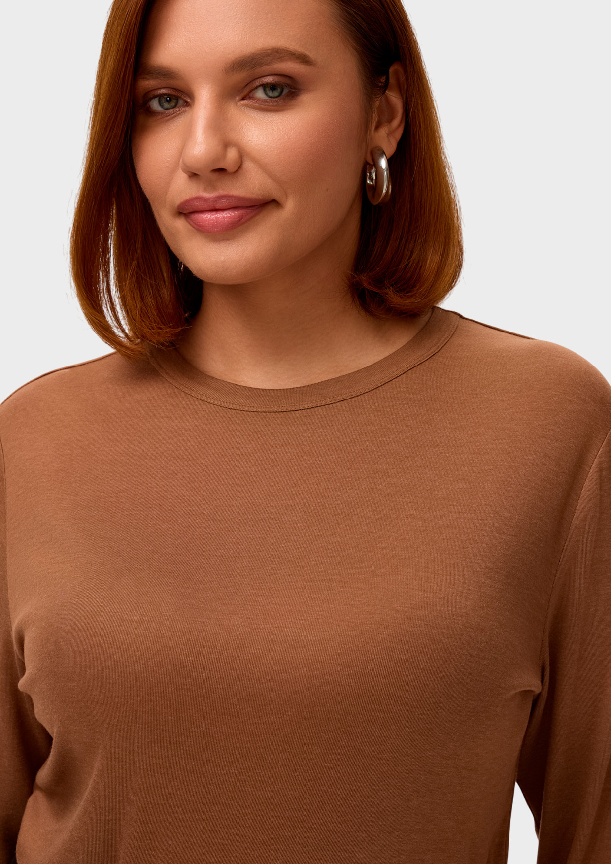Лонгслив в актуальном светло-коричневом будет прекрасным дополнением к джинсам и брюкам из коллекции, а также под пиджак.