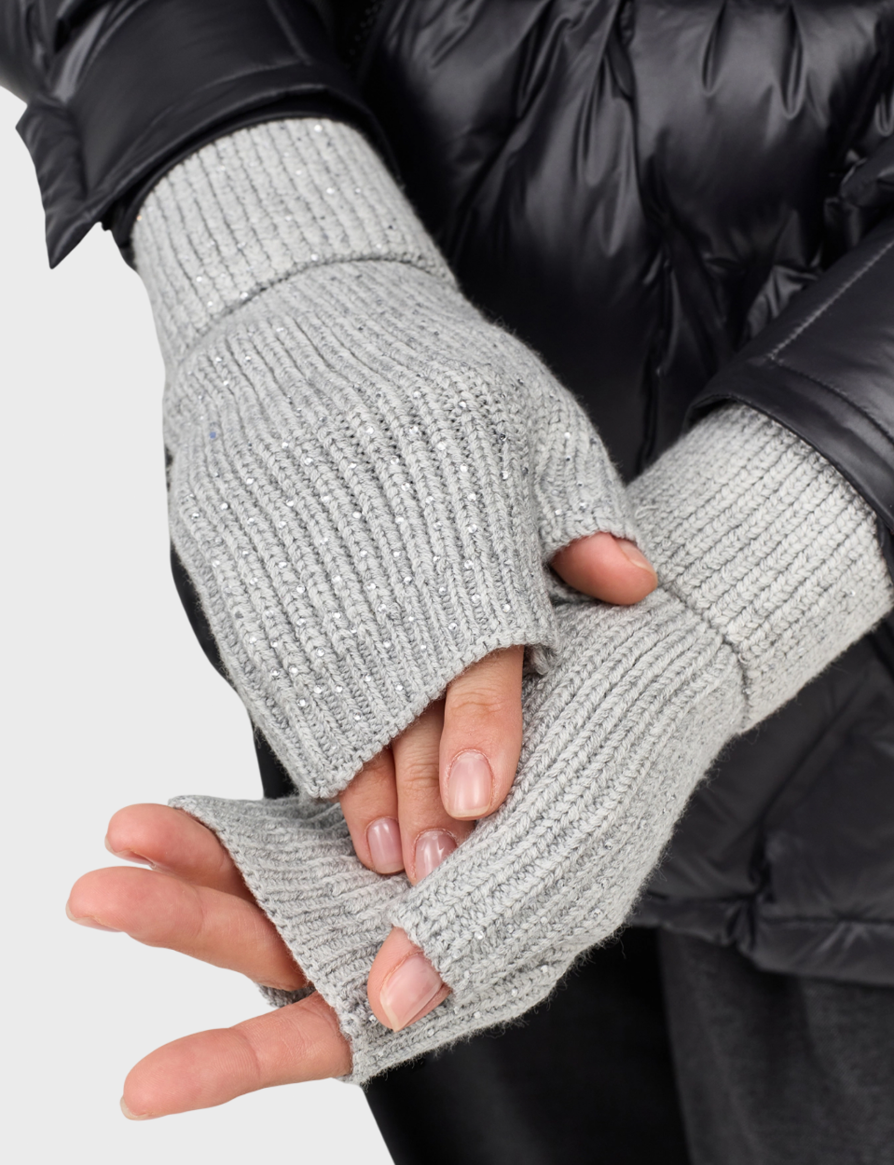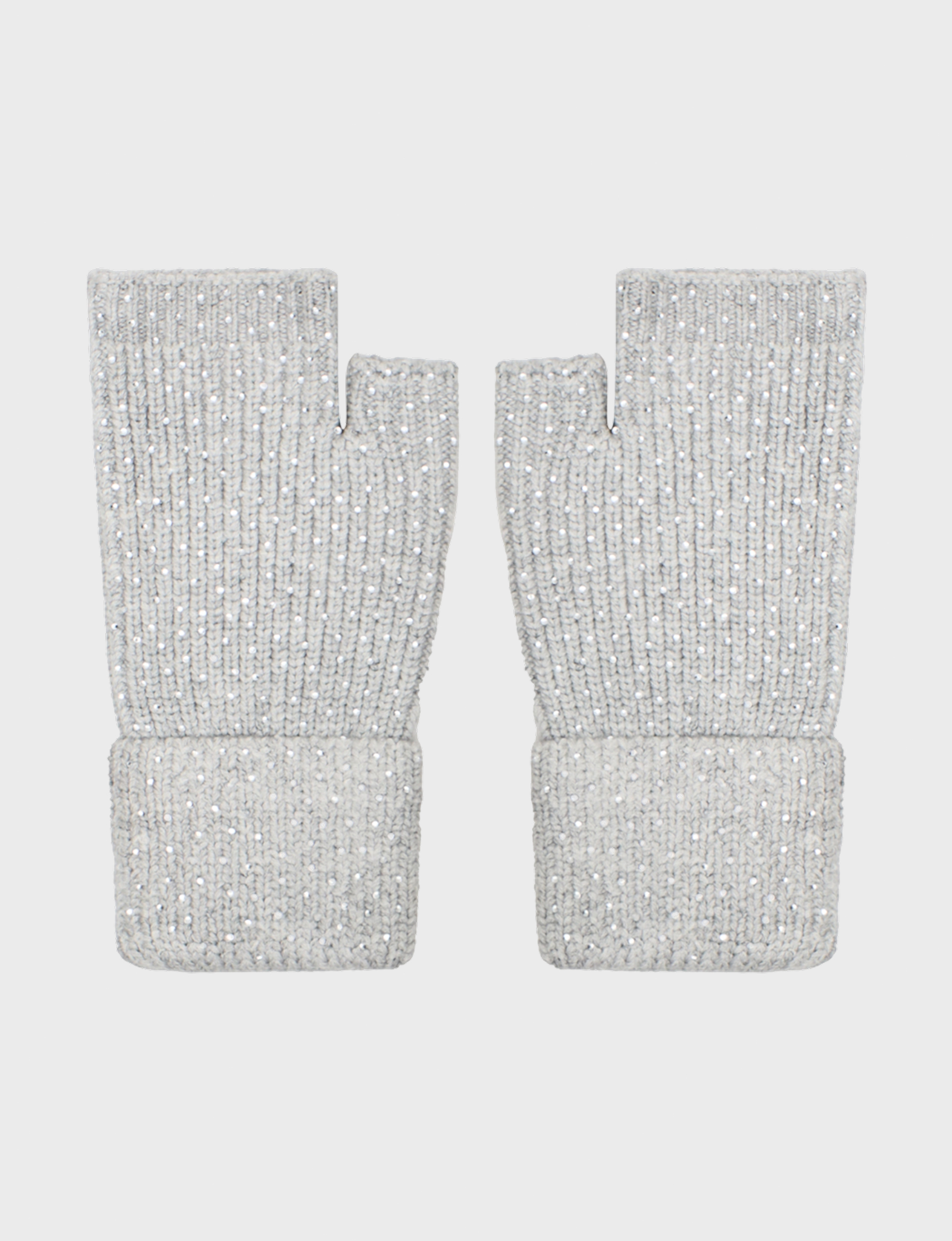 Вязаные варежки-митенки из пряжи с добавлением шерсти. Эластичные трикотажные манжеты и резинка вокруг пальцев. Украшены деликатными бусинками.