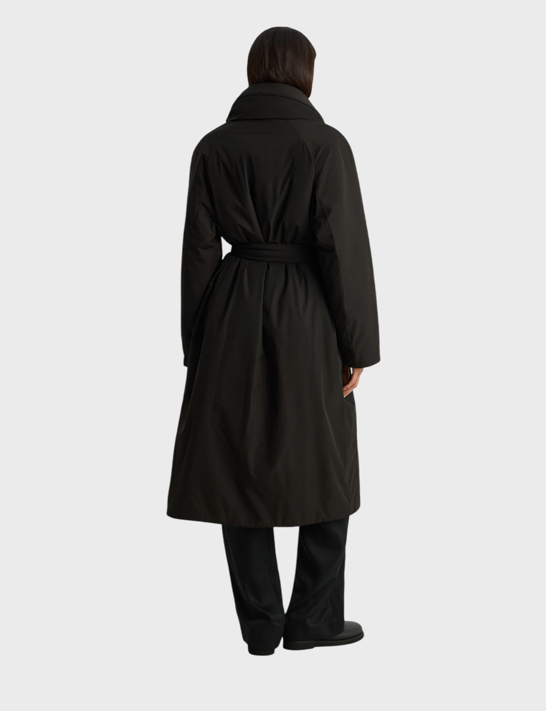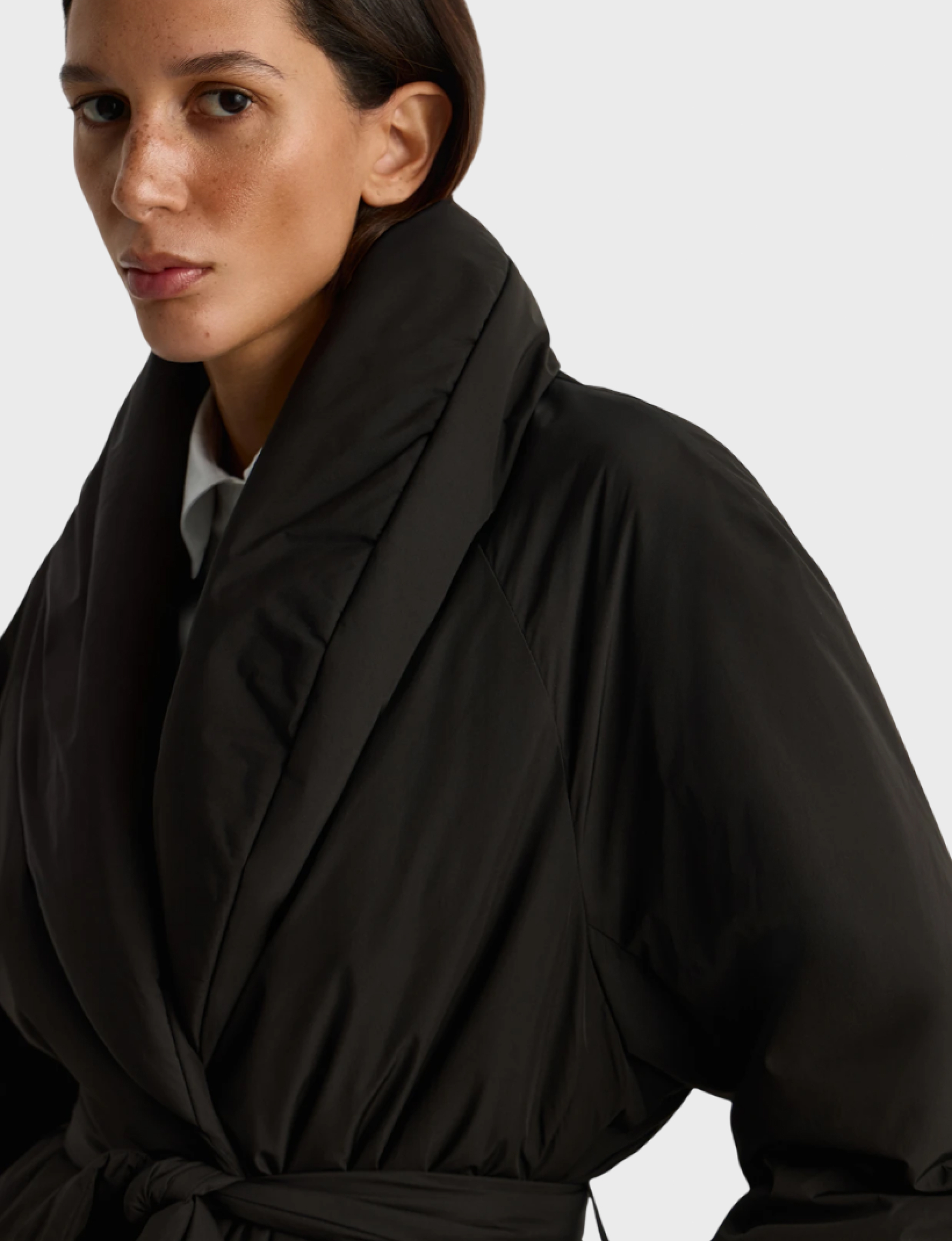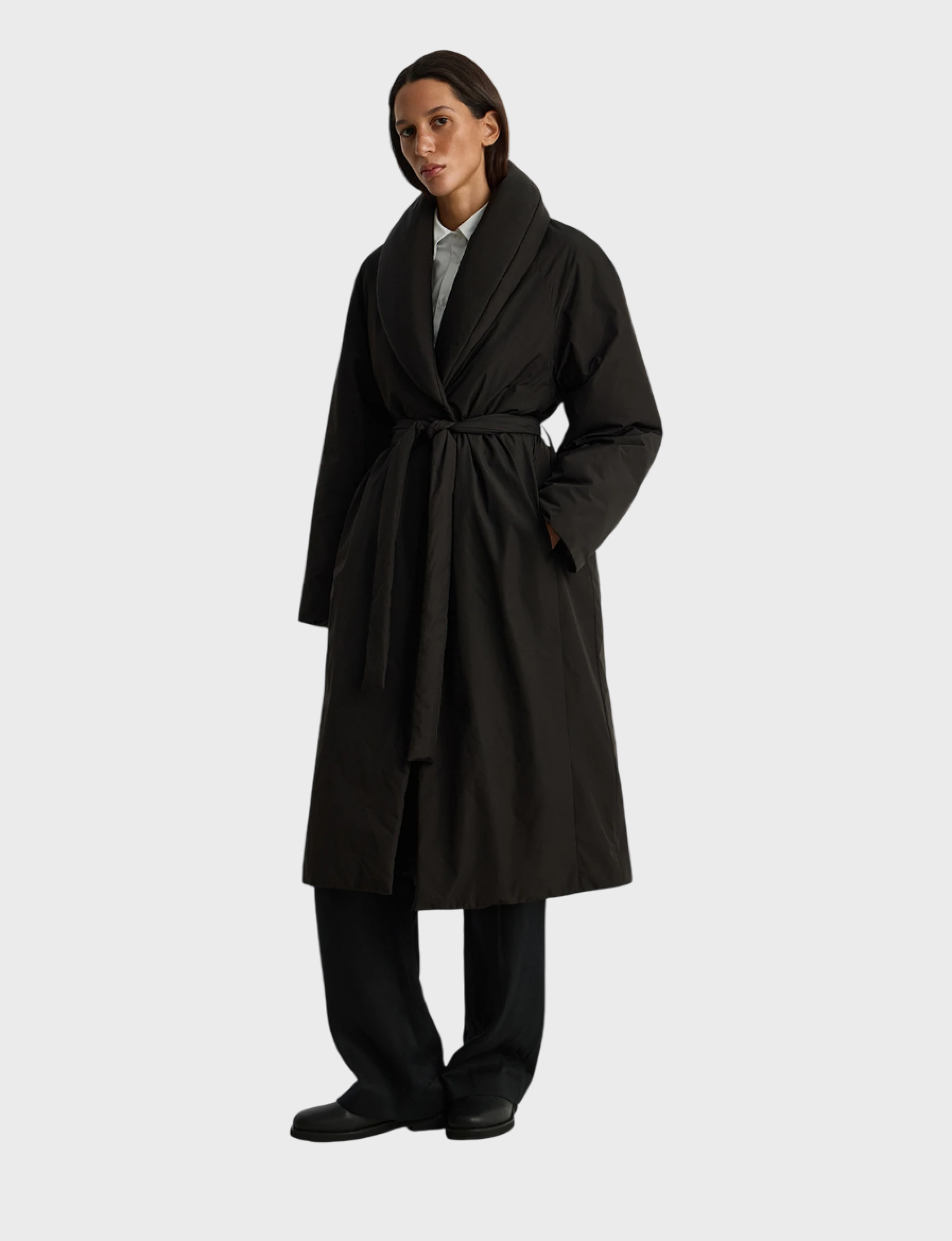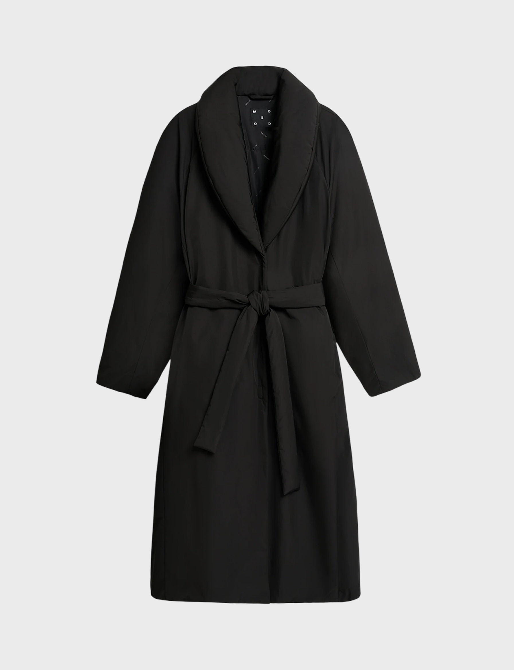 Облегченное пальто с отложным шалевым воротником, мягким рукавом реглан и поясом на талии. Удлиненная модель на воздушном синтепоне. Детали: карманы в боковых швах, вышивка на спинке и застежка на потайные магниты. Изделие выполнено из переработанного полиэстера — тонкого материала с водоотталкивающим эффектом.