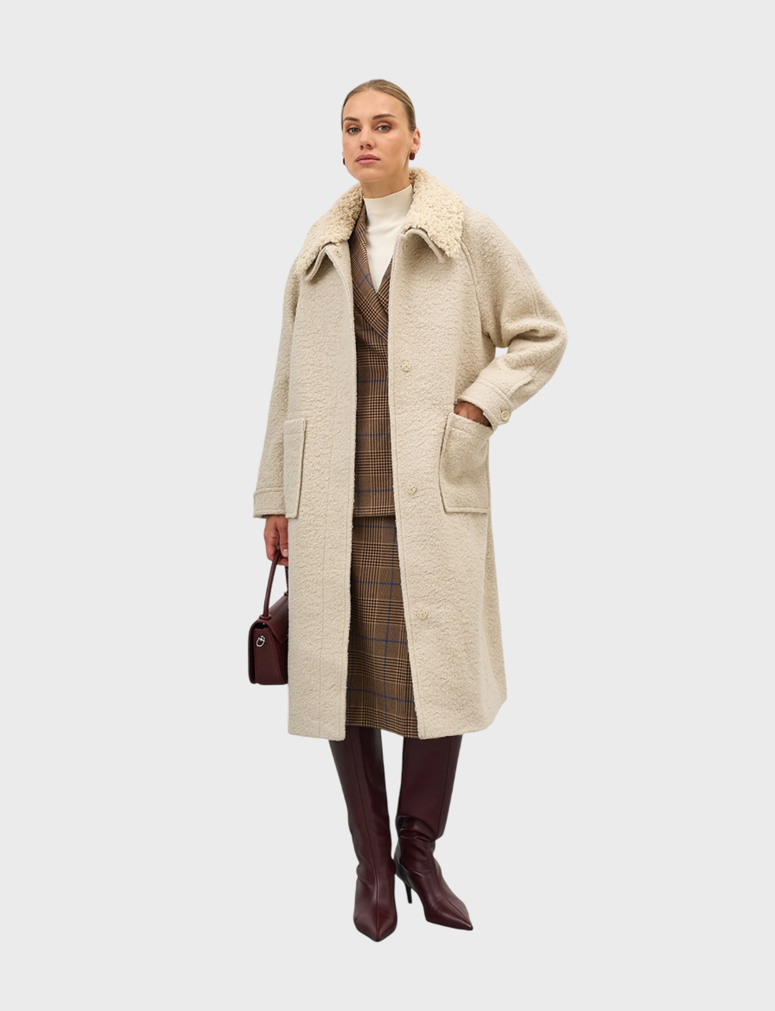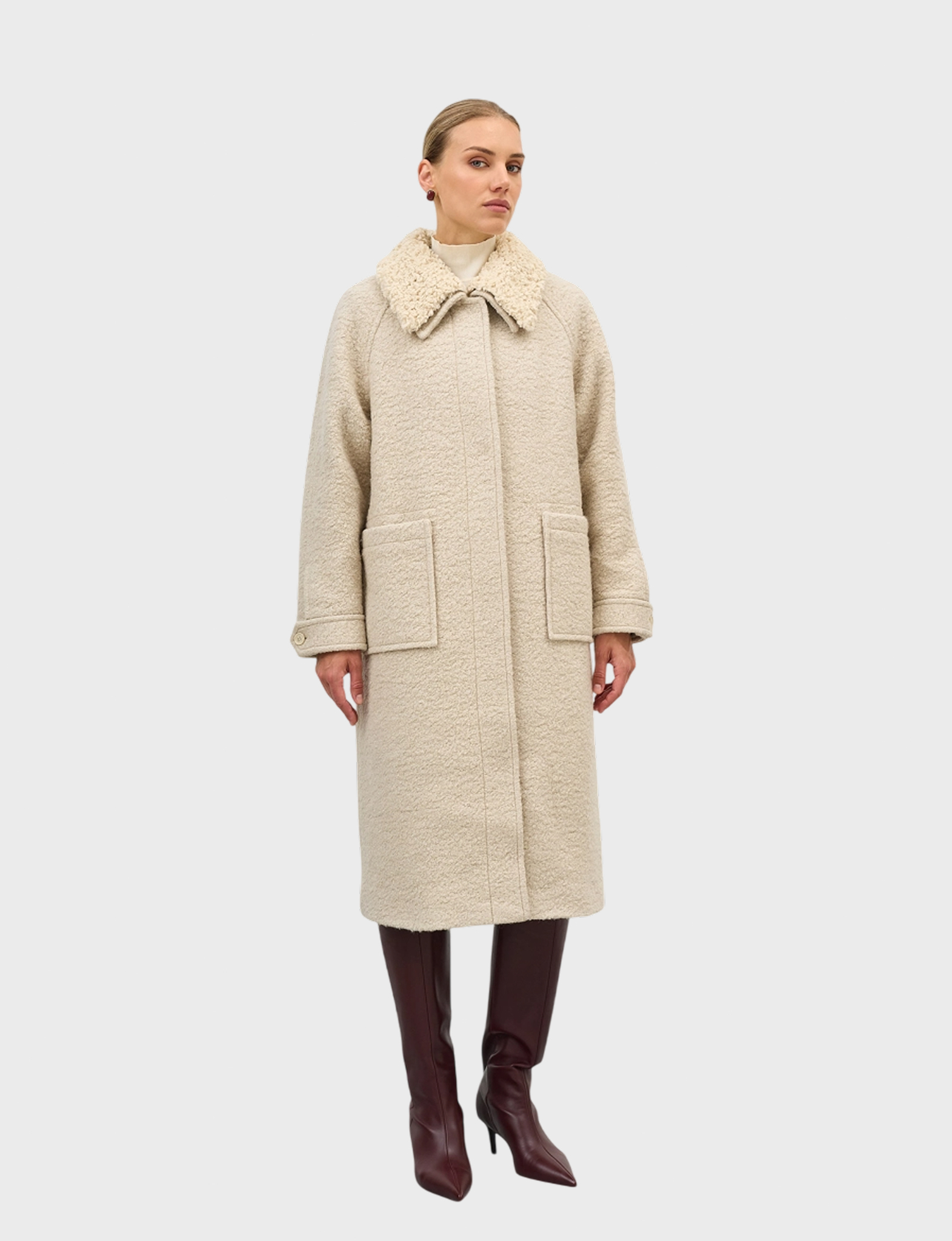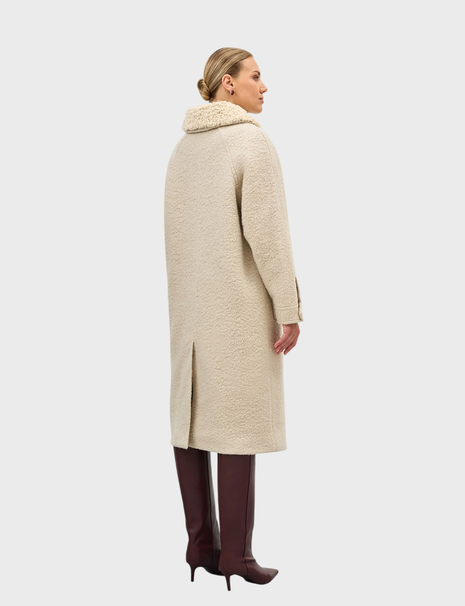 Шерстяное пальто с искуственным мехом из фактурной ткани с эфеектом букле. Свободный силуэт. Рукава реглан с манжетами и патами по низу. Накладные боковые карманы. Отложной воротник из съемного искусственного меха в цвет. Застежка на скрытые кнопки.