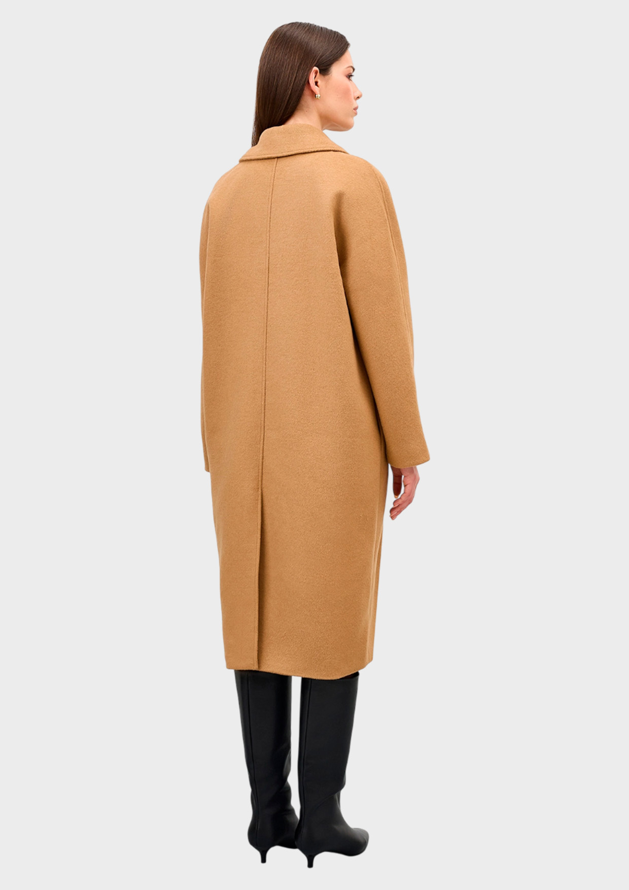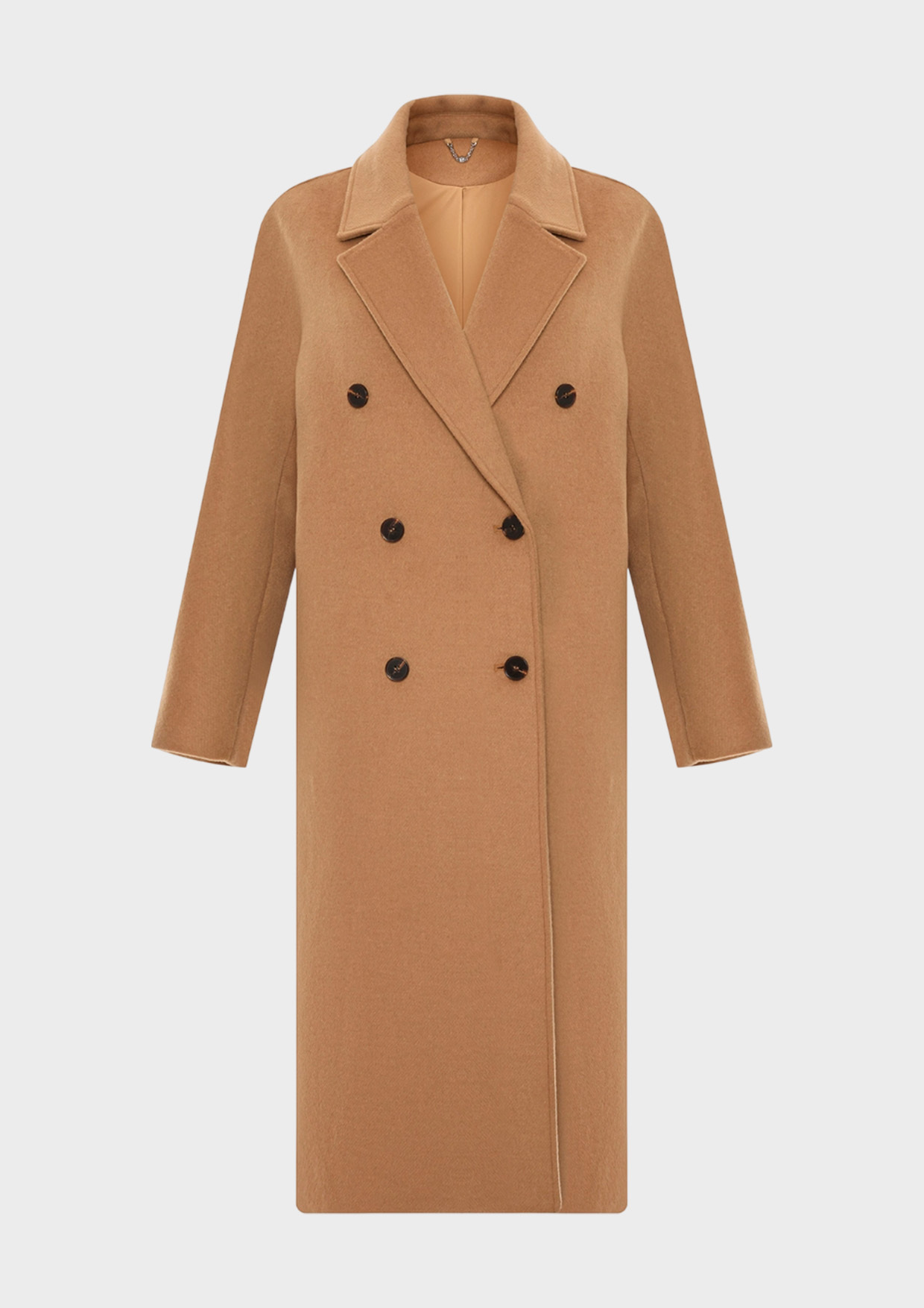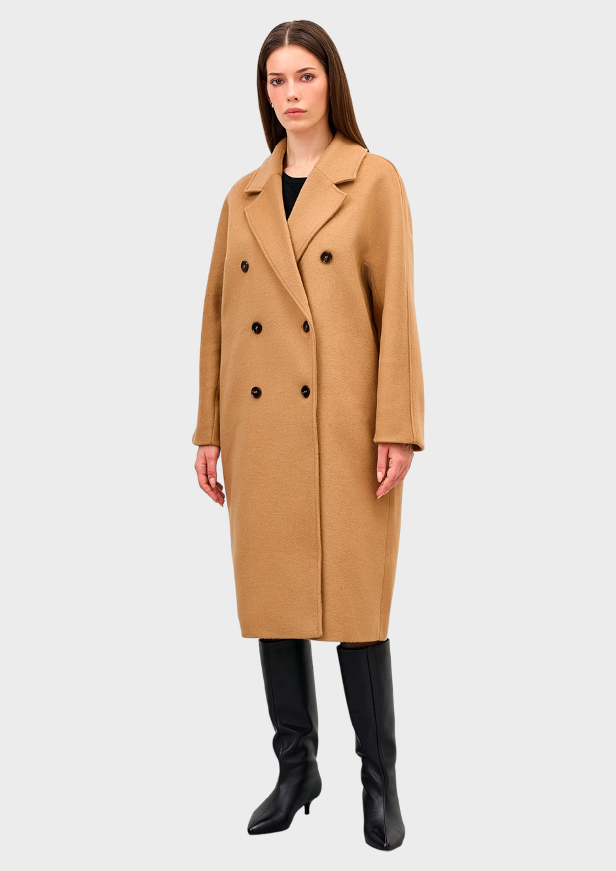 Двубортное пальто с шерстью в составе. Английский воротник с лацканами. Прямой силуэт. Боковые карманы. Застежка два ряда пуговиц.