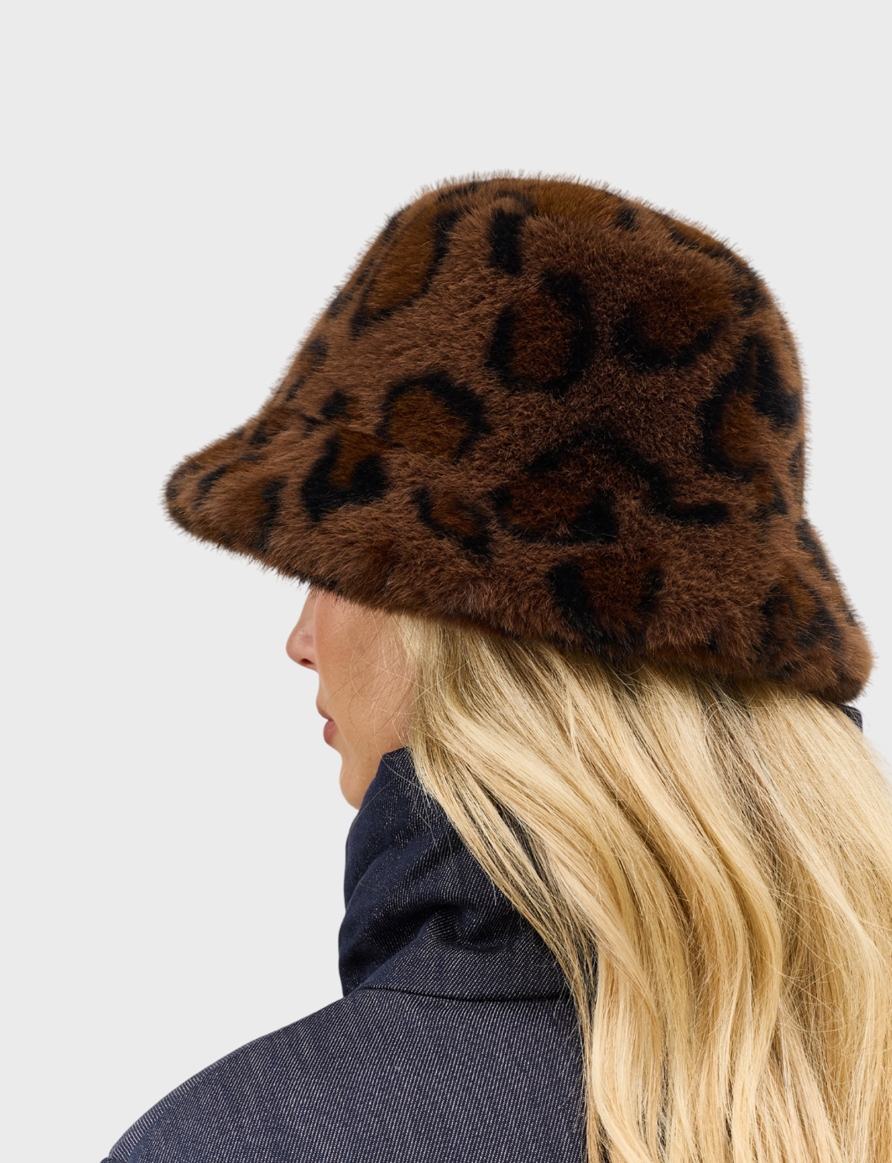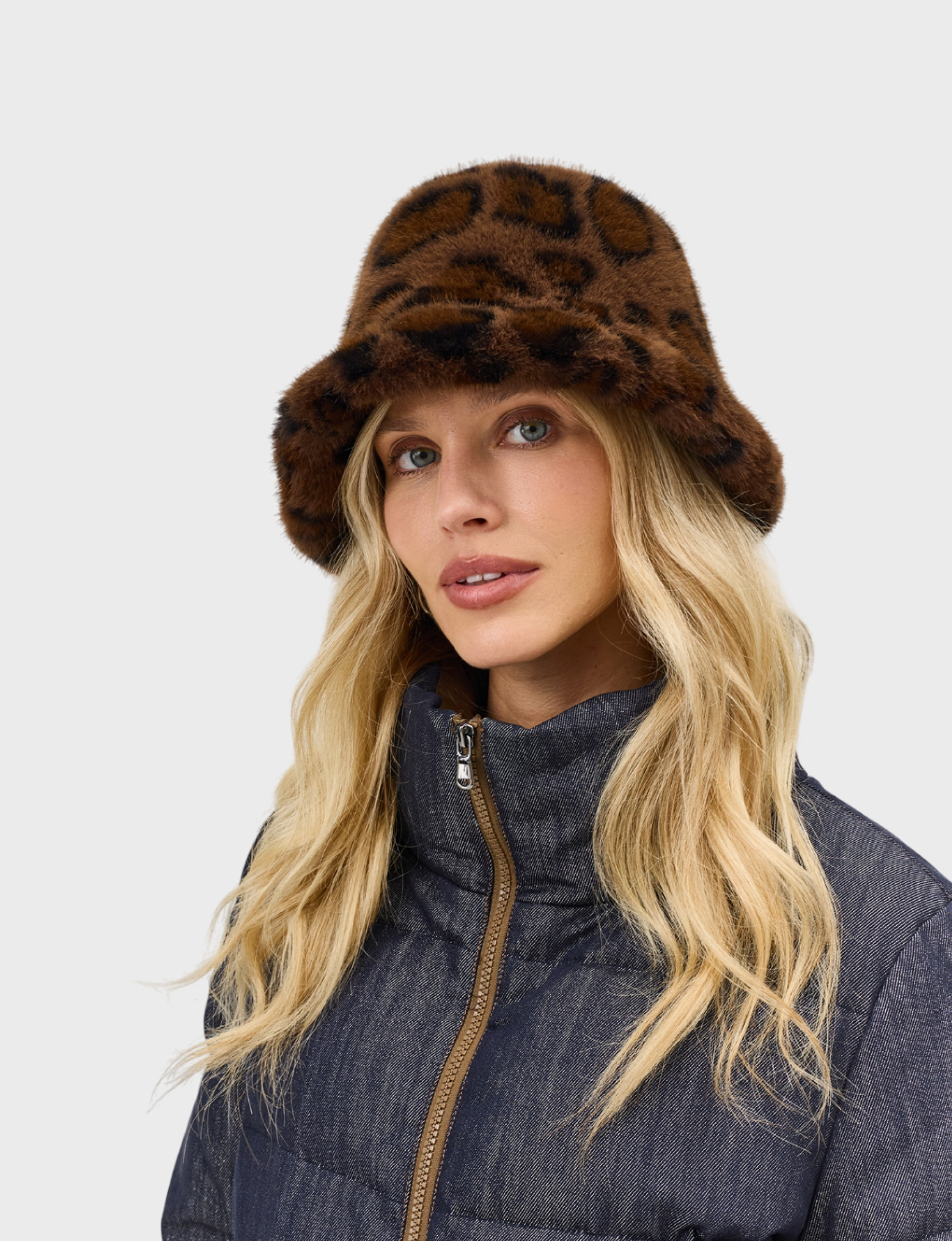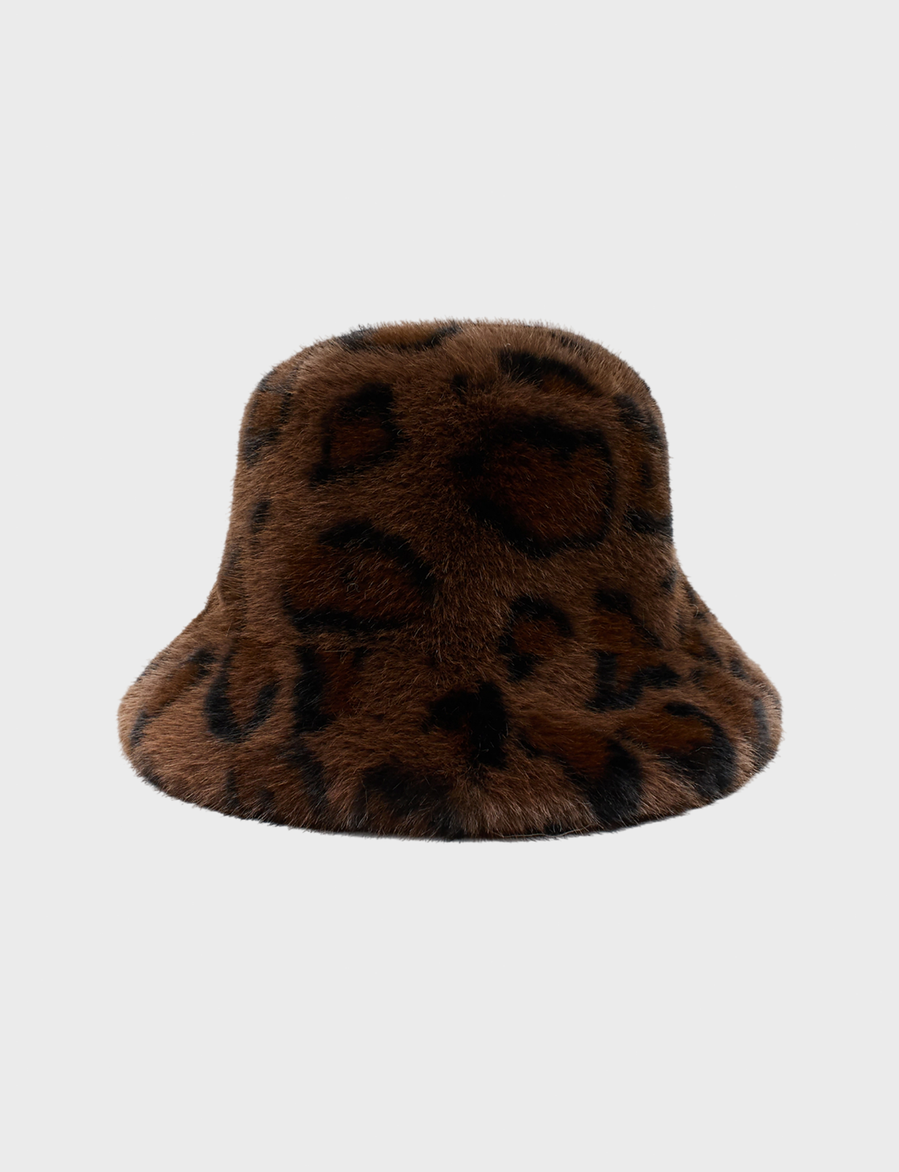 Меховая шляпа с анималистичным принтом. Риб по внутренней стороне для лучшей фиксации и регулировки размера. Дополнена узкими полями.