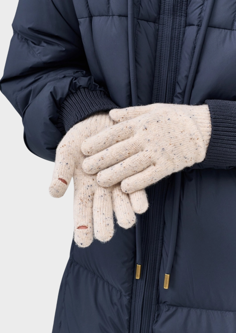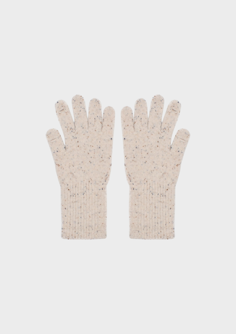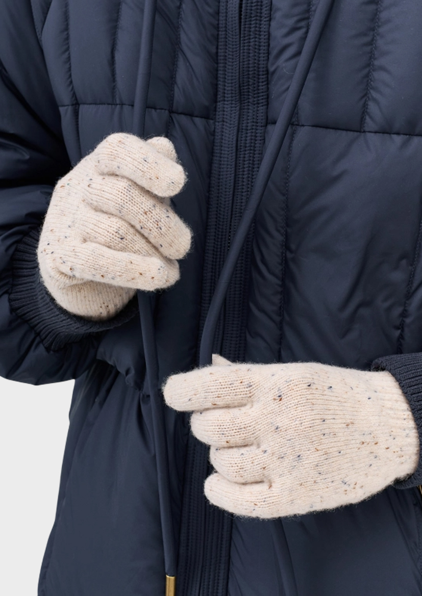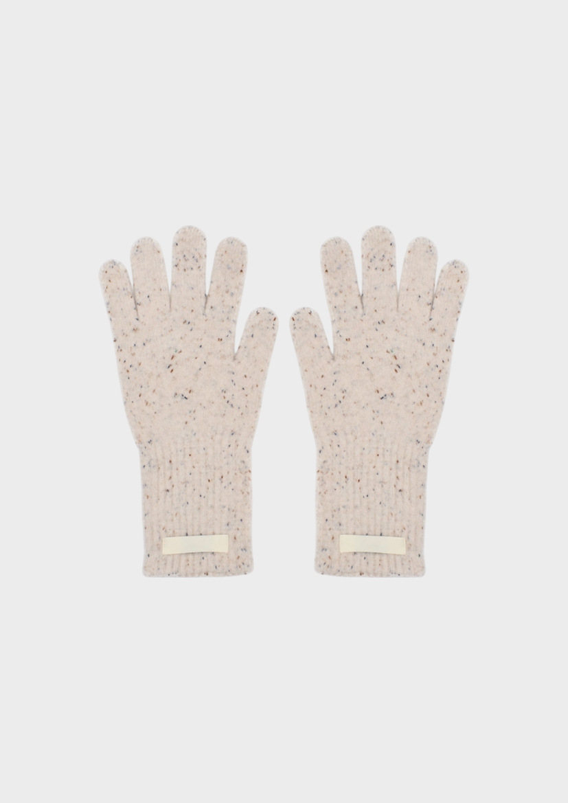Вязаные перчатки из 10% меланжевой шерсти. Плотно держатся на запястье благодаря резинке. Украшены текстильными патчами.