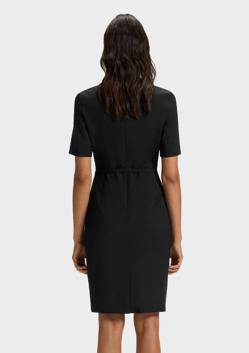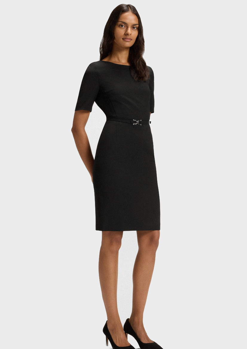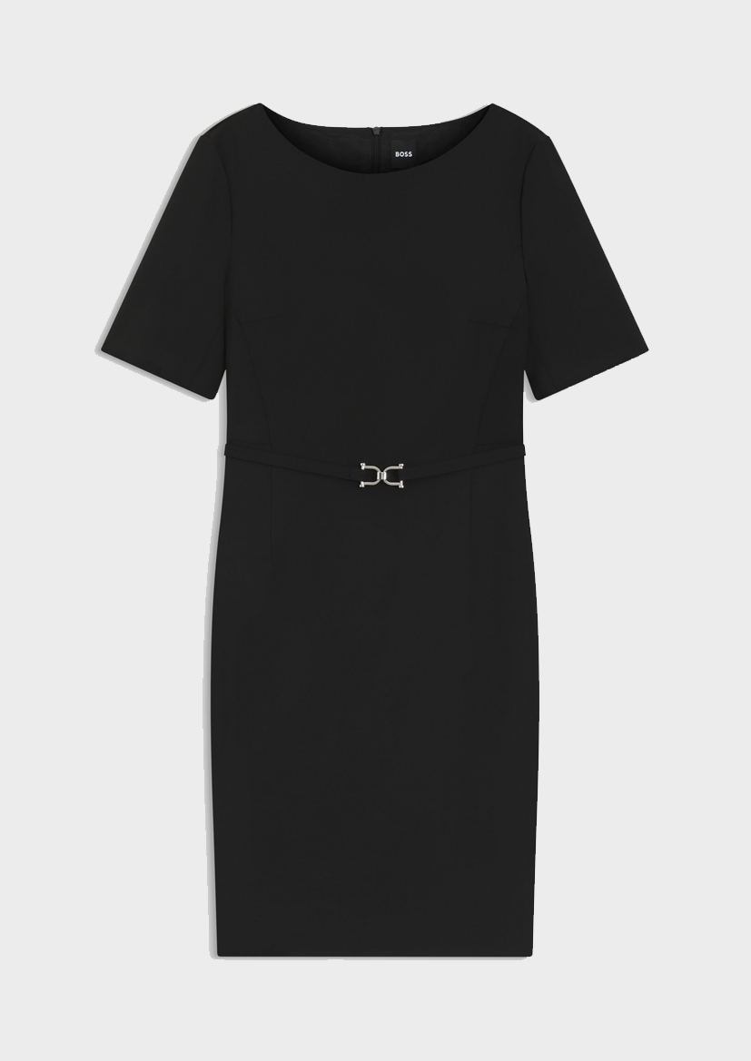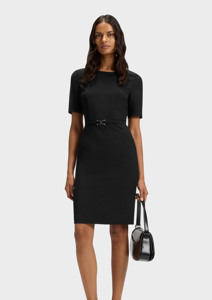 Это женское платье от BOSS, выполненное из натуральной эластичной шерсти, обеспечивающей комфорт в течение всего года, - неподвластная времени классика. Пояс, стягивающий талию, с красивой фурнитурой.