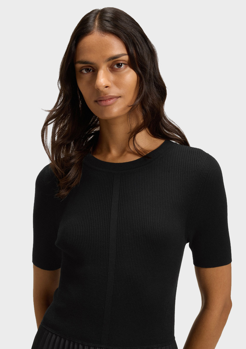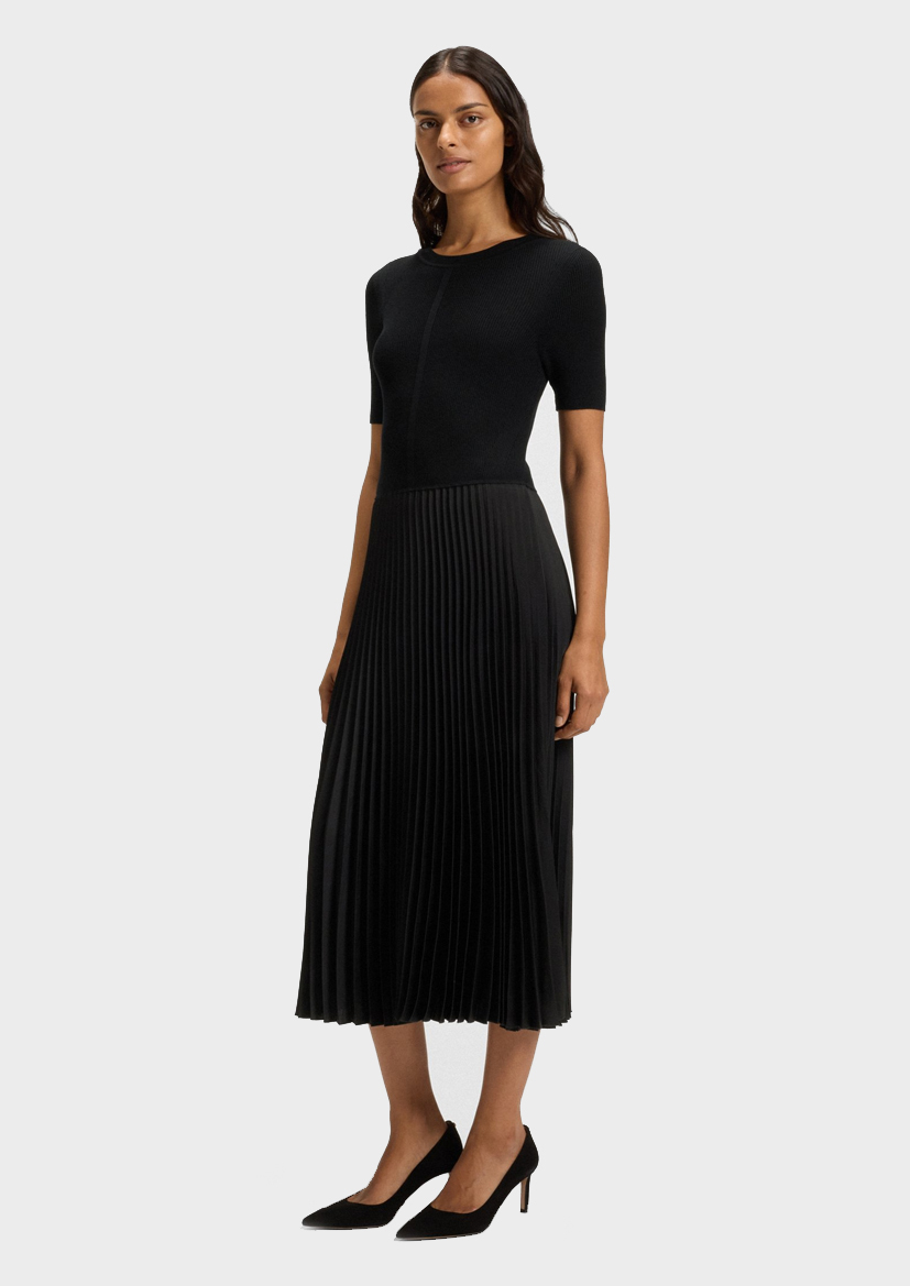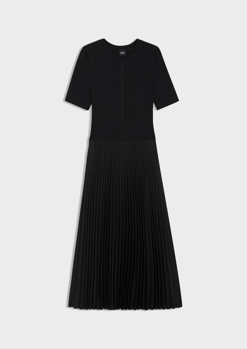 Облегающее платье от BOSS. Это неподвластное времени изделие состоит из трикотажного лифа с короткими рукавами и свободной юбки, собранной в складки из плиссе.