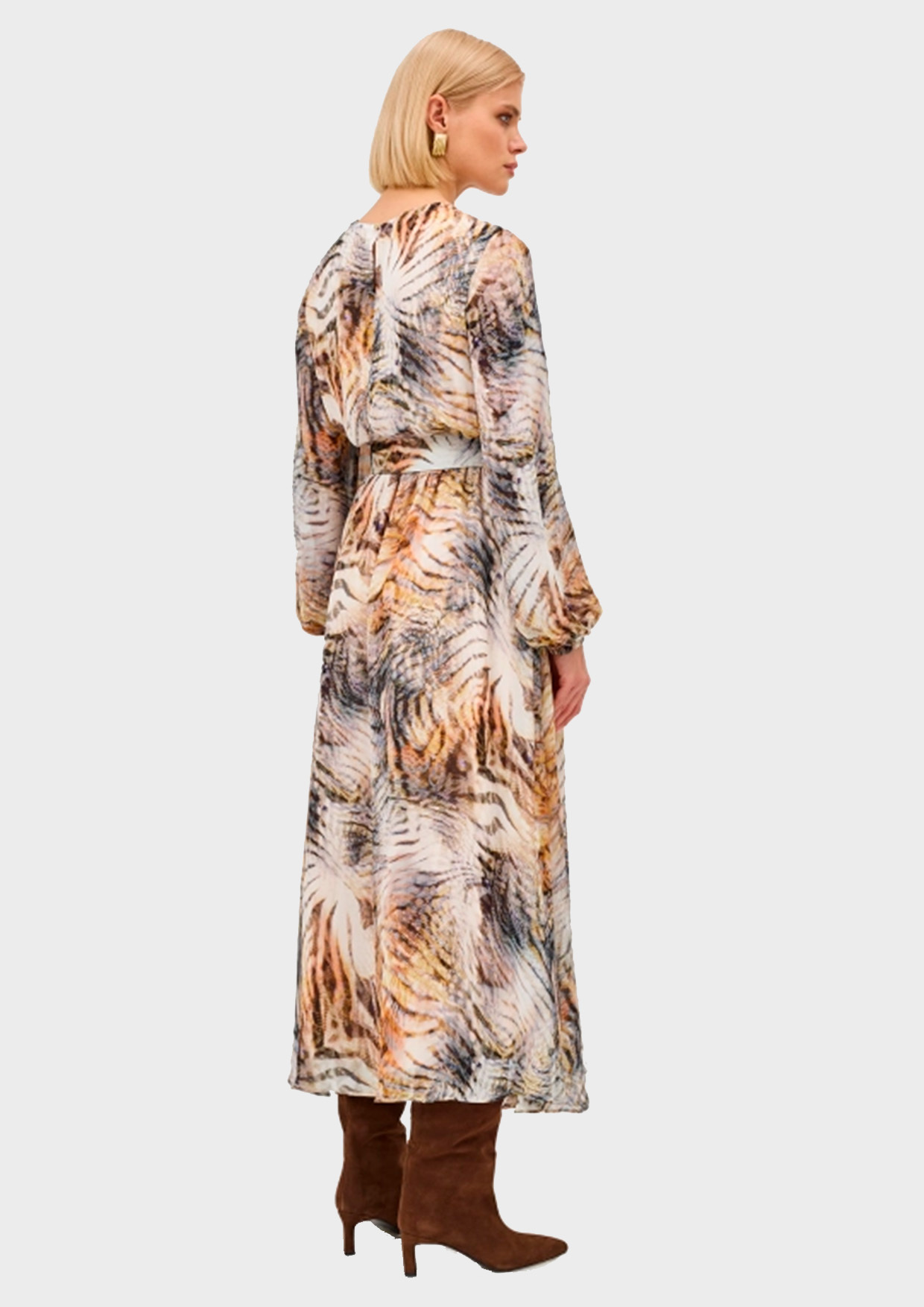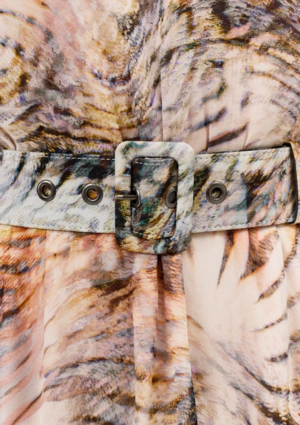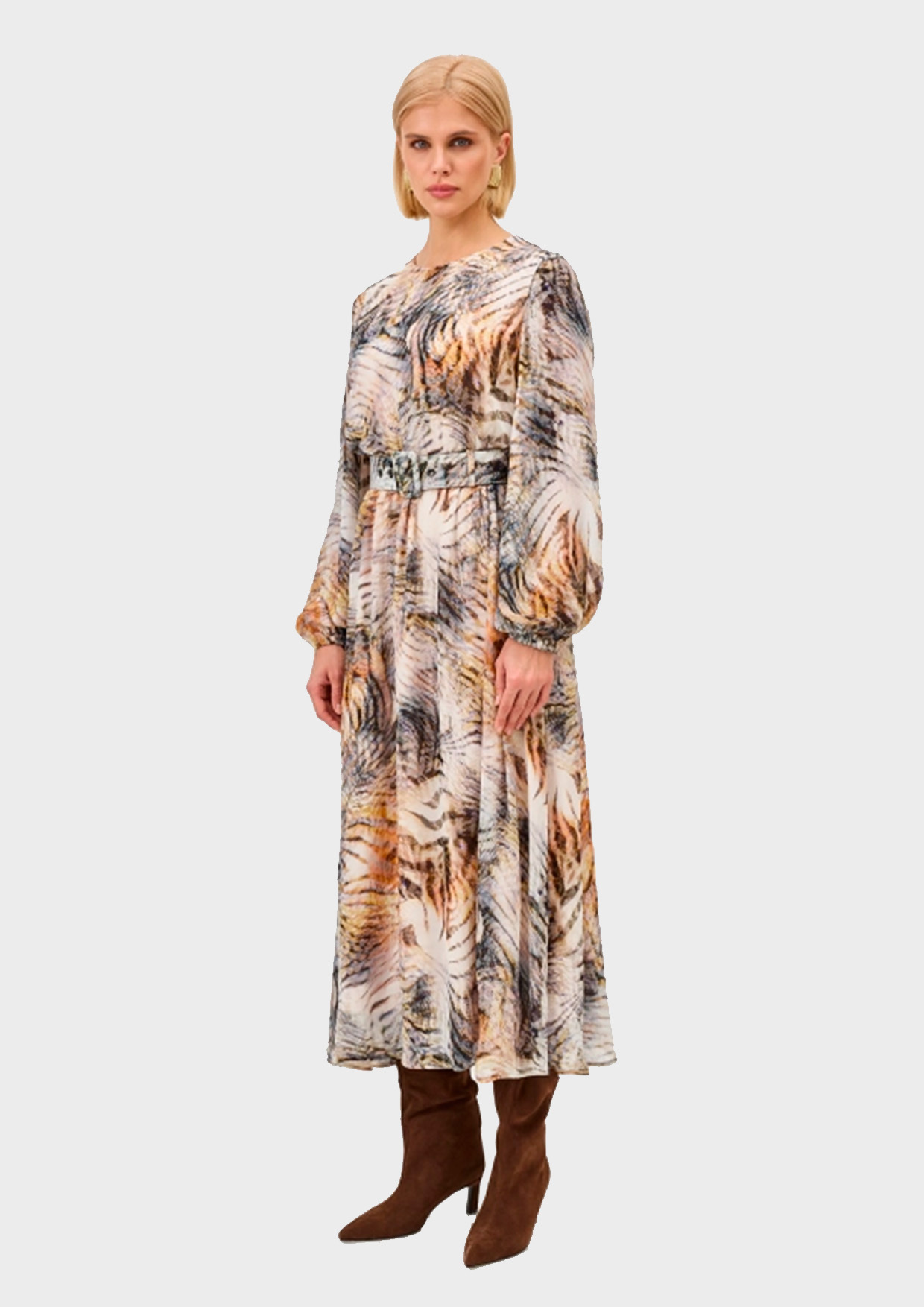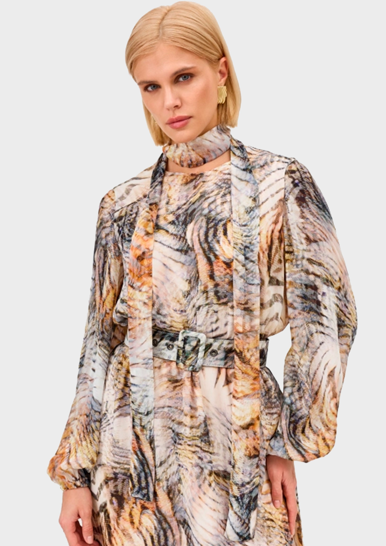 Романтичное платье из натурального шифона с анималистичным принтом. Длина миди. Приталенный силуэт. Эластичная тесьма по линии талии. Круглый вырез с текстильным галстуком-шарфом. Резинка по низу рукавов. Текстильный пояс в цвет в комплекте.