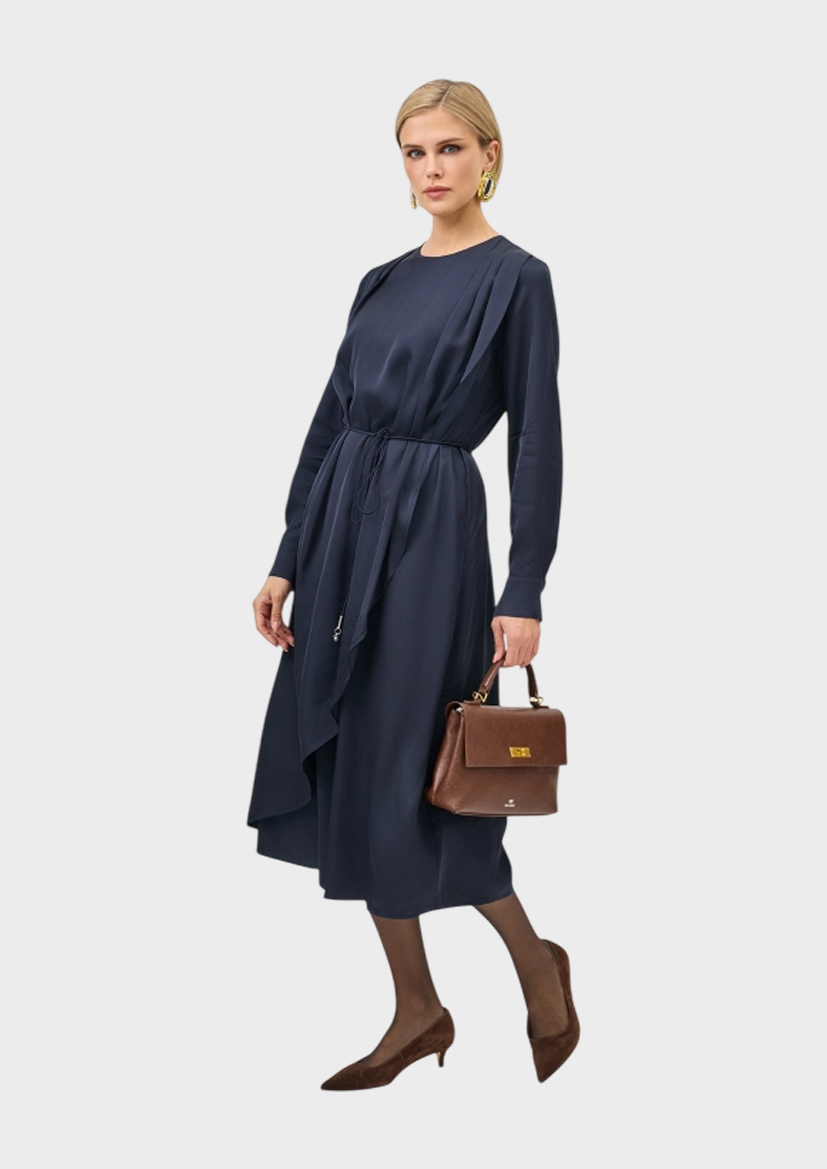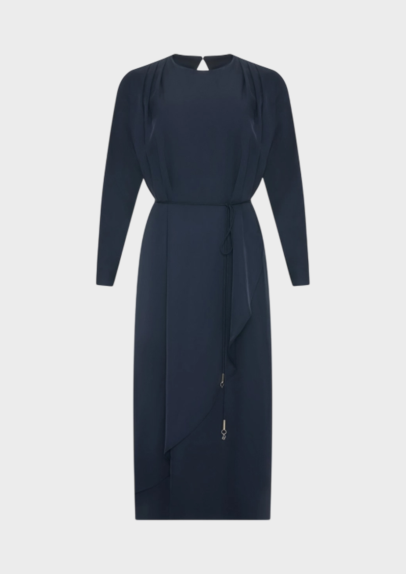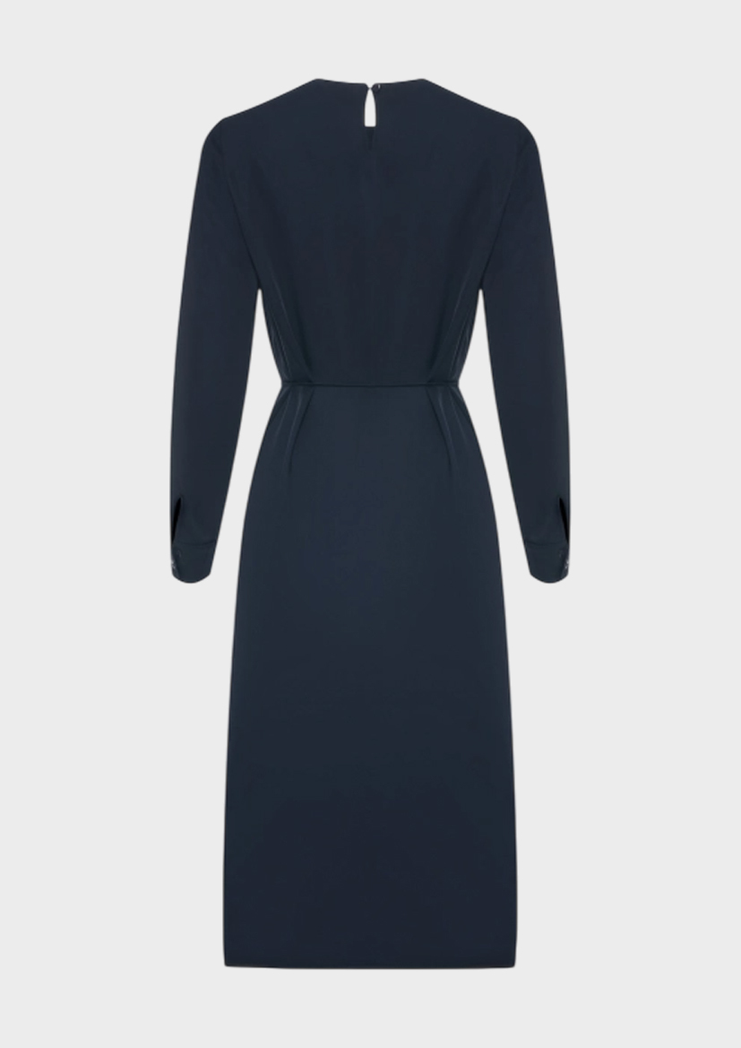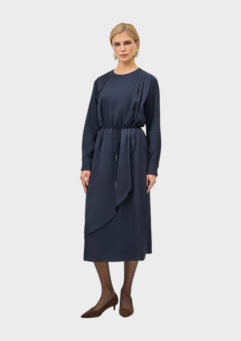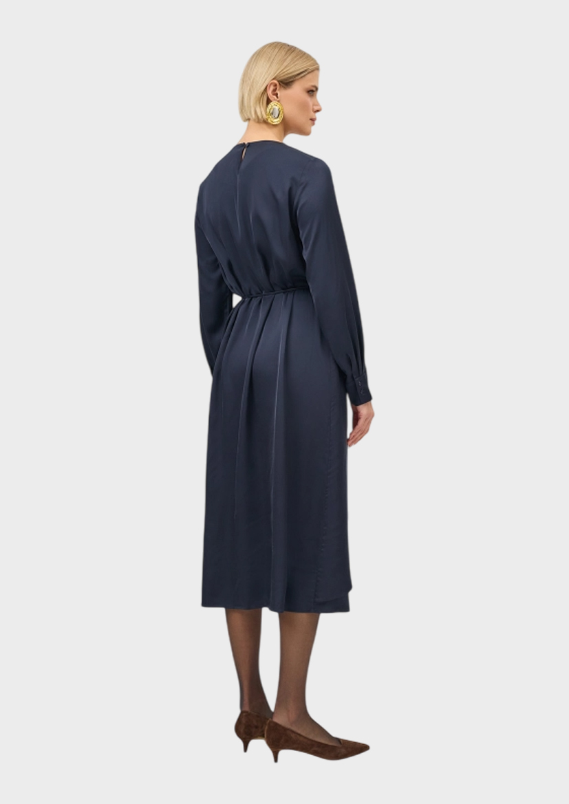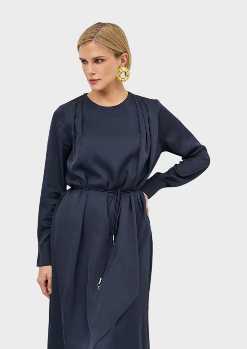 Платье-миди с изысканной драпировкой. Свободный силуэт можно приталить тонким поясом с металлическим декором. Круглый вырез. Застежка на молнию и маленькую пуговицу. Манжеты на пуговицах по низу рукавов. В составе 100% вискоза