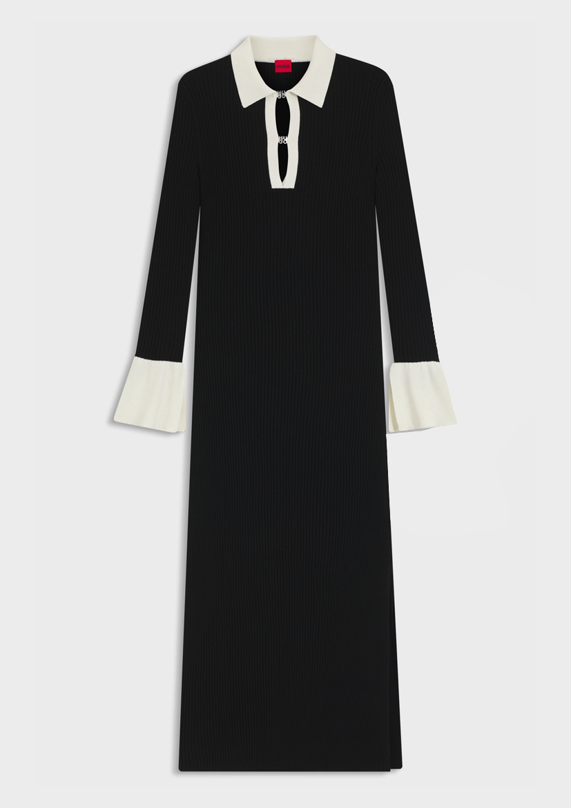 Это трикотажное женское платье от HUGO с облегающим кроем в рубчик и объемными манжетами создает эффектный образ. Планка с замочным вырезом украшена накладными логотипами. Этот продукт изготовлен из целлюлозных волокон, полученных из натурального древесного сырья, выращиваемого в лесах с ответственным управлением. Мы сотрудничаем с внешними организациями, чтобы обеспечить бережное отношение к девственным лесам, находящимся под угрозой исчезновения.