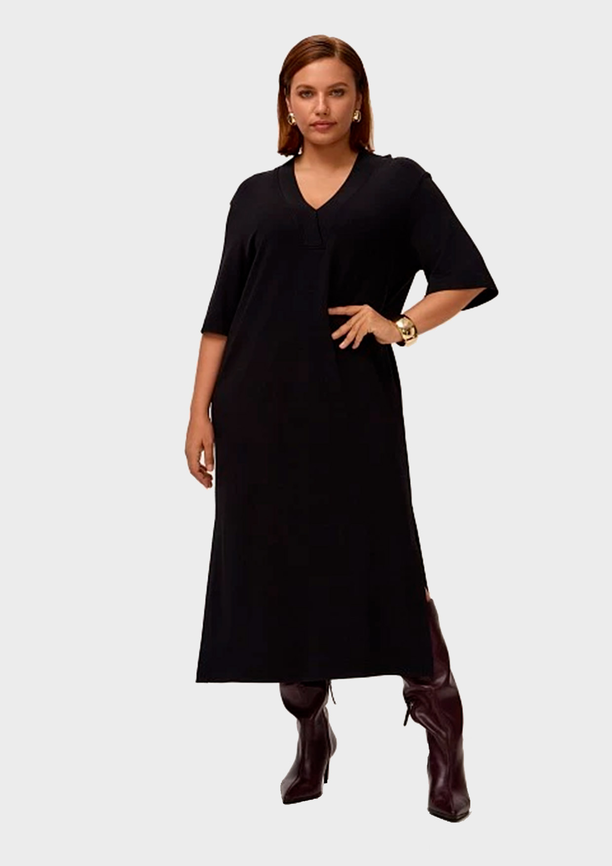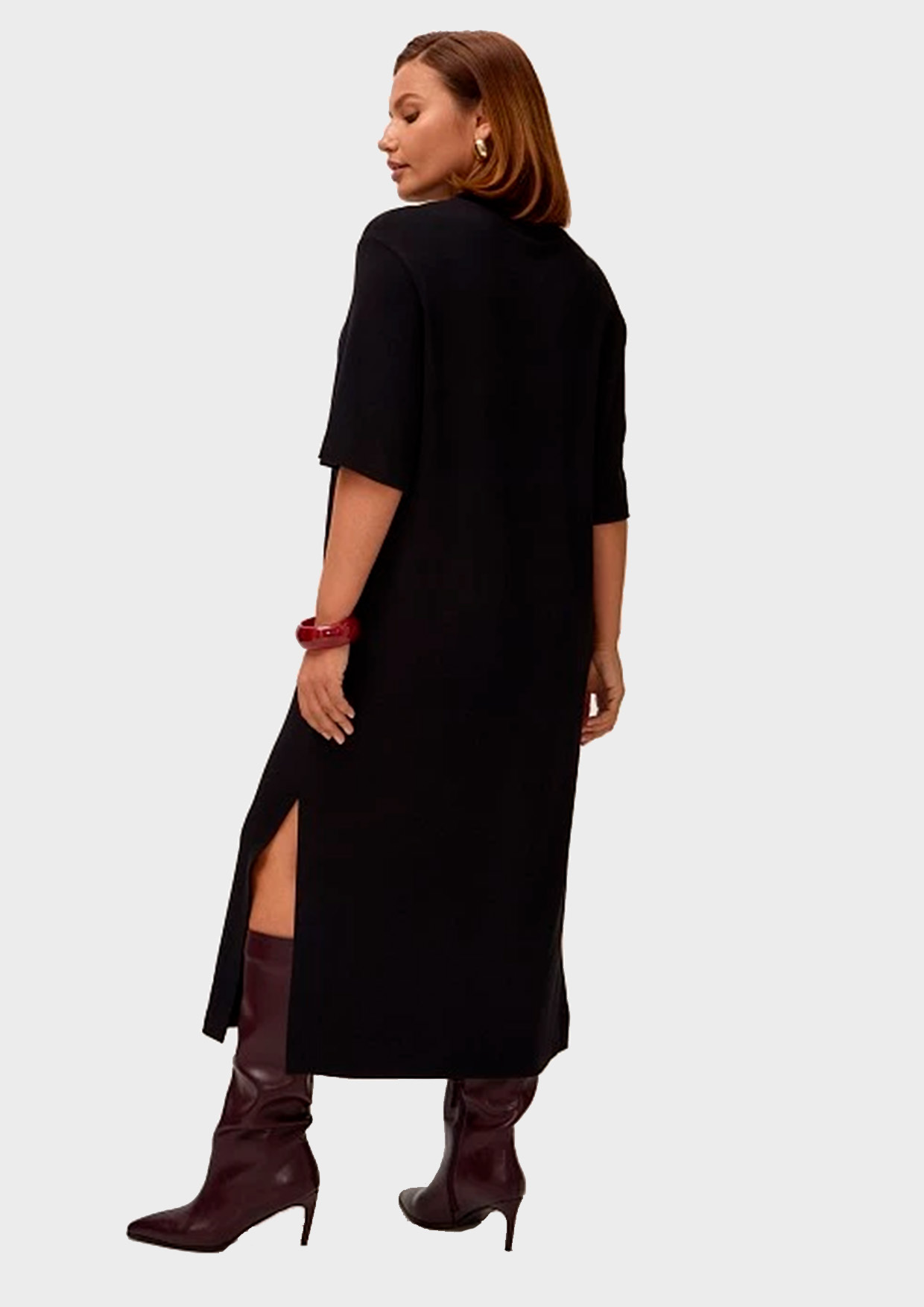 Платье прямолинейного силуэта с глубоким V-образным вырезом подчеркивает изящество линий, визуально вытягивая шею и делая образ одновременно строгим и чувственным, в то время как небольшие боковые разрезы добавляют ноту легкости и свободы движений, раскрывая изящество ног при ходьбе.