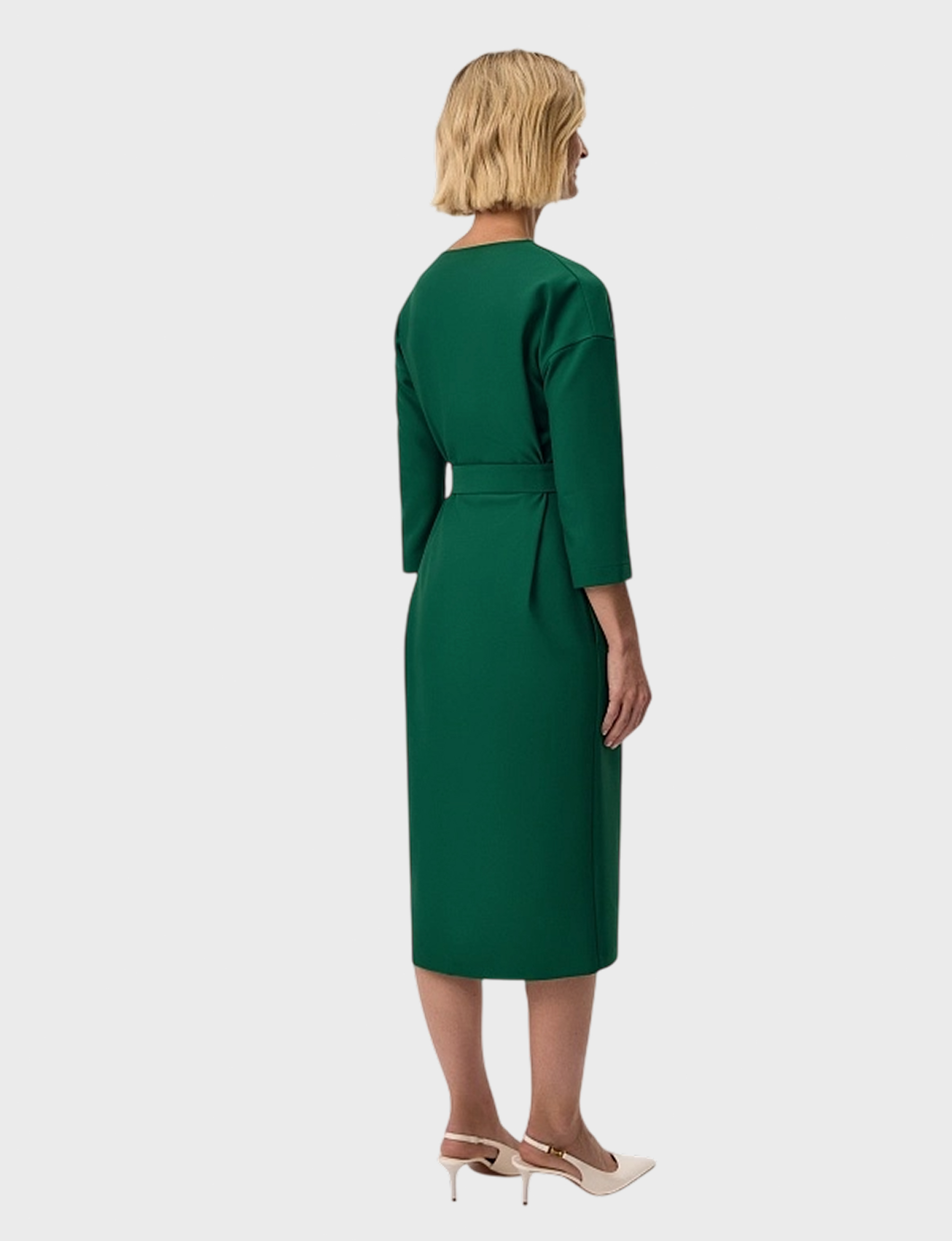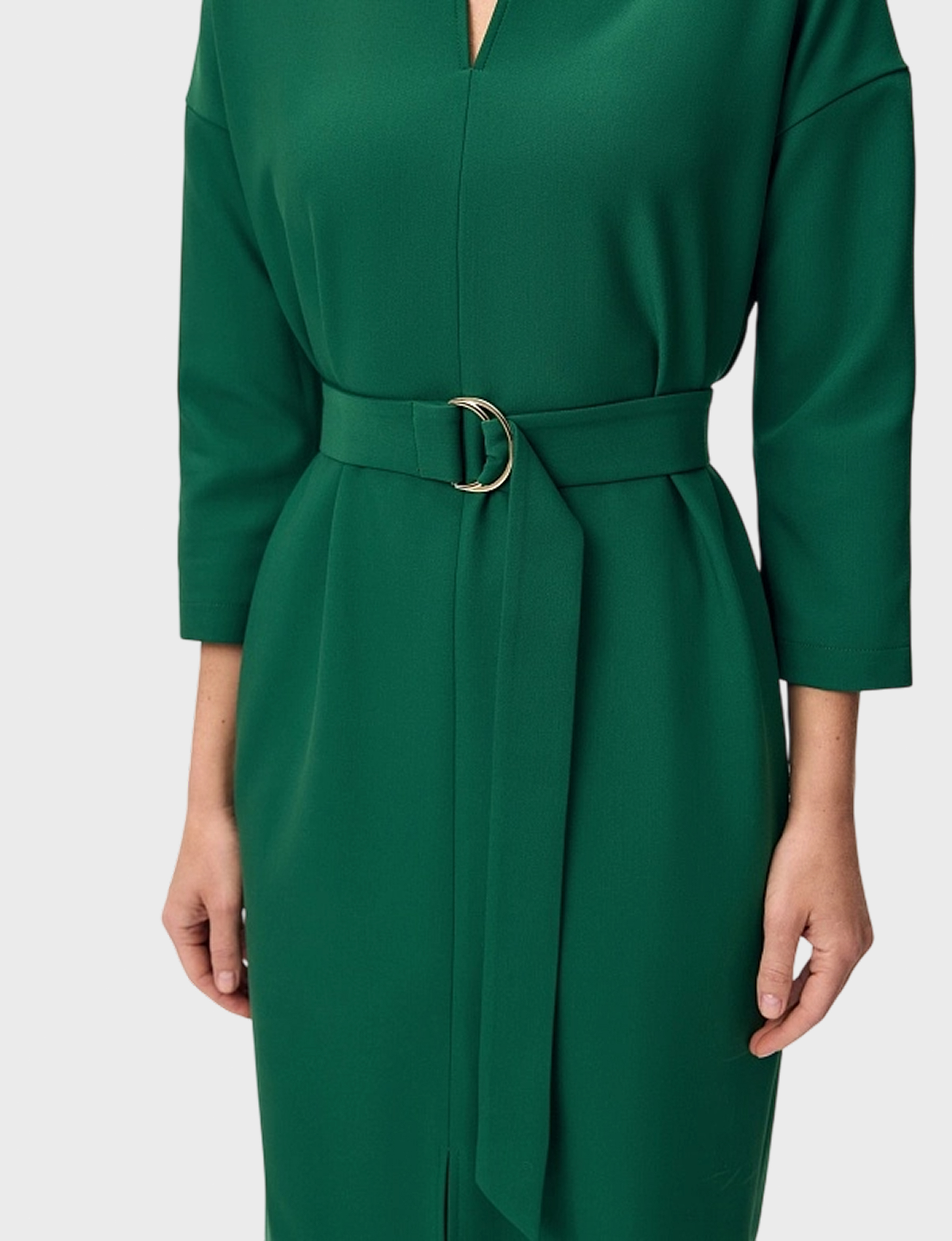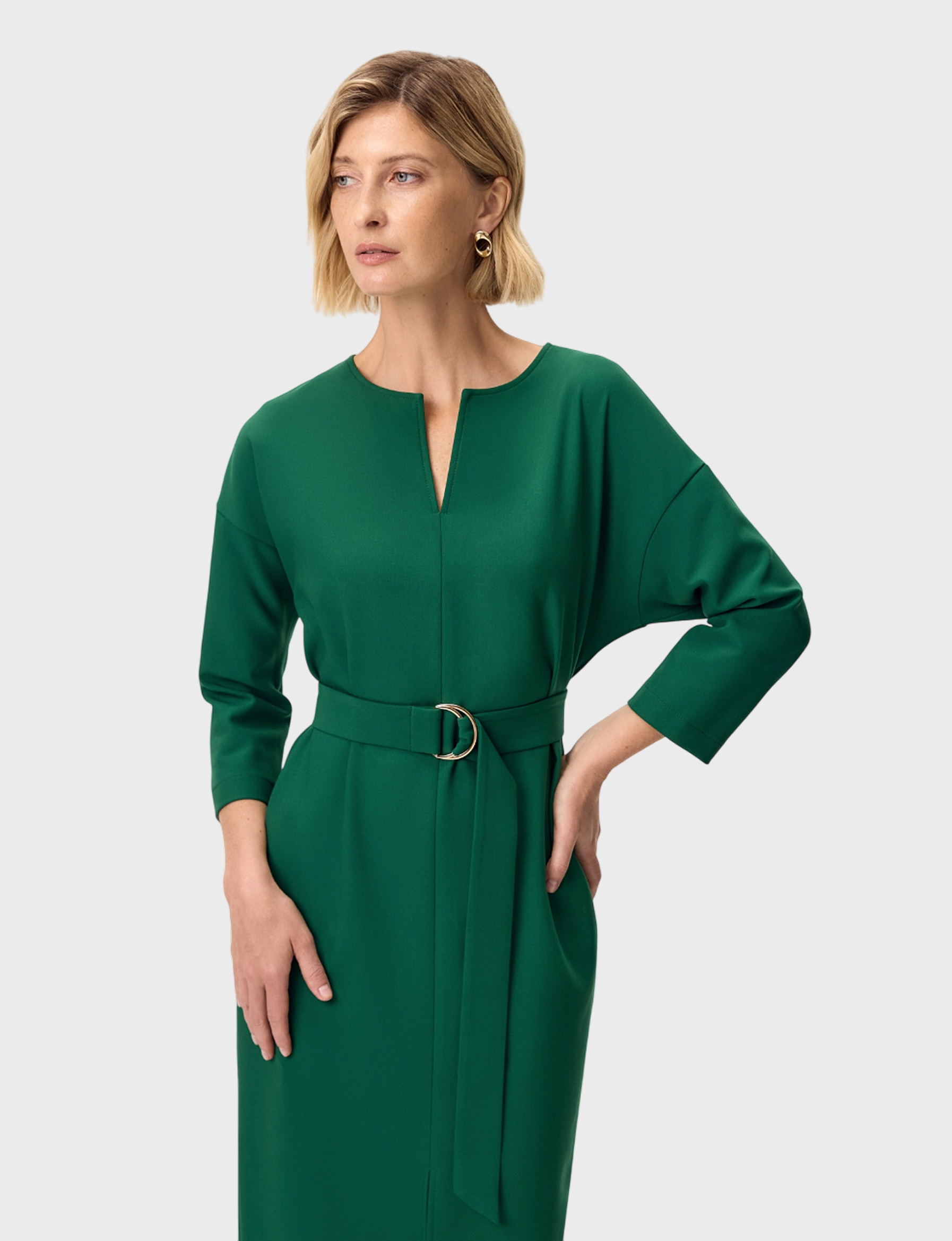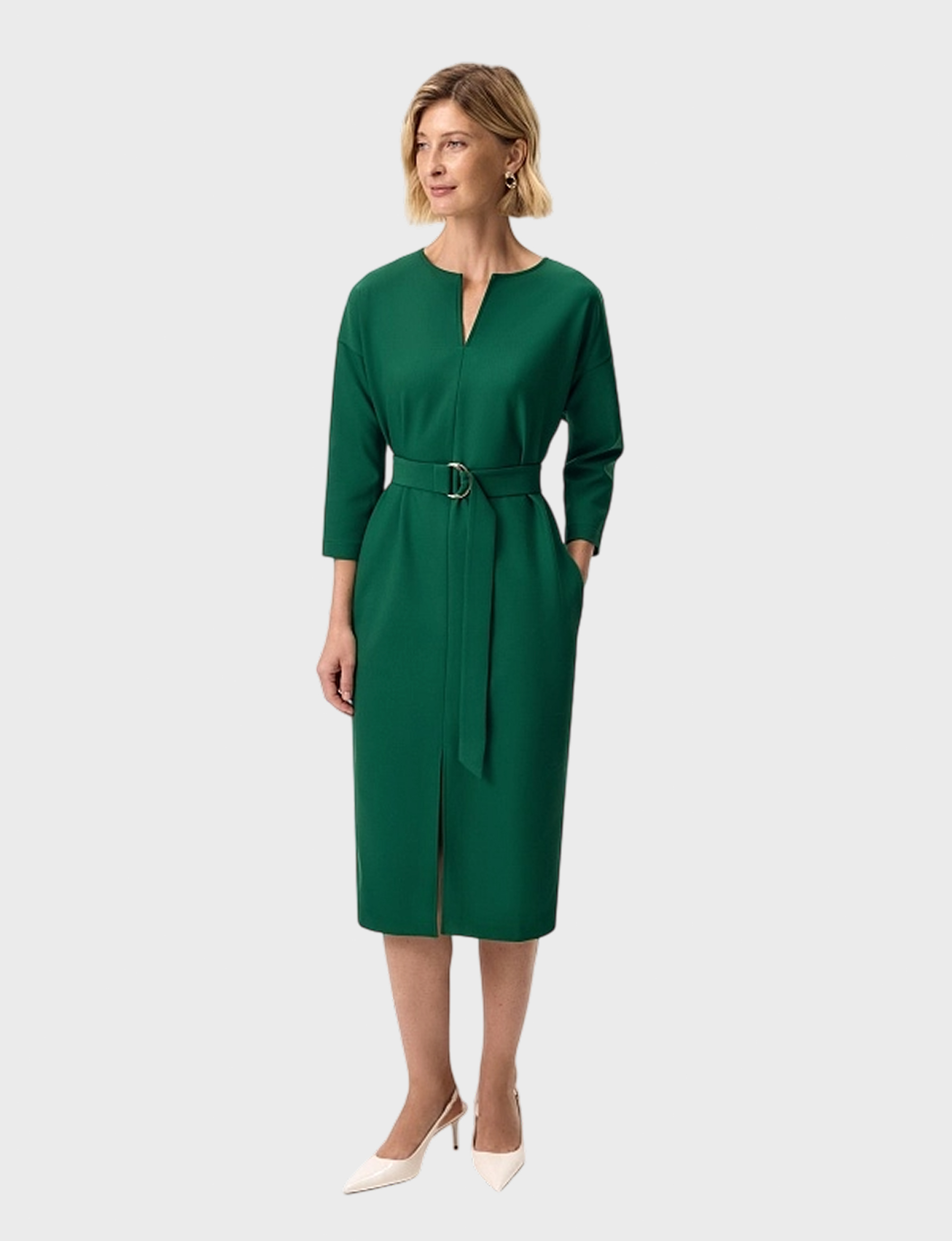 Прямое платье со спущенной линией плеча и рукавом 7/8 с круглой горловиной и небольшим вырезом по переду, в боковых швах потайные карманы. По переду есть разрез для комфортной носки изделия. В комплект входит пояс из основной ткани с полукольцами.